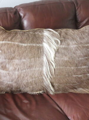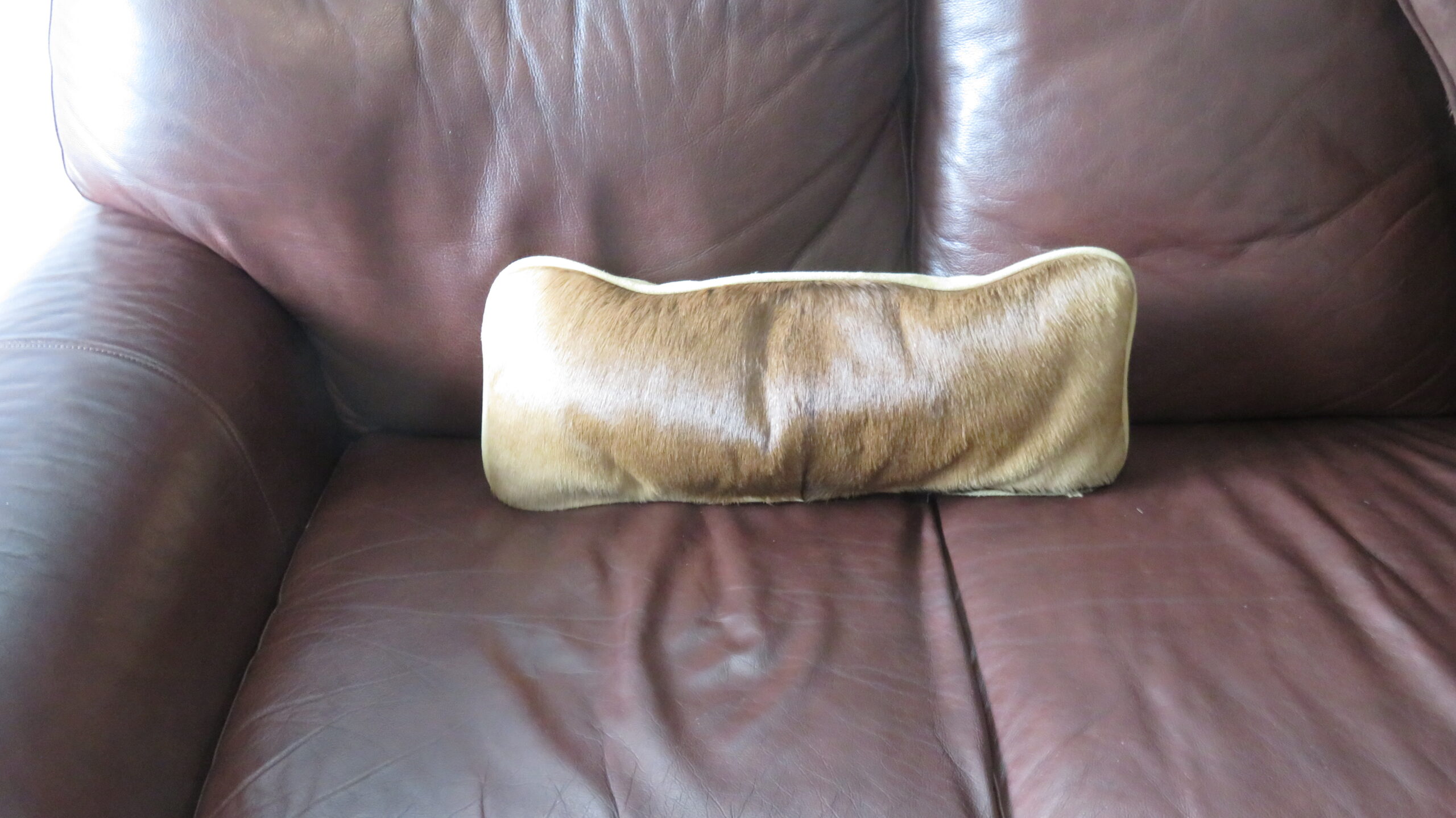 Here we have a beautiful African item made from an Impala tanned skin (or hide). A rectangular pillow that measures approximately 20″ in length and 8″ in depth. It has a soft leather backing that is a tan color.