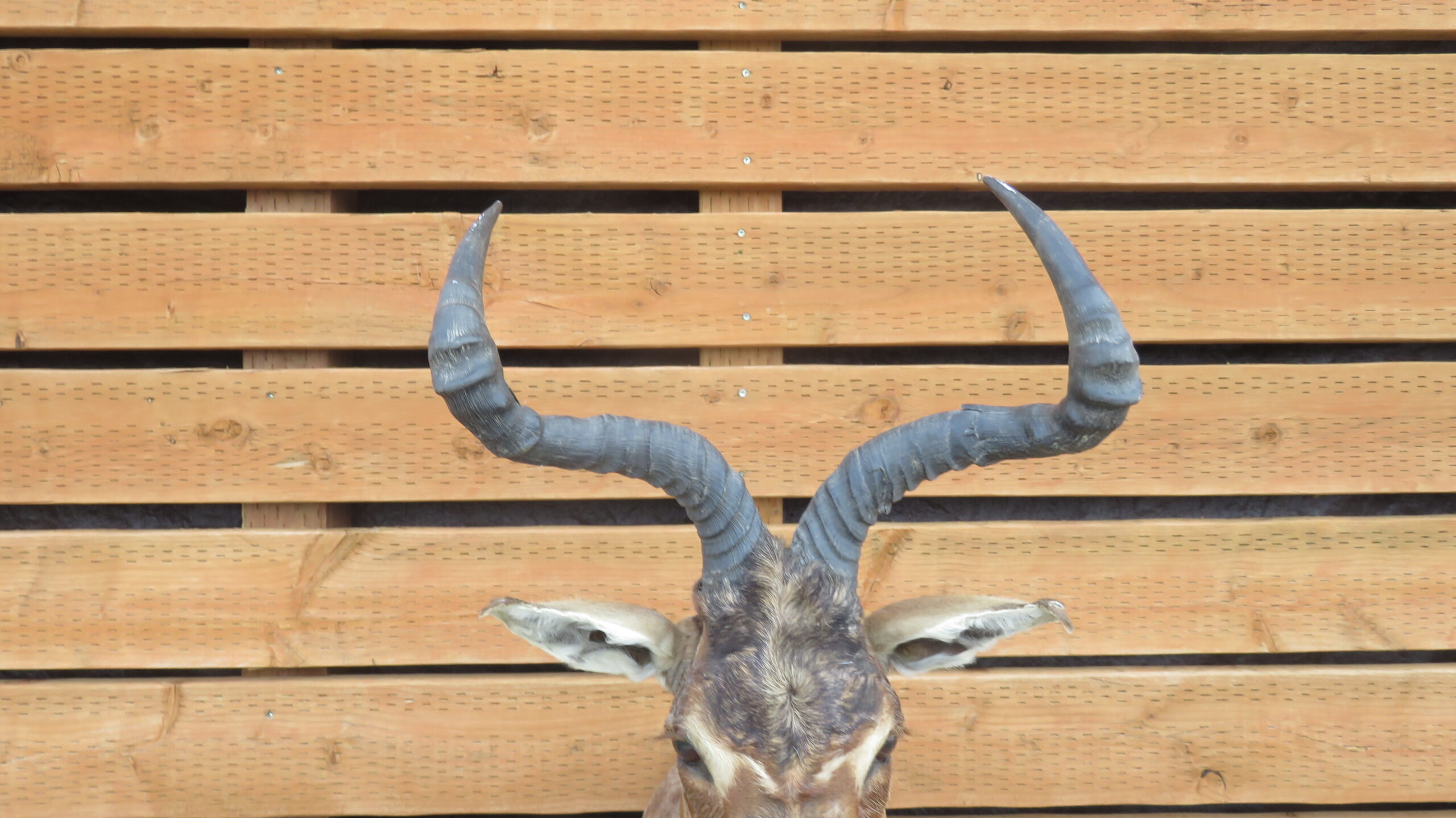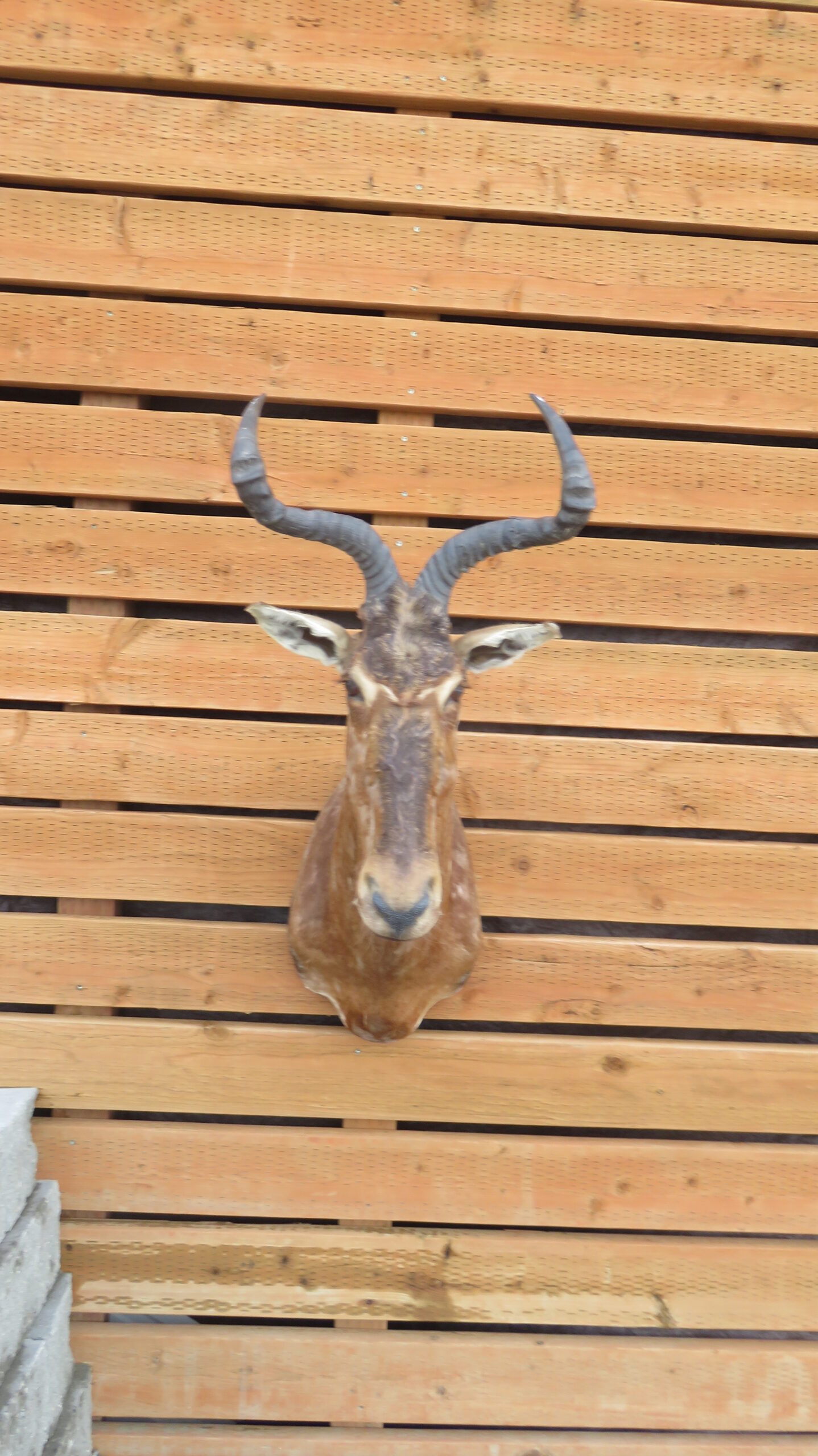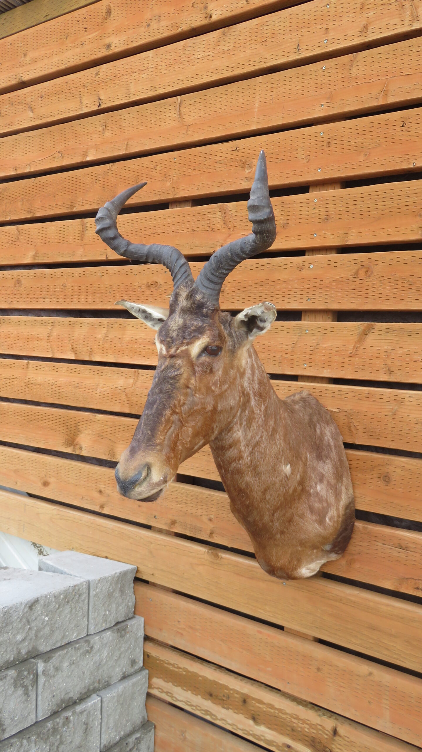 Overall mount size is roughly 36″ tall/high, 17″ wide and 26″ deep (wall to nose). Horns measure over 18 inches on each side. This item hangs on a single, well-secured fastener with the installed bracket. Buy this taxidermy for the lodge, office or man-cave. Display with a collection of African heads or use as a conversation piece alone.