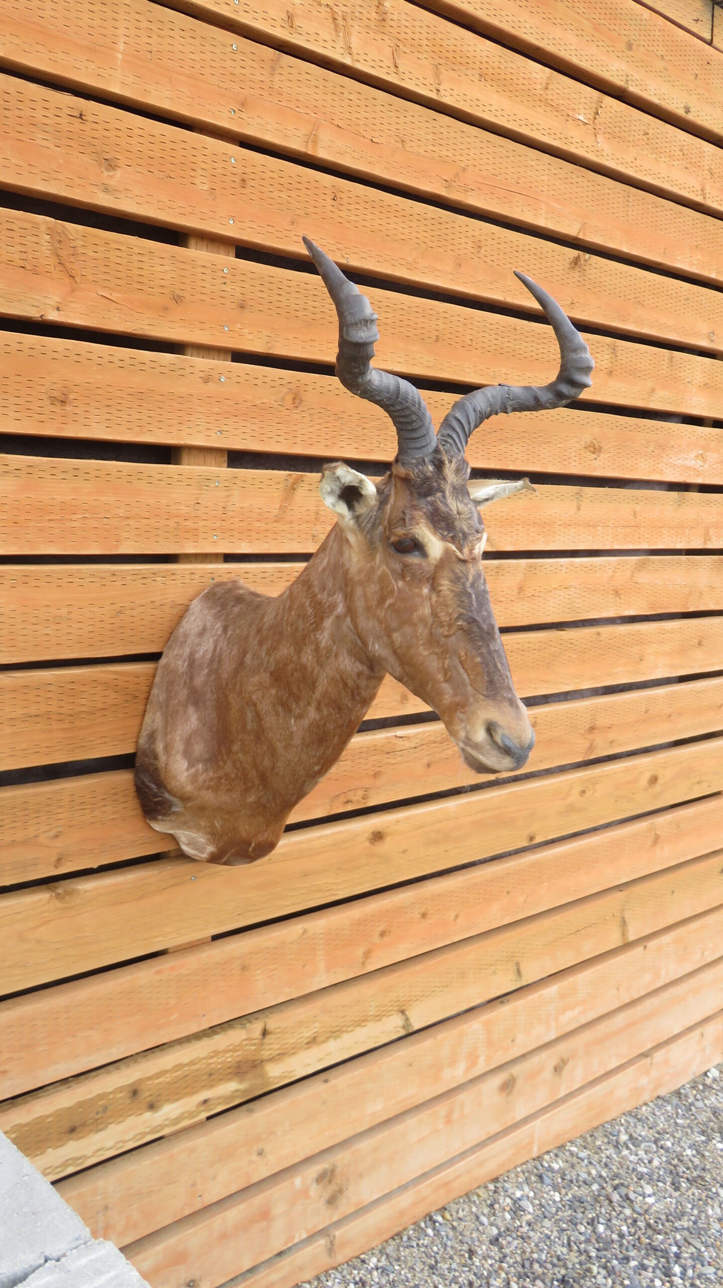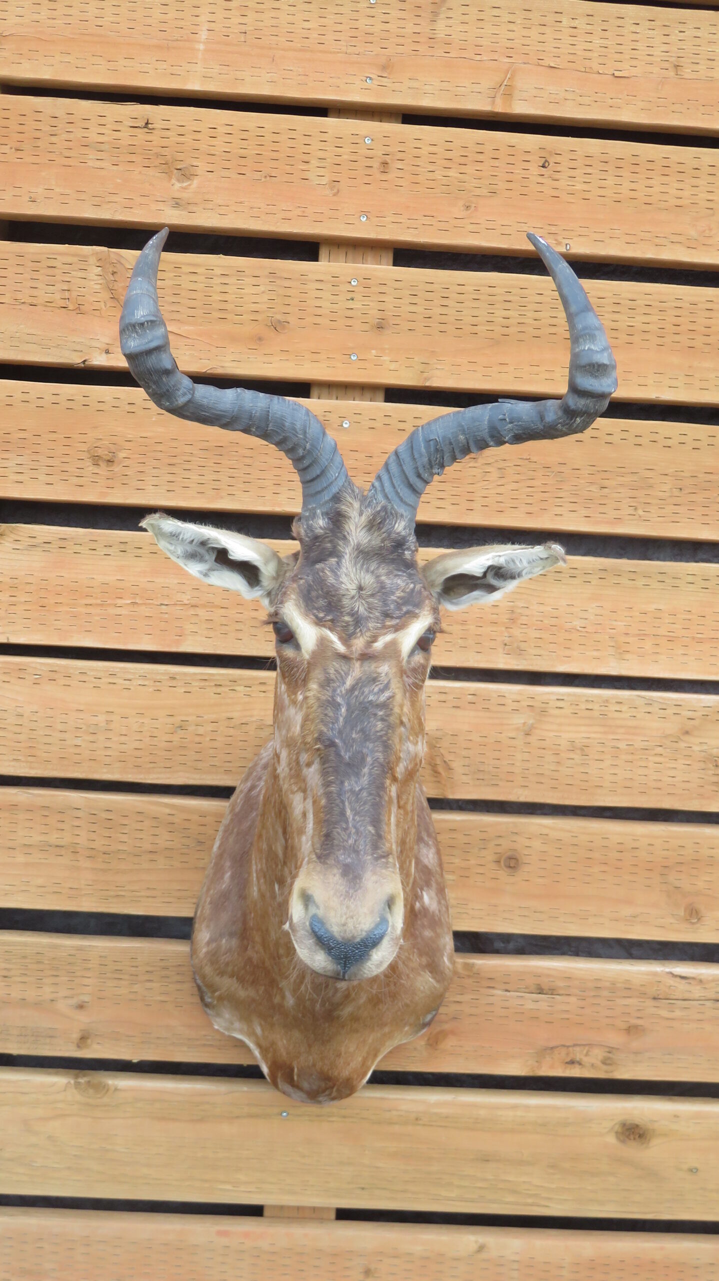 This is a great looking Red Hartebeest taxidermy mount. To start with it has the classic head up, looking forward pose. The color and coat are great with a deep red color. This bull has a nice set of horns with a wide spread for the species measuring 16 1/2″ wide at the outside and almost 13″ (inches) between the tips. Overall this mount achieves our “Excellent” quality rating.