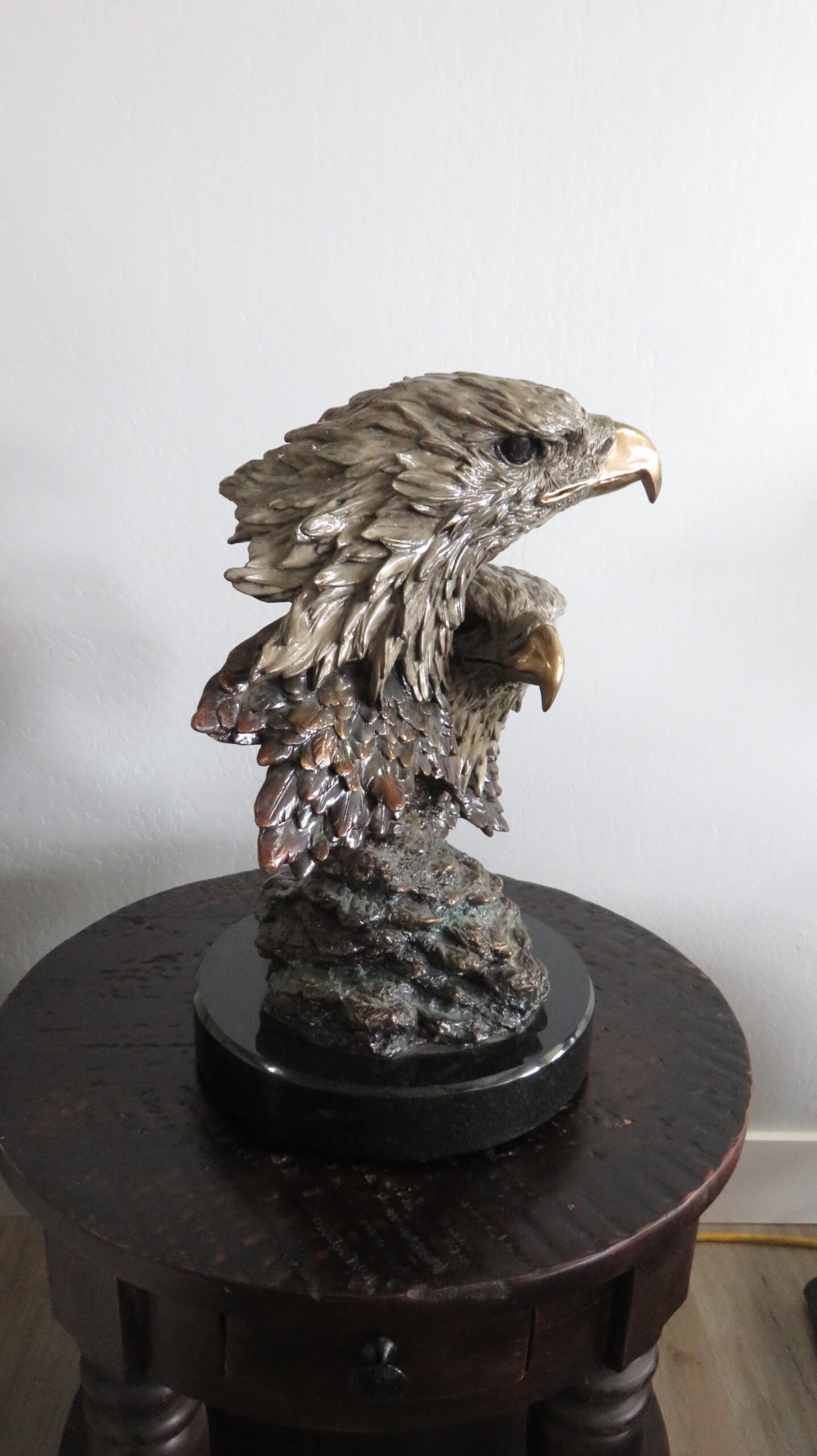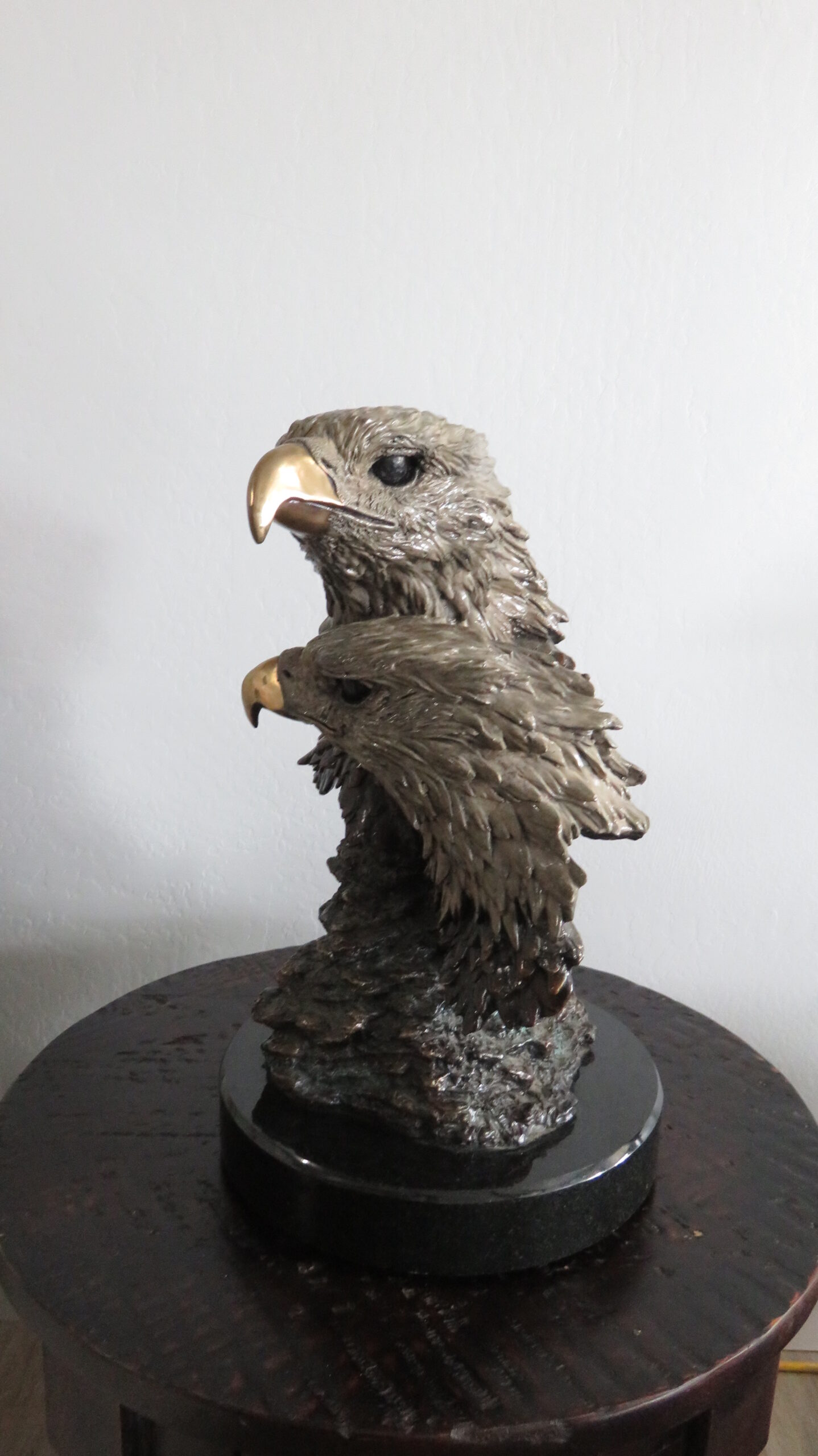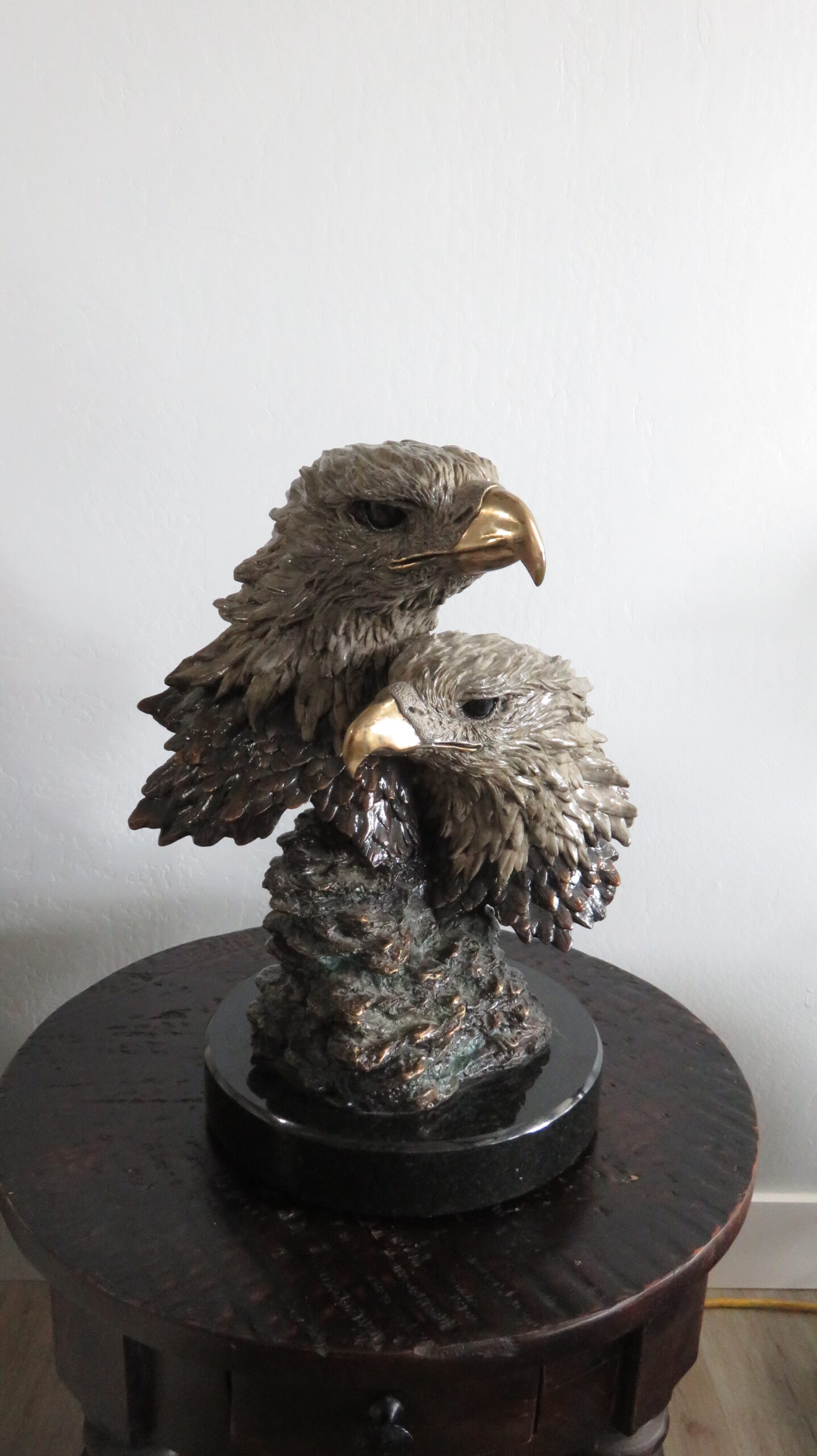 Here we have the most exquisite bronze art item that we have handled to date. It is a work by DeLier done by Foundry Master Charles L. Wambold. The bronze depicts a pair of Eagles in a patinated bronze finish. It has a marble base with an easy glide turn for ease of viewing from many angles. Casting was made with the lost wax method and has fantastic finish and life-like texture. This art item is accompanied by the original Certificate of Authenticity. Suggested retail value for this item was $15,000 at the time of production.