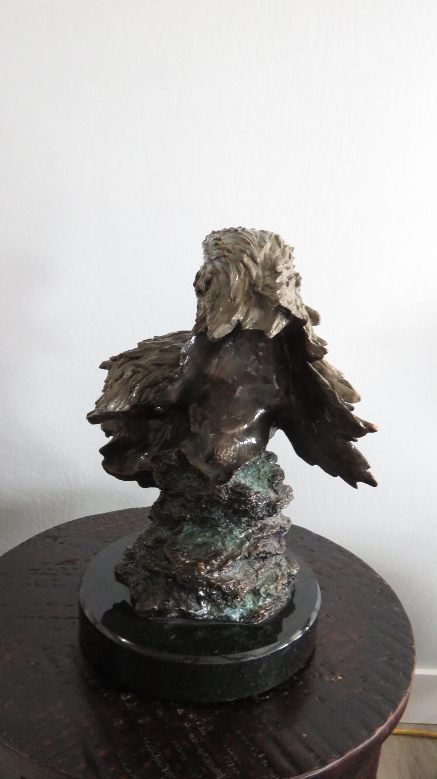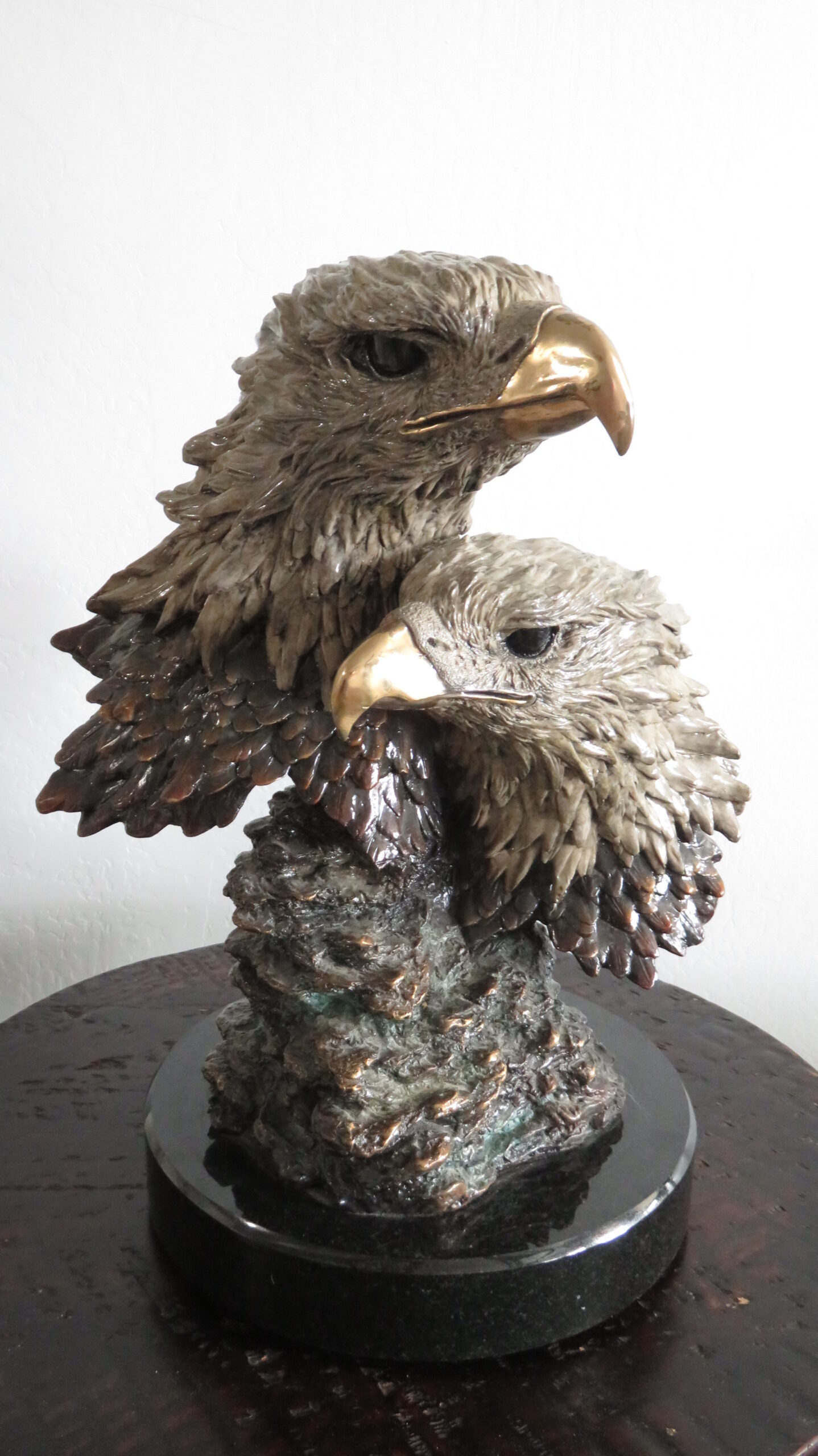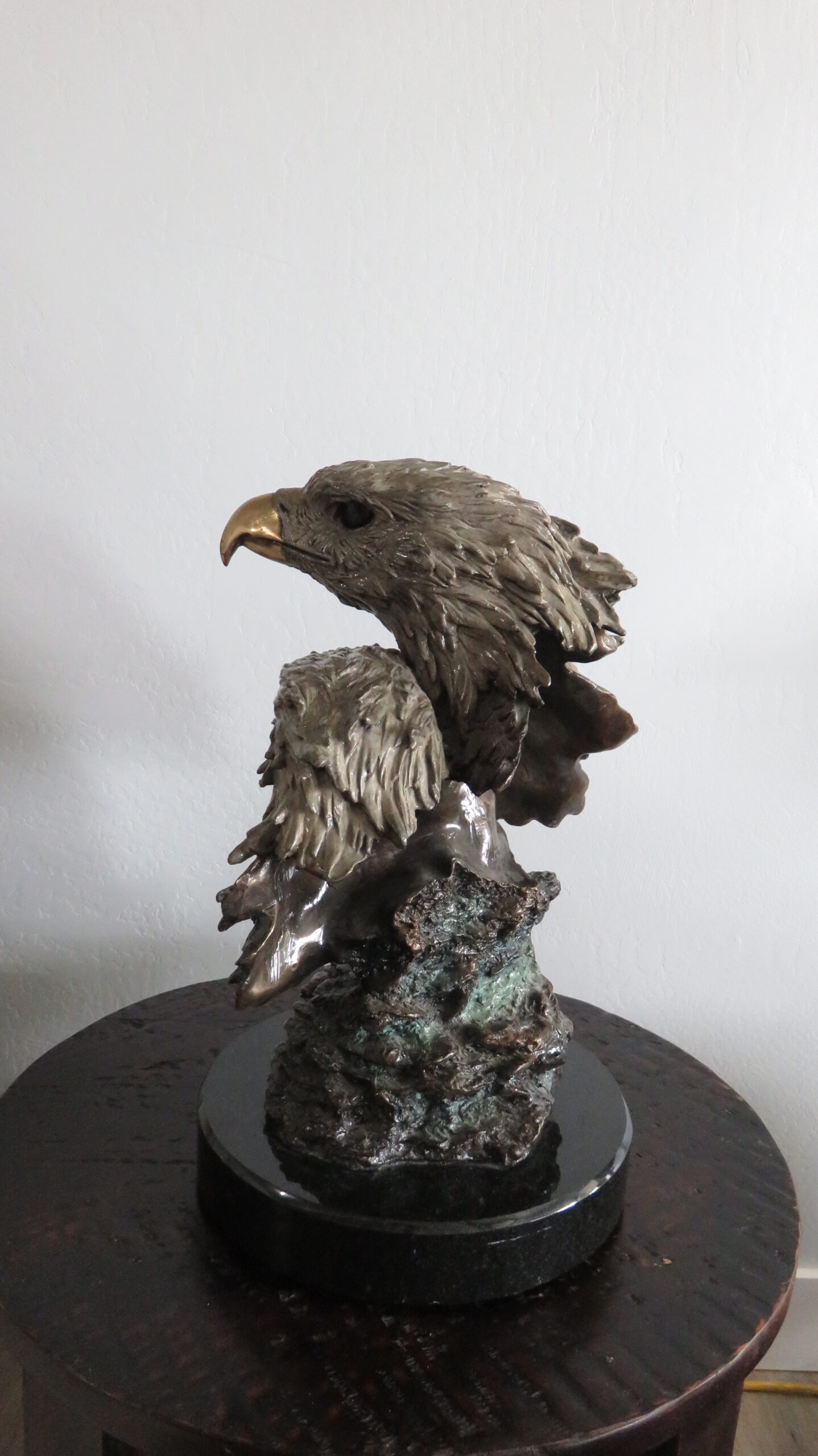Here we have the most exquisite bronze art item that we have handled to date. It is a work by DeLier done by Foundry Master Charles L. Wambold. The bronze depicts a pair of Eagles in a patinated bronze finish. It has a marble base with an easy glide turn for ease of viewing from many angles. Casting was made with the lost wax method and has fantastic finish and life-like texture. This art item is accompanied by the original Certificate of Authenticity. Suggested retail value for this item was $15,000 at the time of production.