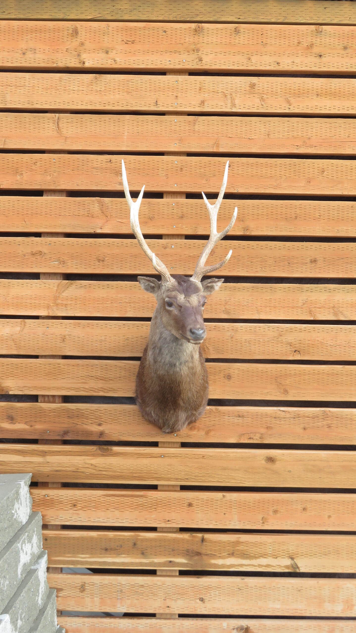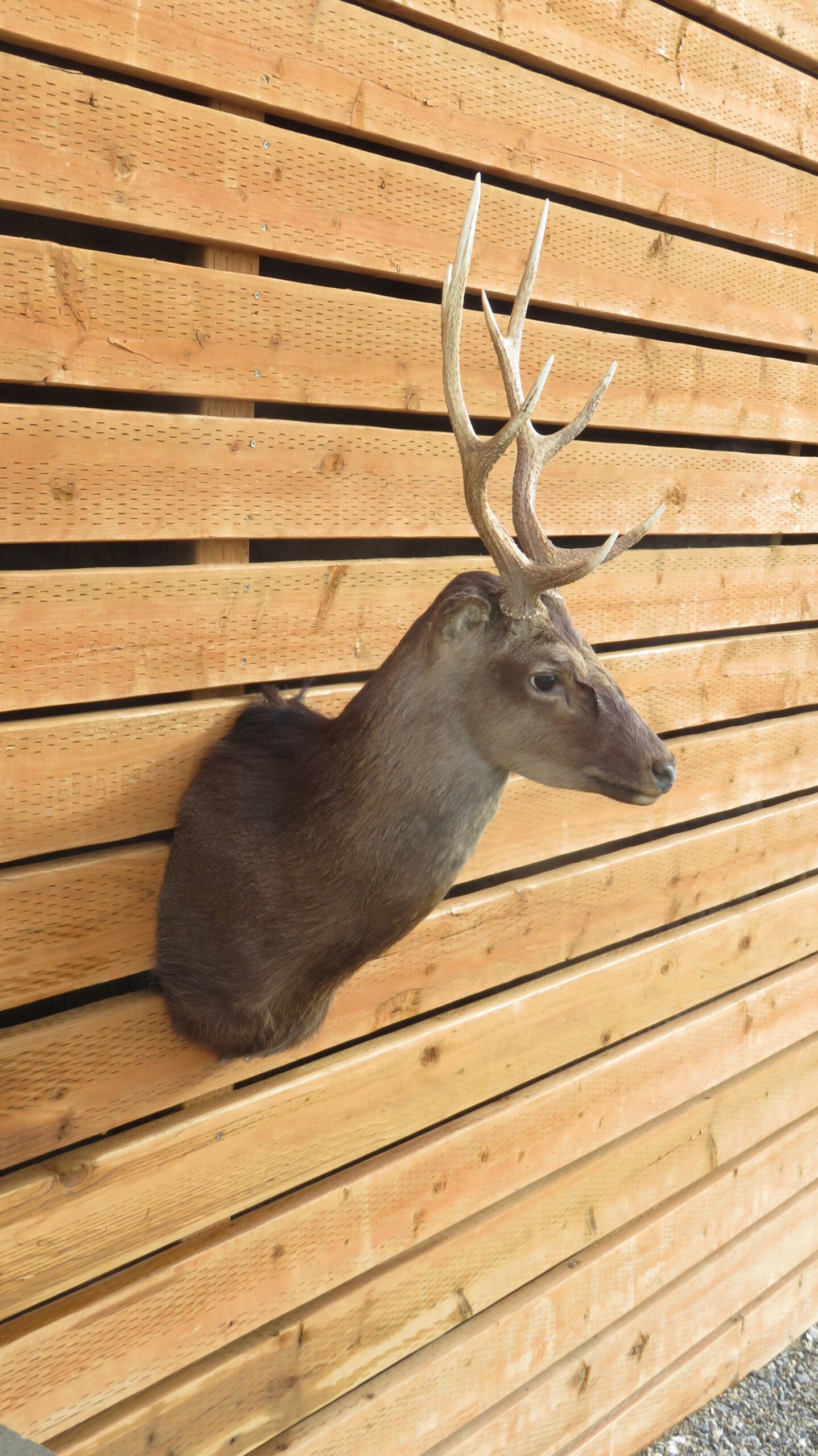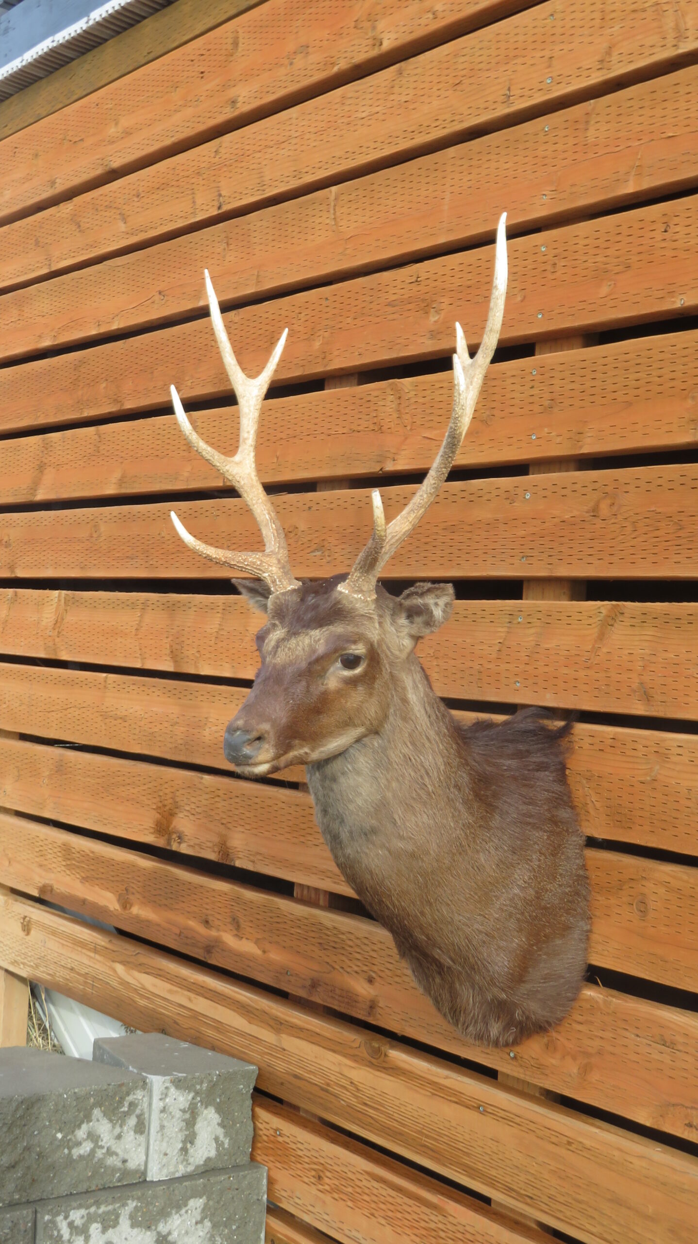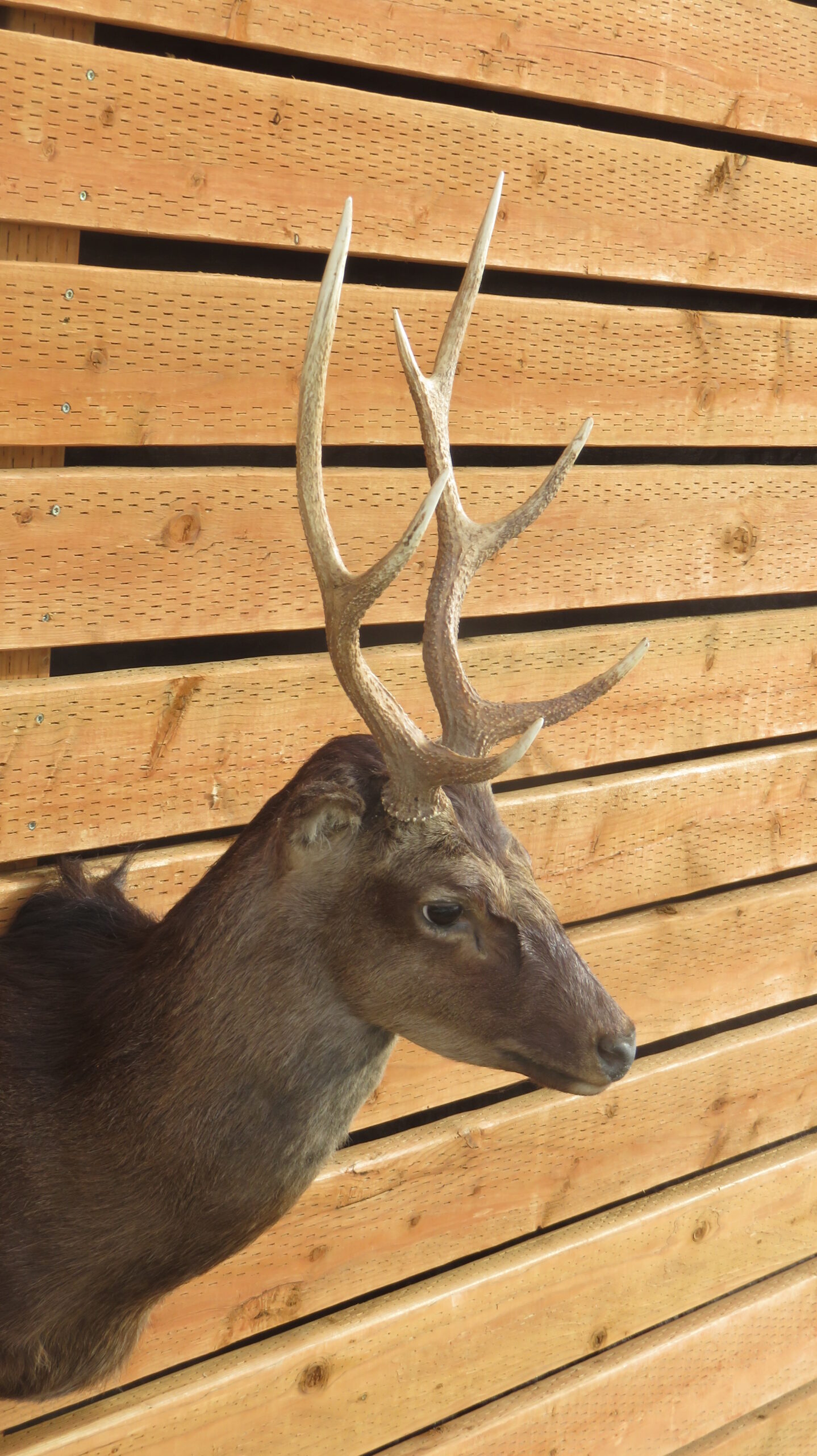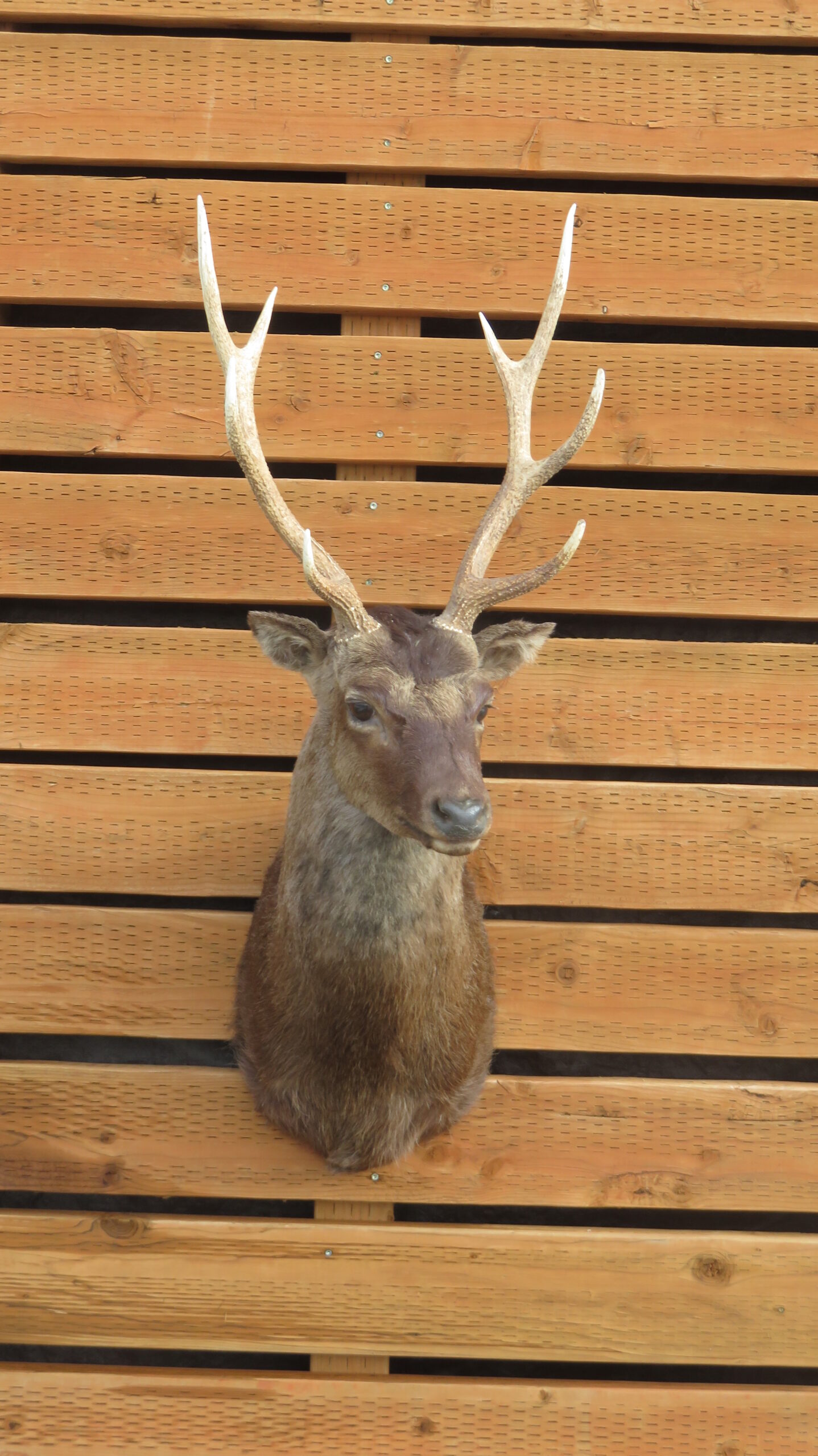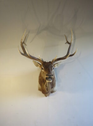 This is a Barbary Stag taxidermy shoulder mount with a slightly turned head, looking forward into the room. Also known as Atlas Deer of African Elk, this is the only species of deer native to Africa. This example has a 4 x 4 rack with good length and width on the antlers. Nice even coloring displayed on this coat with good hair thickness. Overall mount quality rates as “Excellent” for appearance and workmanship.