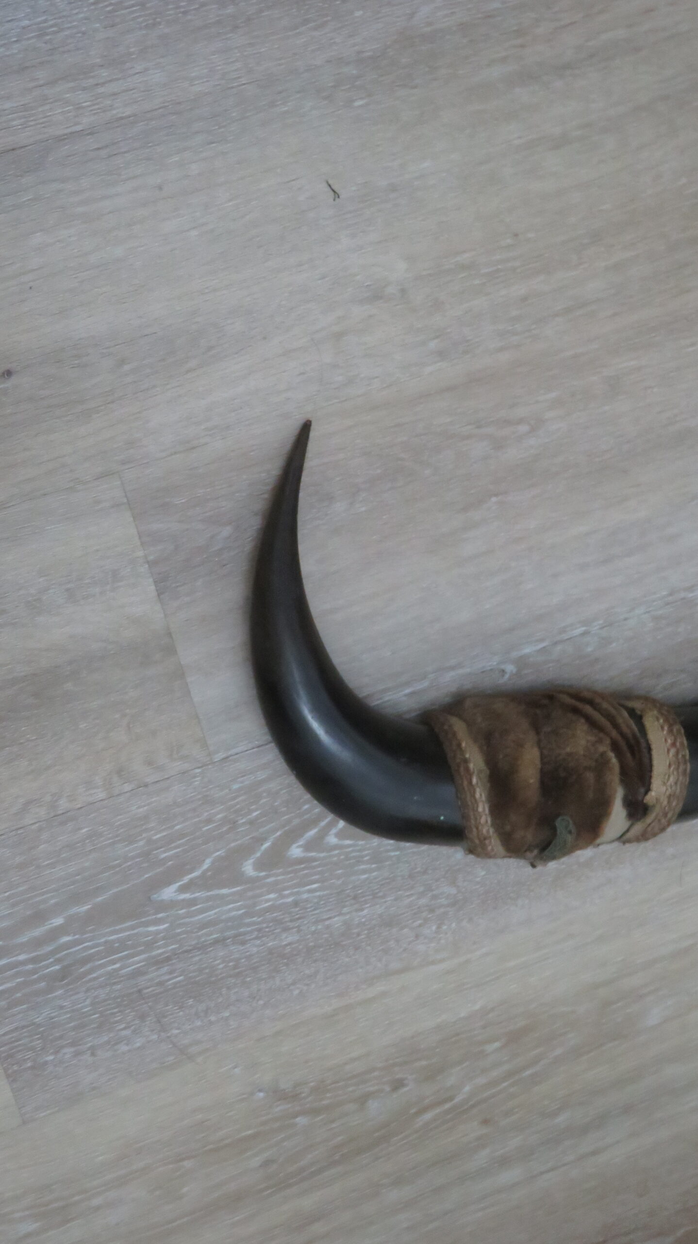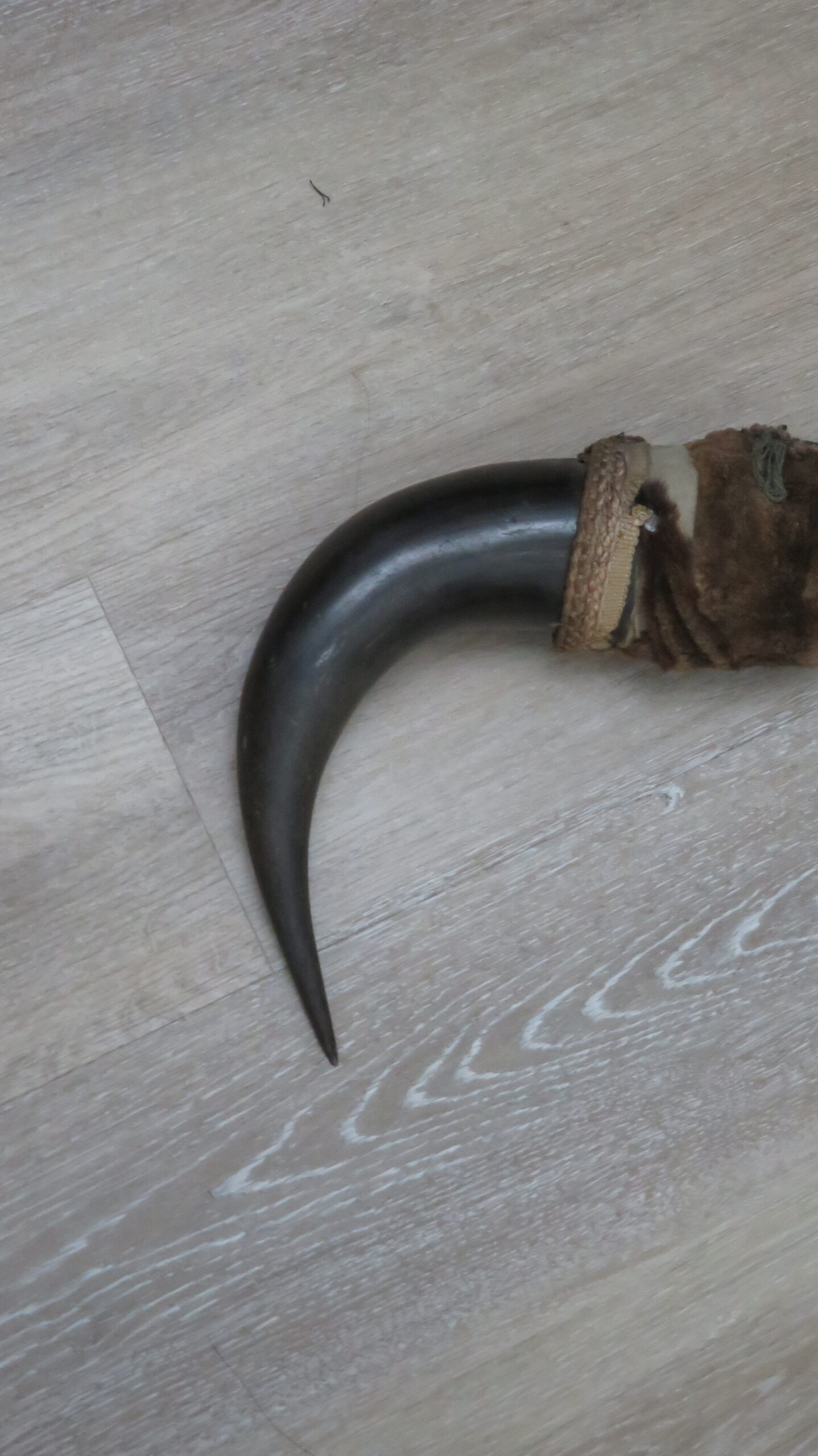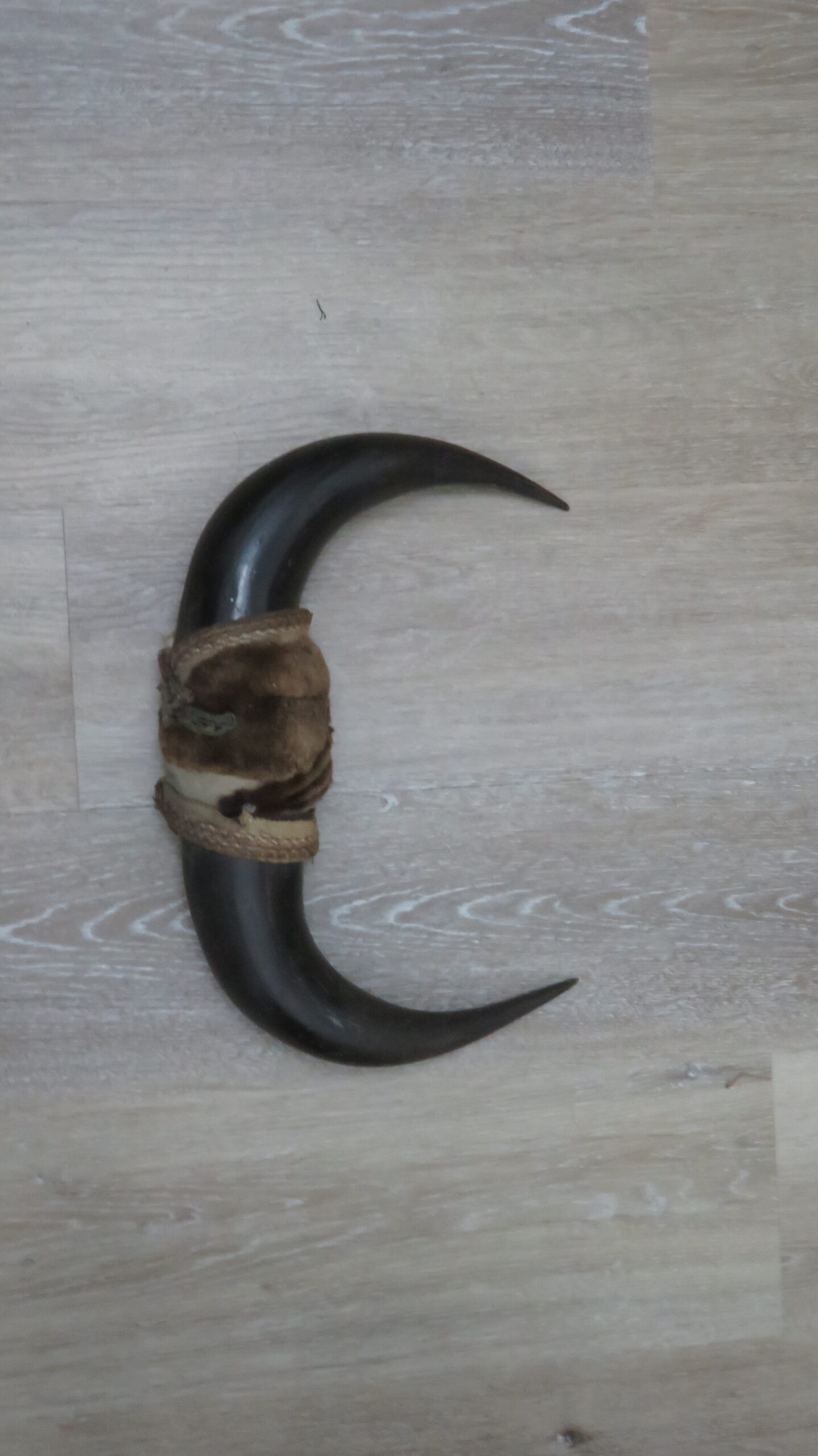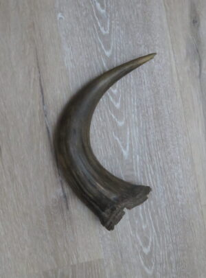 Here we have a set of Buffalo (Bison) horn caps with a wrap around the middle. Good colored horns with decent sizes. Horns measure about 13 1/2″ each in length. Simple fabric material used to cover the ends of the sheaths. These could be pulled out and put on a skull or used for display separately.