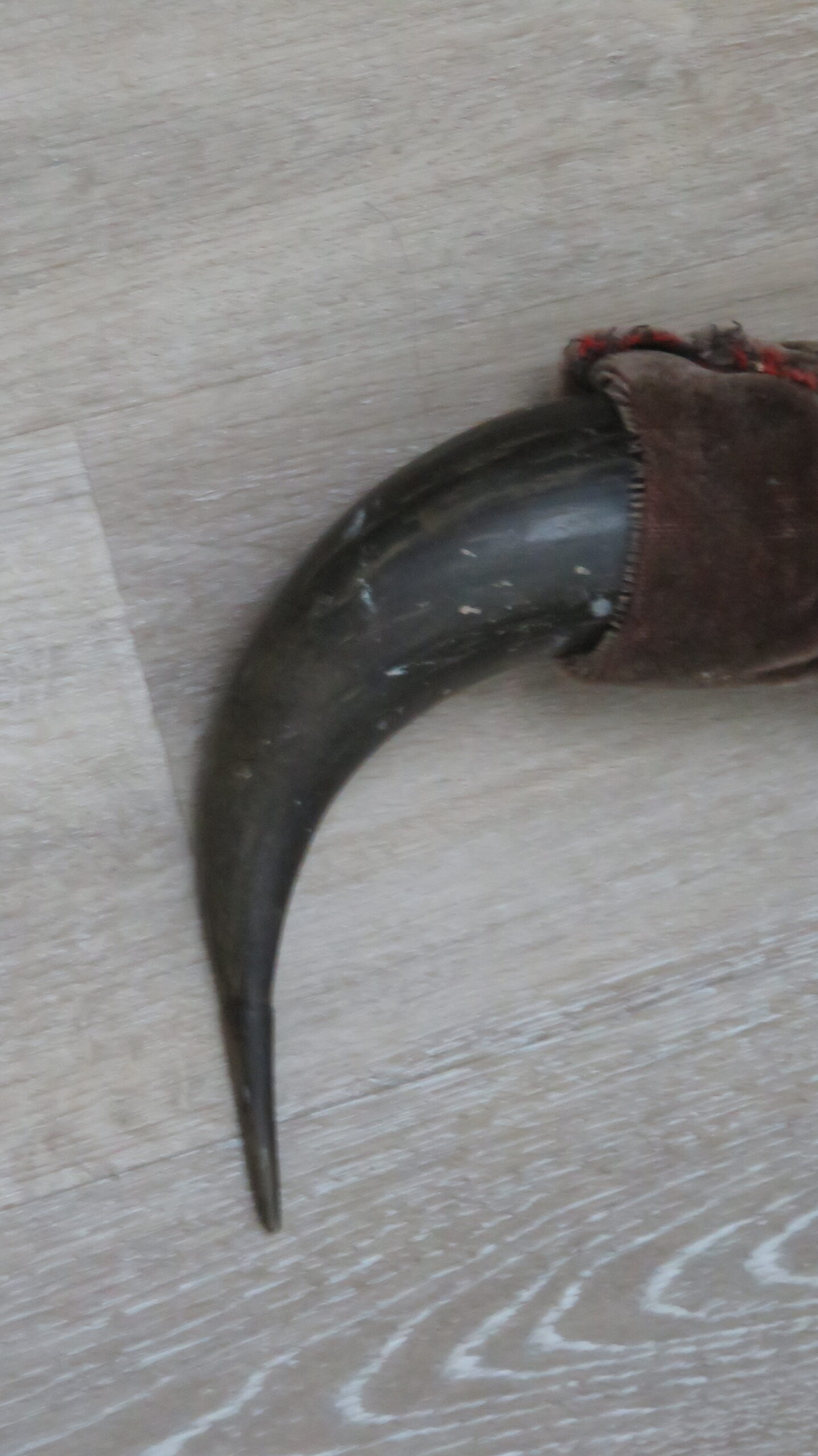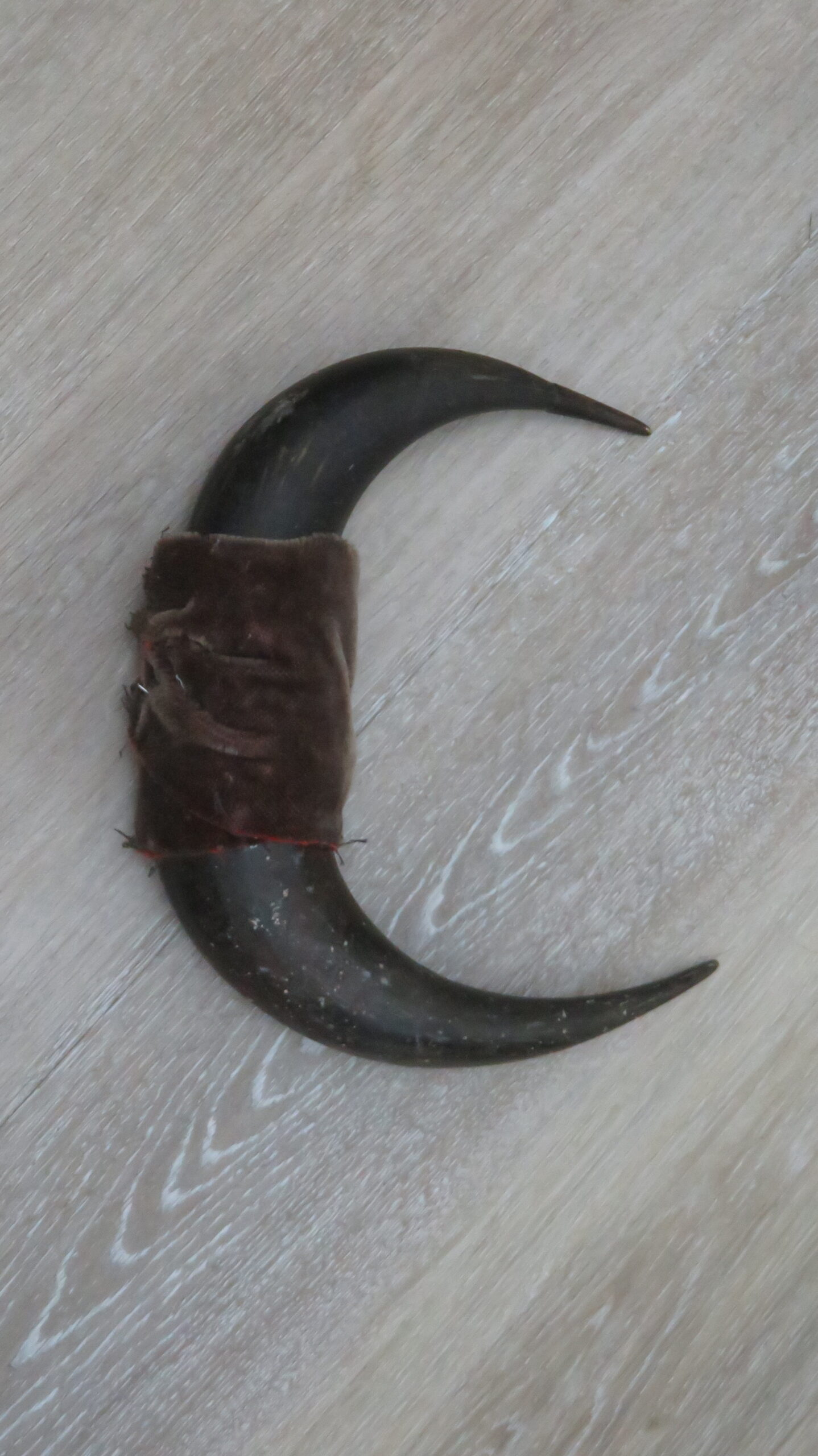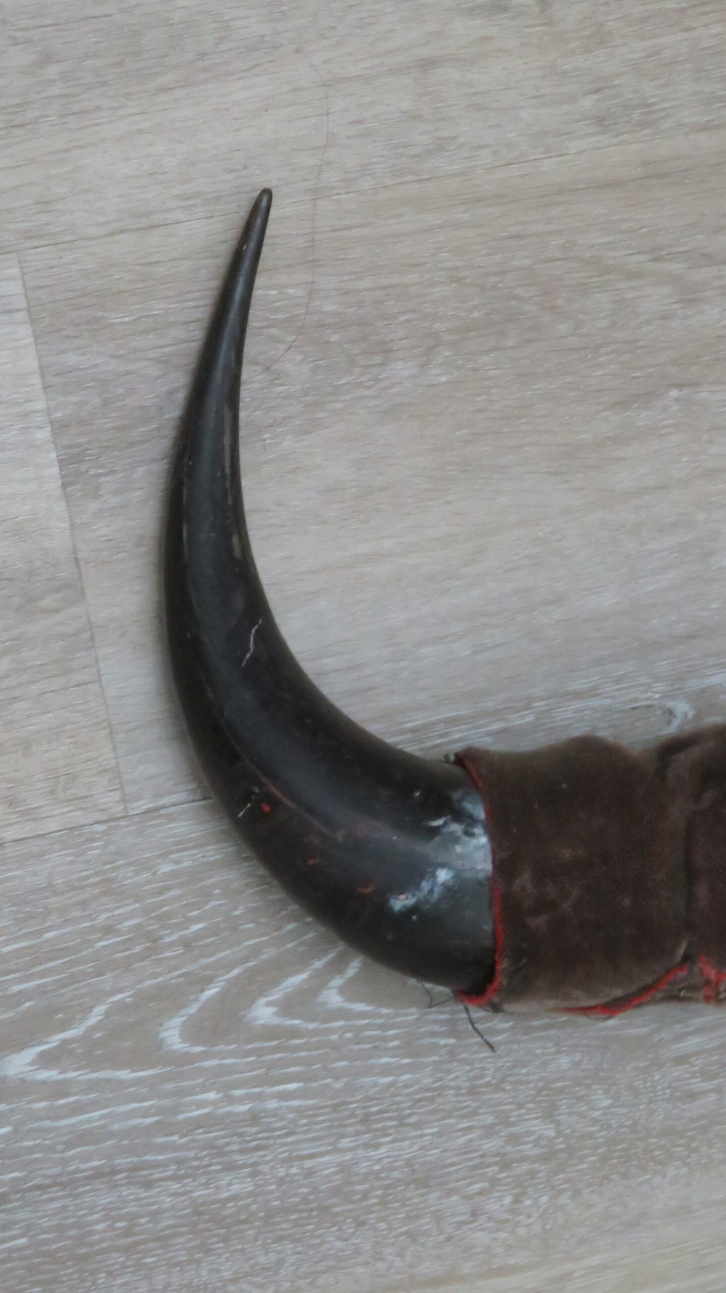 This is a set of North American Buffalo (or Bison) horn caps with a fabric wrap. Nice color and decent sized caps. One horn measures 14″ in length but has been covered with the fabric to match the other horn which is about 10″ long. The fabric could be taken off and the caps displayed loosely or used as replacements on a skull.