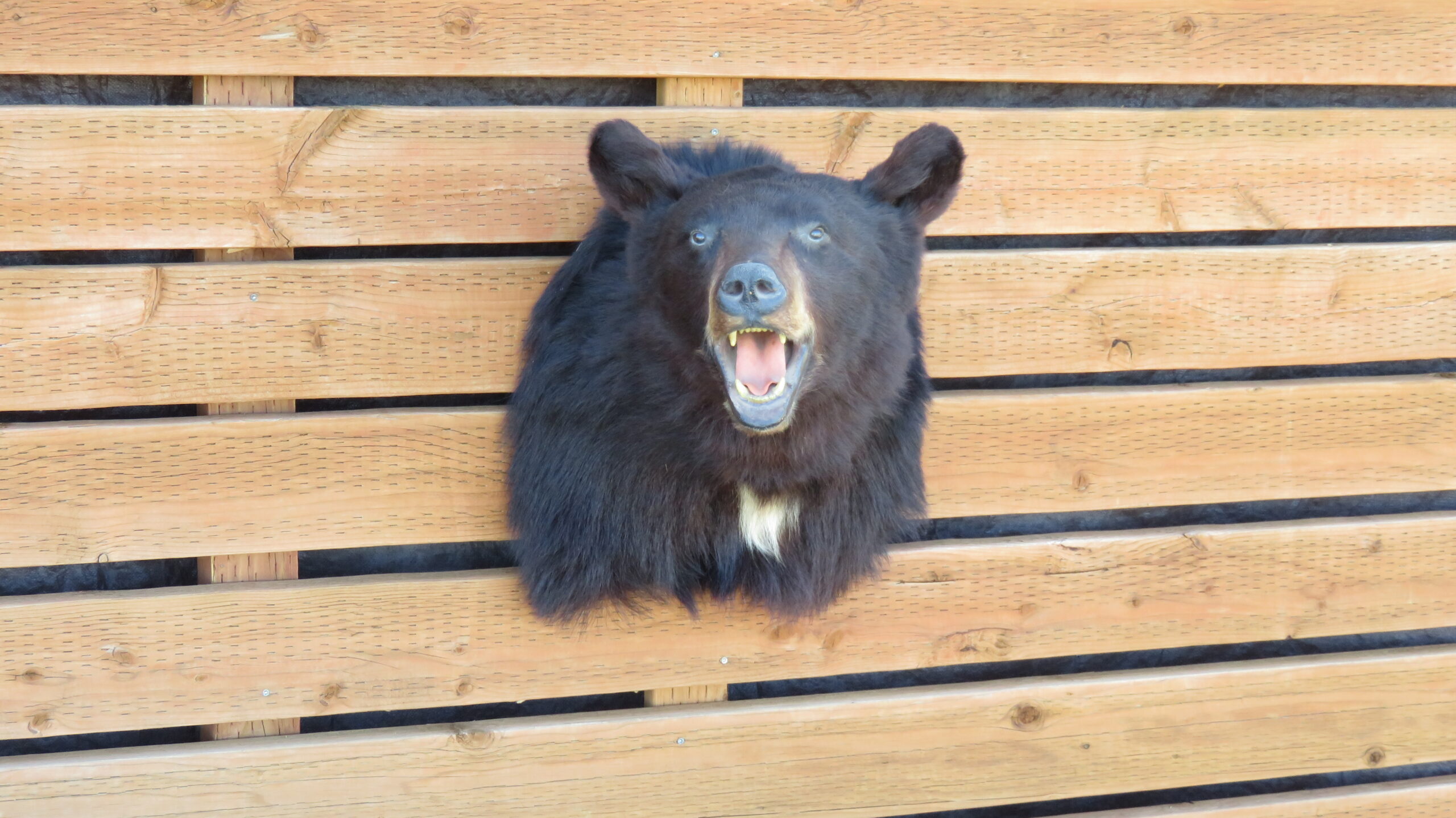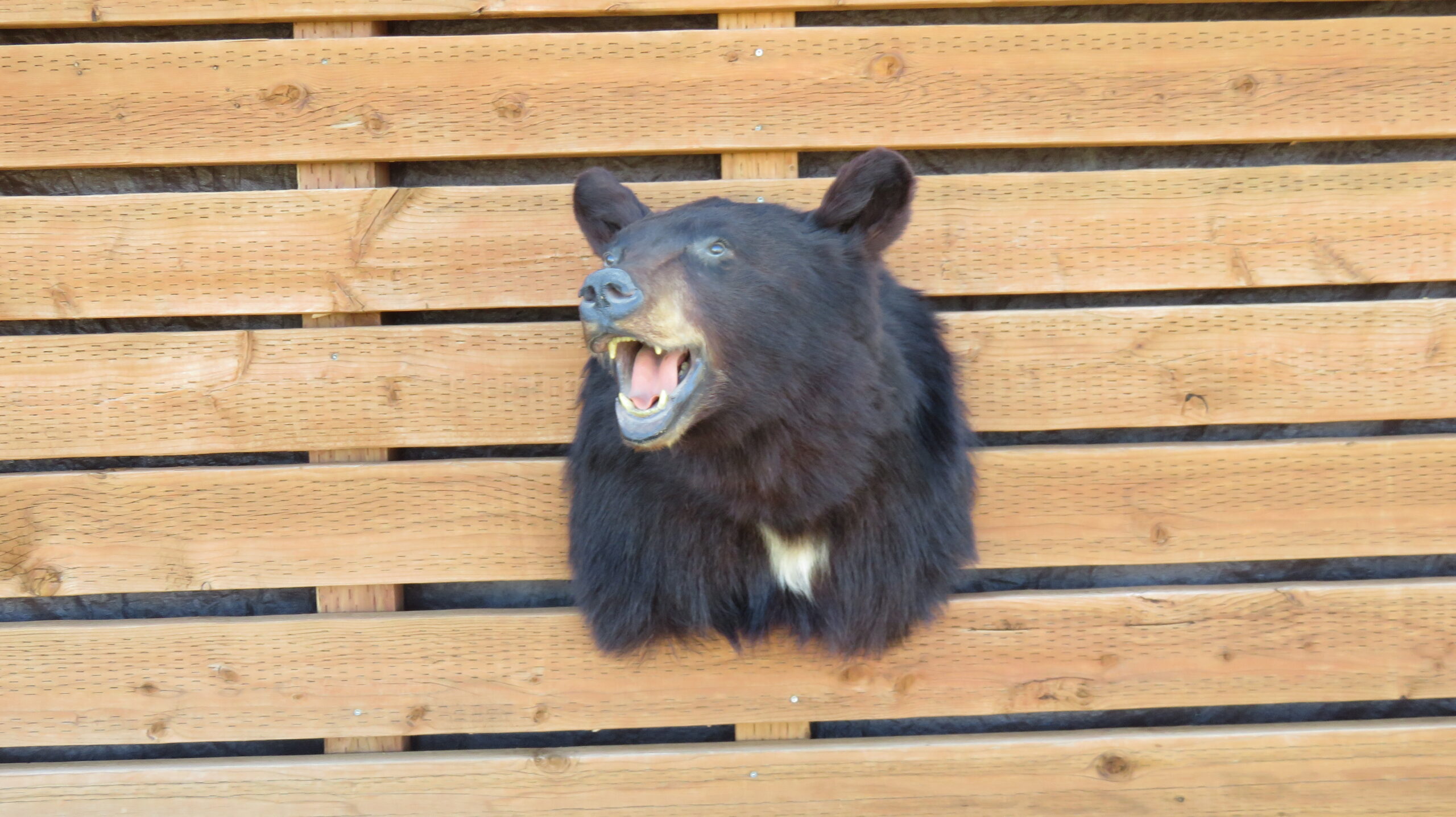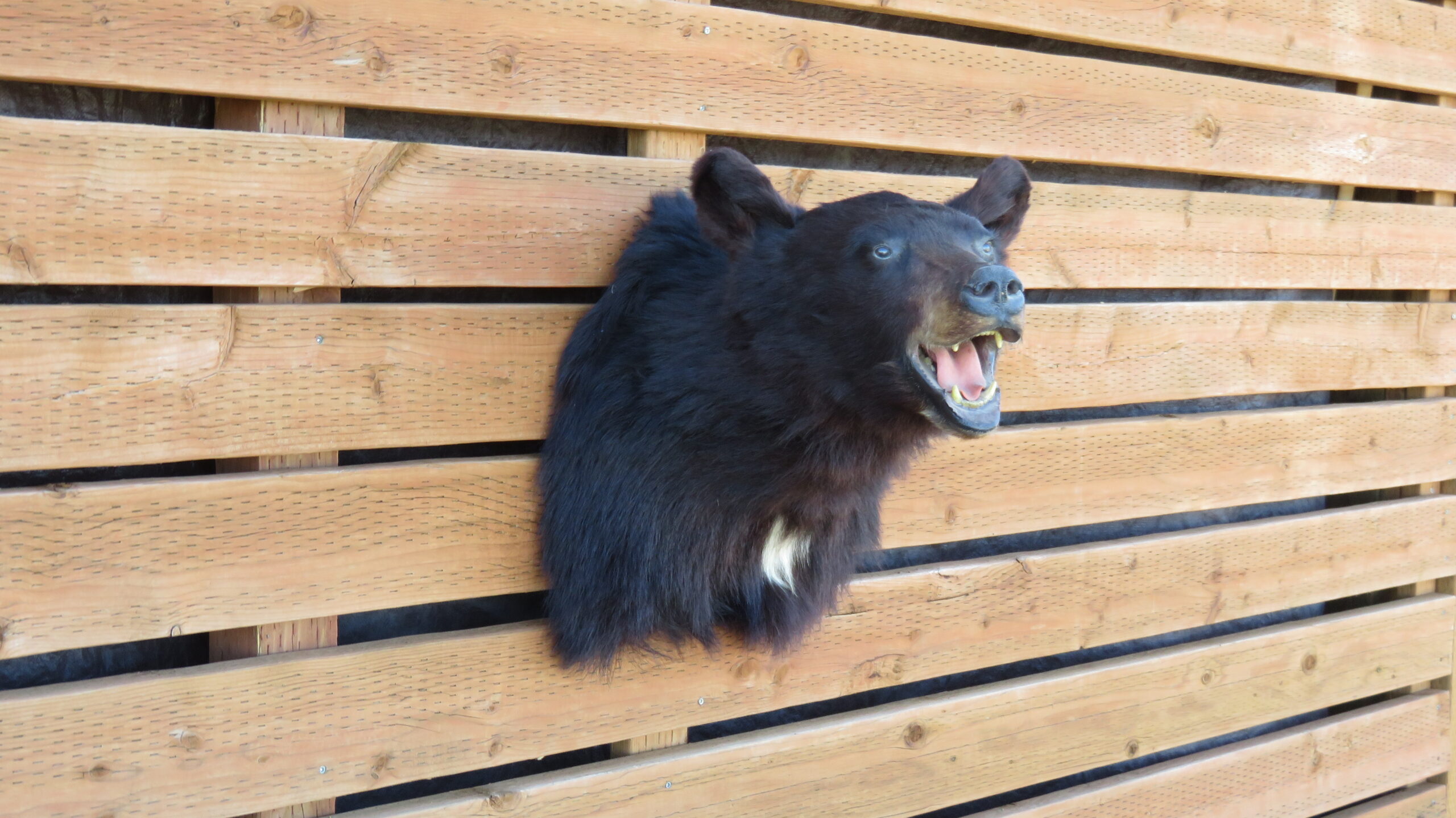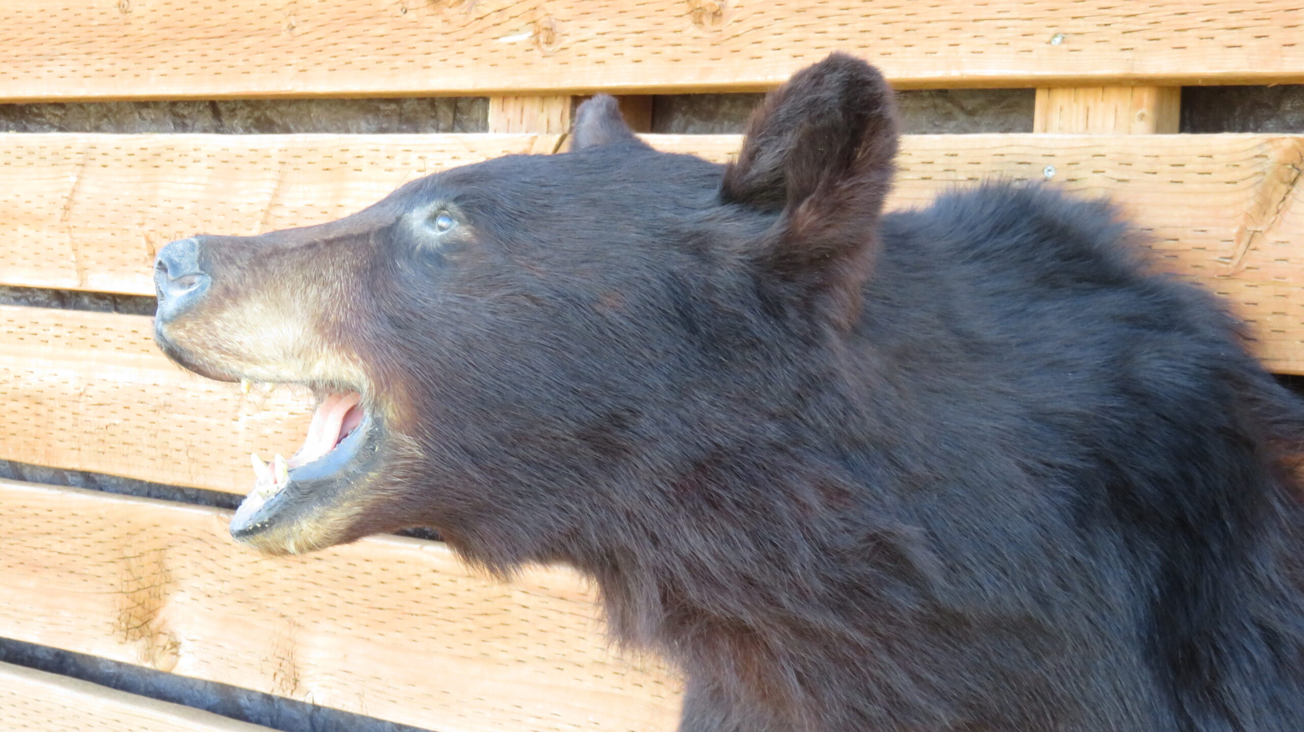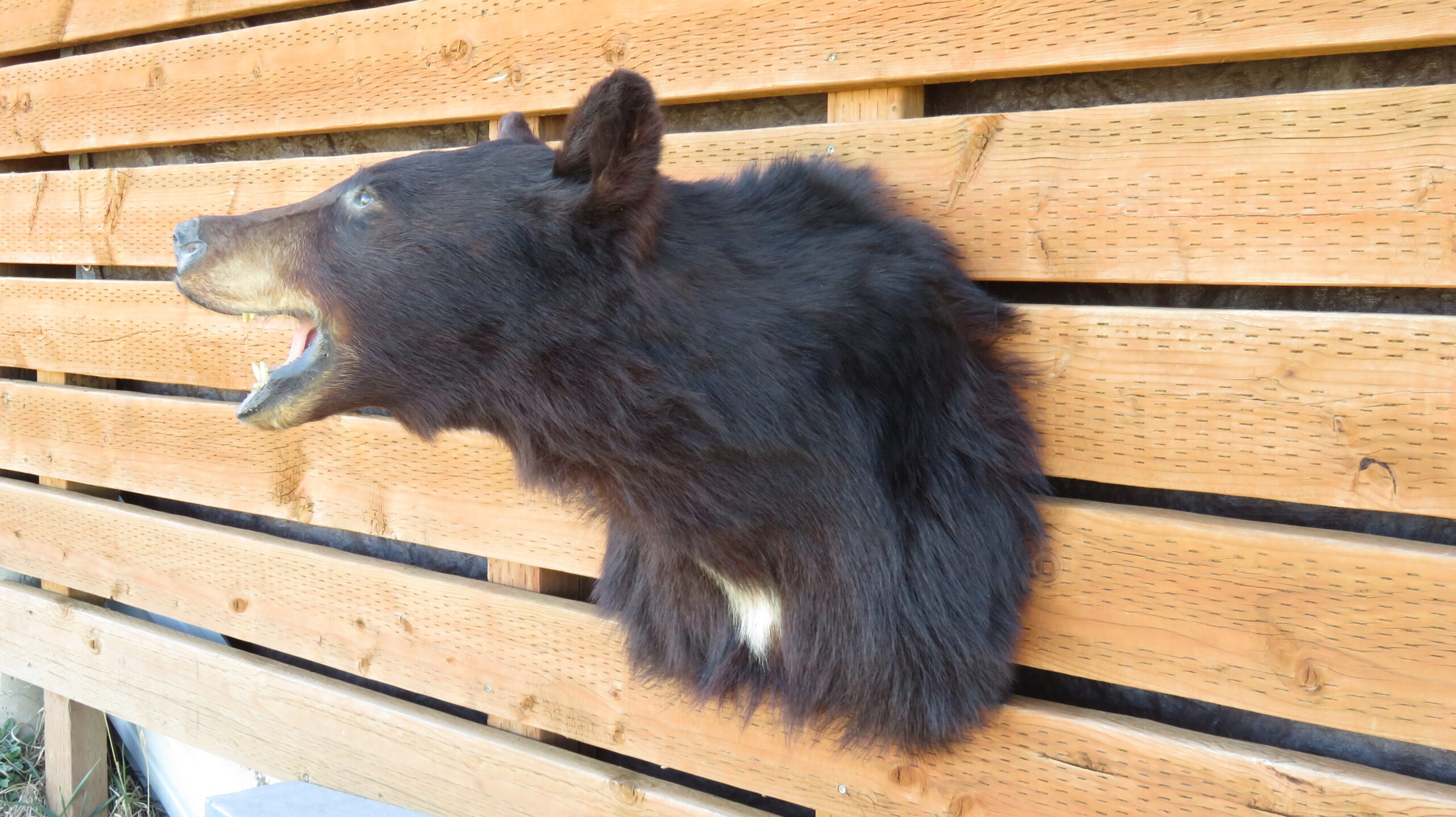 This is a beautifully posed black bear shoulder mount that we have just added. Head forward with a turn to the bear’s right (viewer’s left) looking into the room. He has the open mouth finish with ears alert-forward. The fur shows a deep black coat with just a small blaze of white on the chest (see attached photos). Overall “Premier” quality for overall workmanship and appearance on this taxidermy piece.