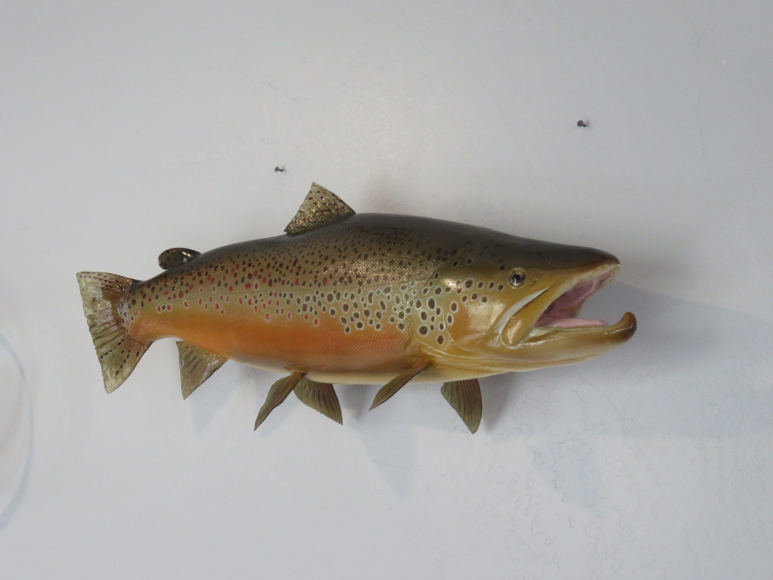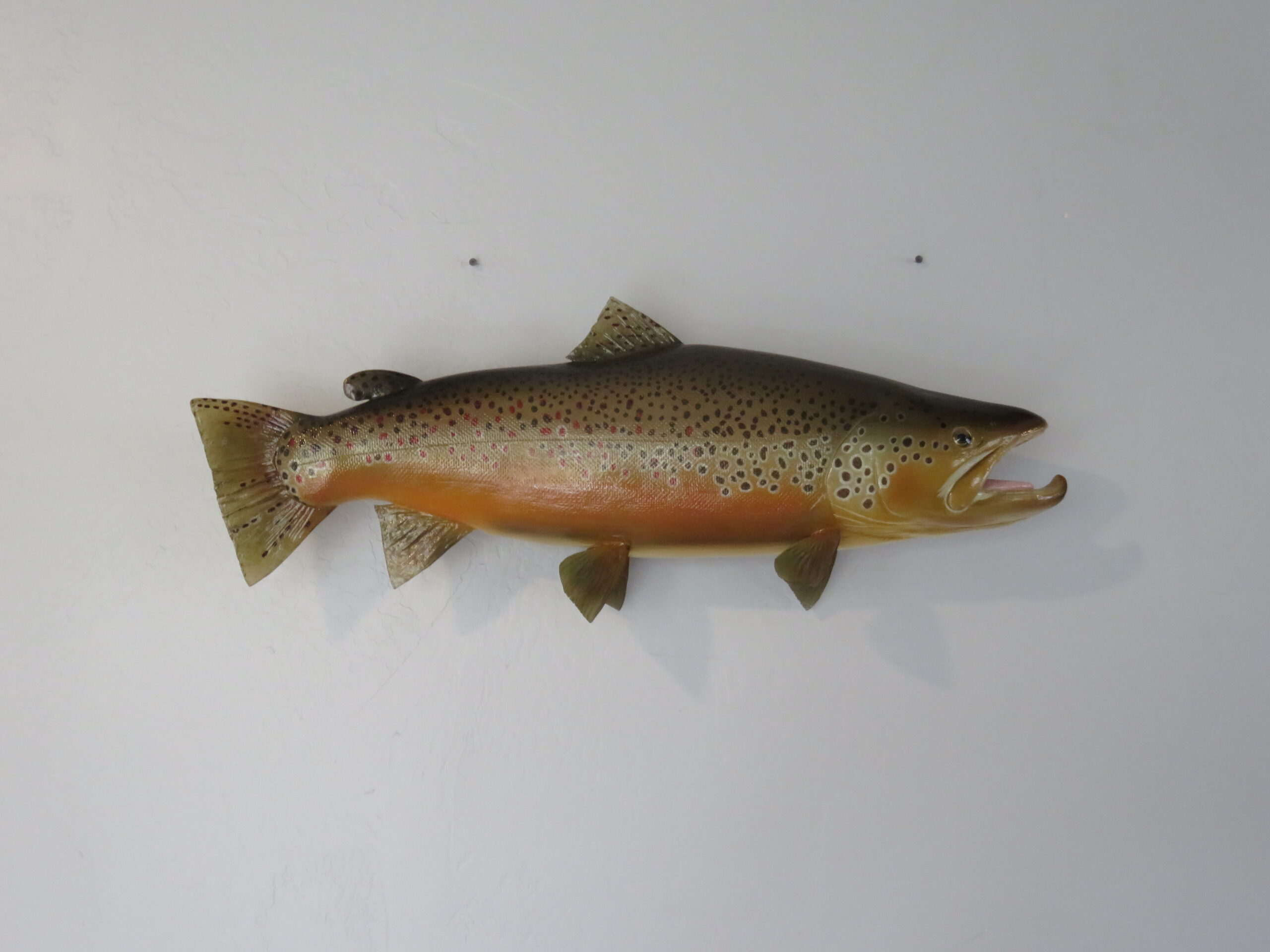 Here we have a beautiful reproduction mount of a Brown Trout. Overall length is 28″ (inches) with an estimated live weight of 10 pounds. This fish mount displays nice coloring and pattern. Mount is facing to the viewers right, looking along the wall.