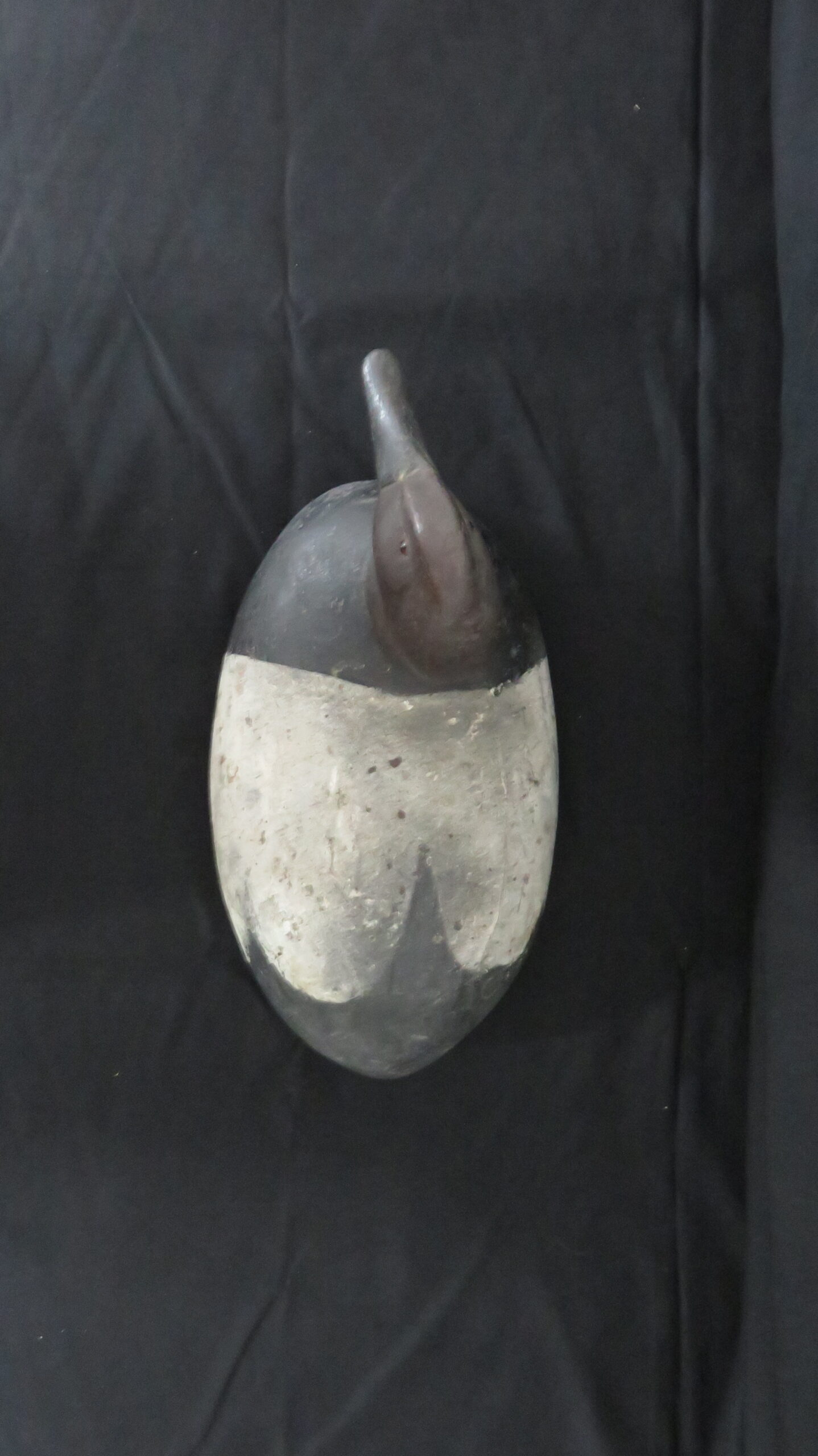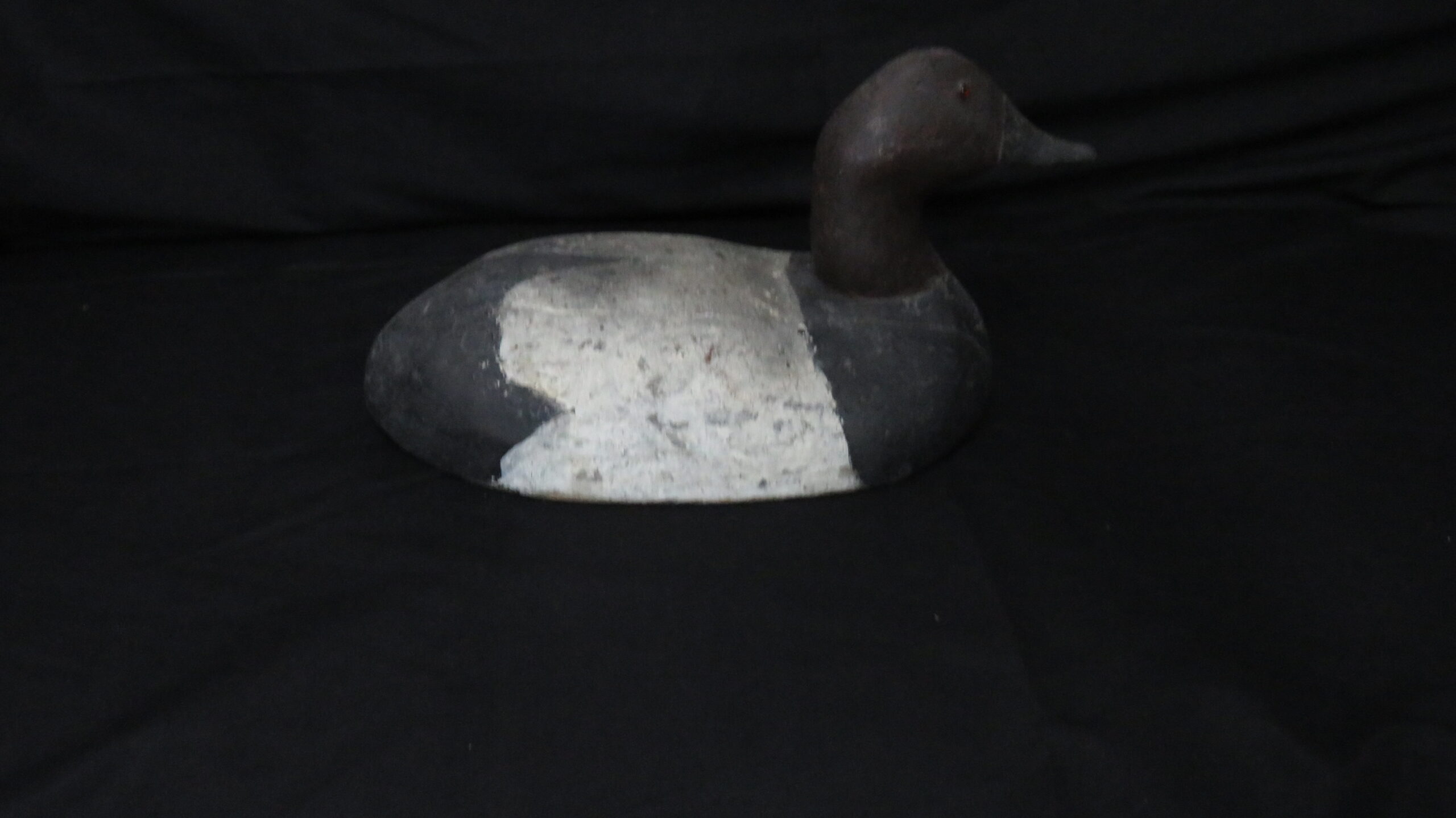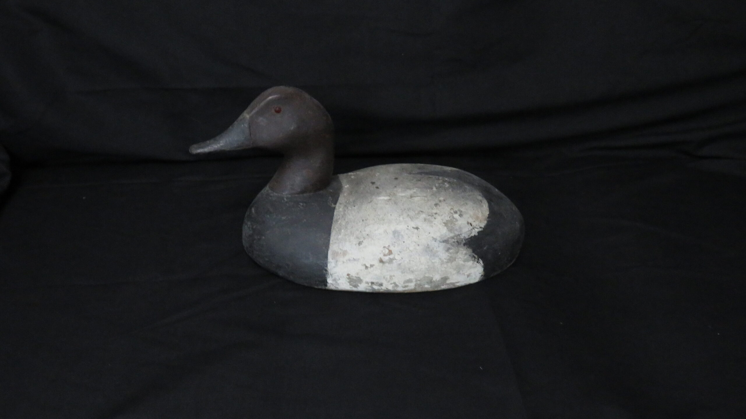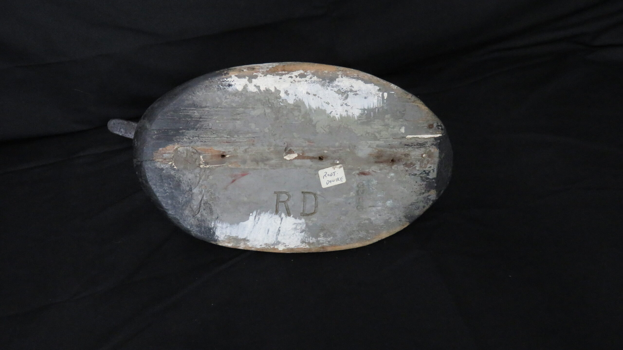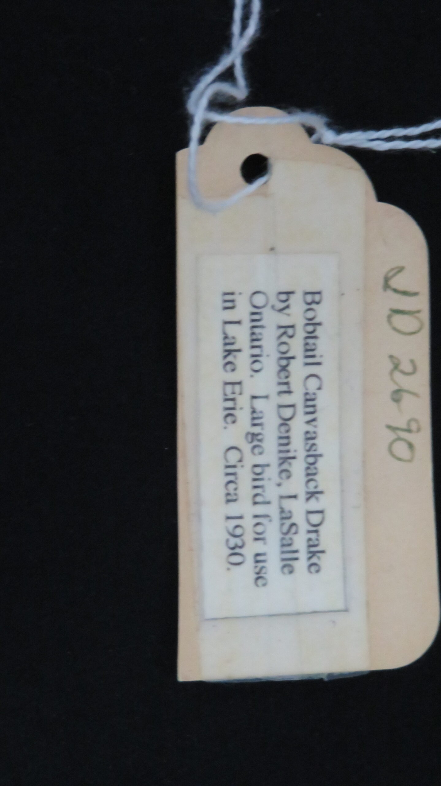 This is a large sized Bobtail Canvasback decoy from about 1930. It is a handmade item and is in great condition! Original paint, bead eyes and has artist markings on the base (see attached photos). The artist initials “R D” are stamped indicating it was made by Robert Denike of LaSalle, Ontario. This decoy would likely have been used on Lake Erie.