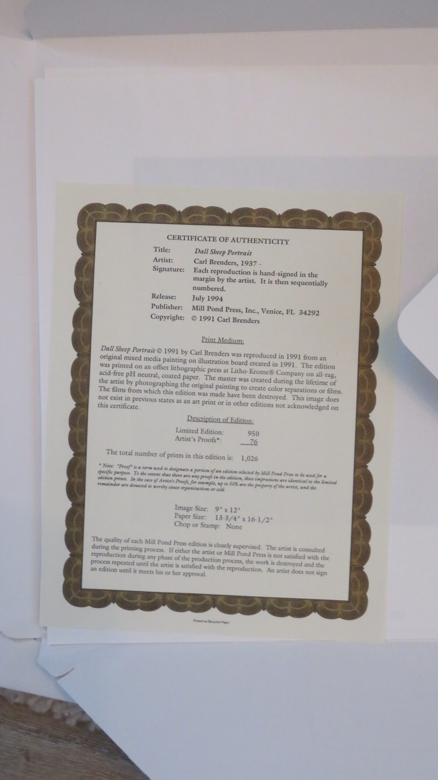 Here we have a beautiful limited edition print by wildlife artist Carl Brenders. Titled “Dall Sheep Portrait”, it is #170/950. Great art item that is in perfect condition and has never been mounted or framed. Image size is 9″ x 12″. Release date was July of 1994.