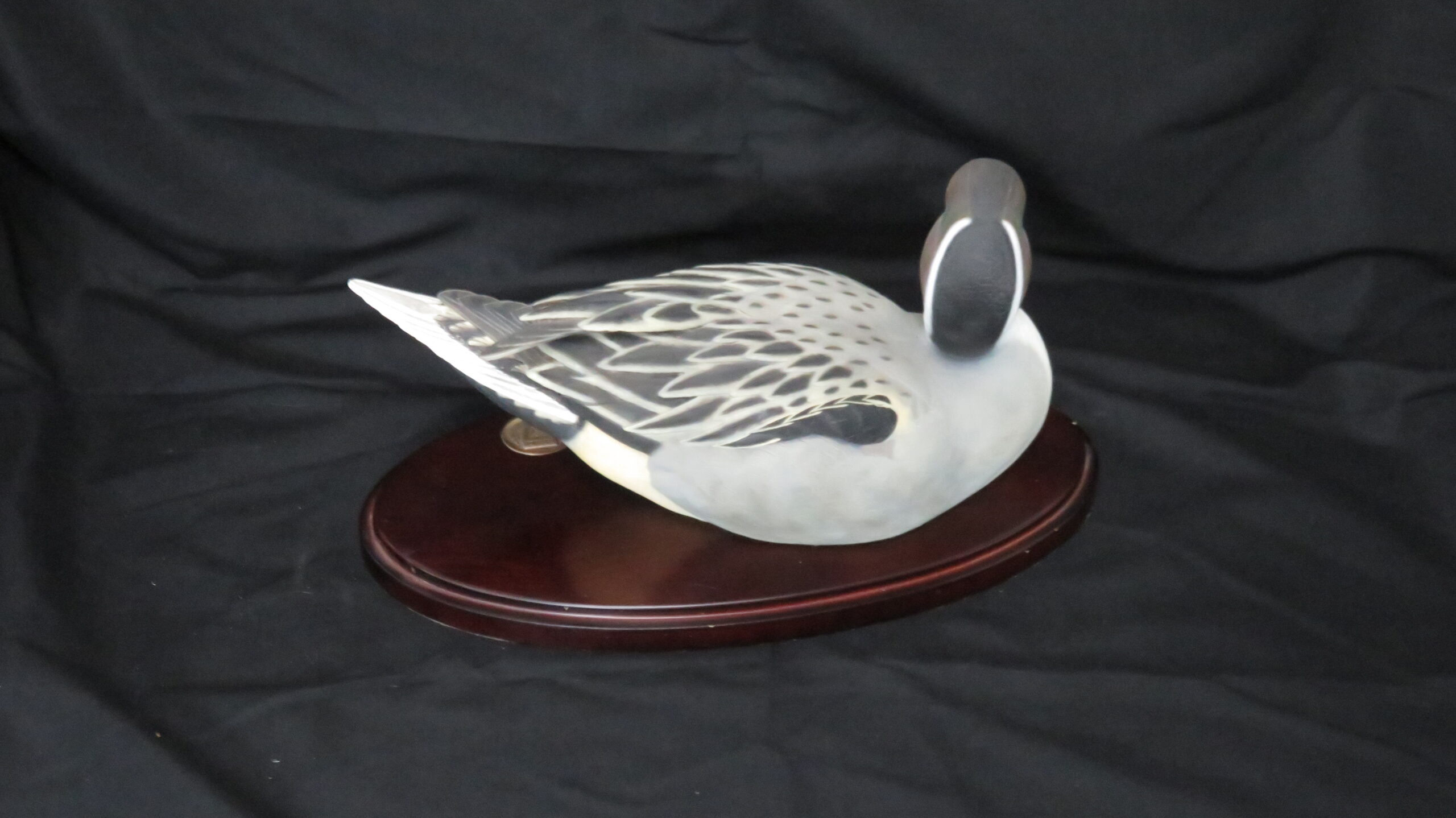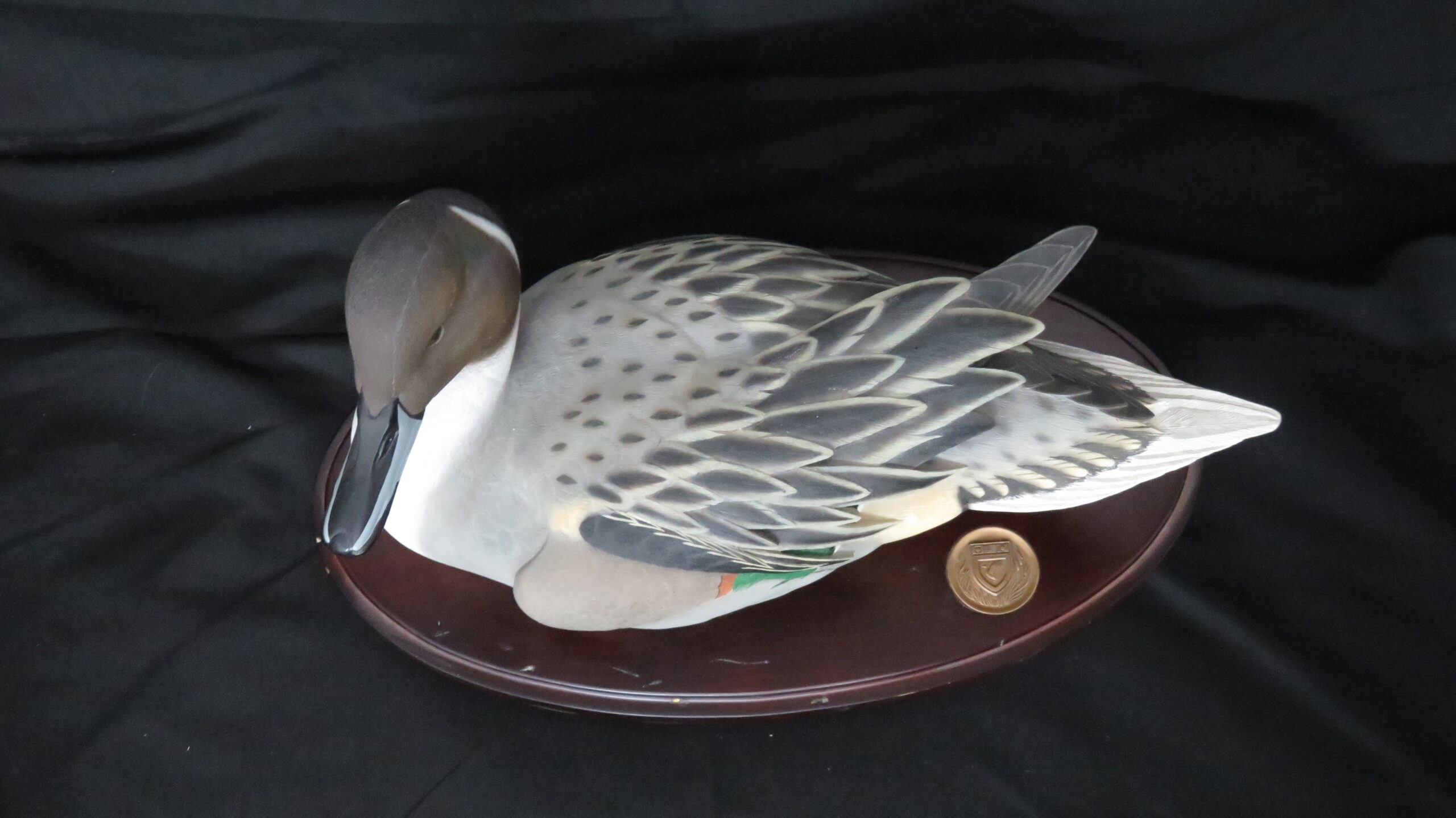 This is a beautiful Ducks Unlimited release decoy. Item is mounted on a wood base with the DU emblem/medallion inset. (see attached photos). Excellent overall condition to the decoy, but the base has a couple minor chips and cracks (see photos).