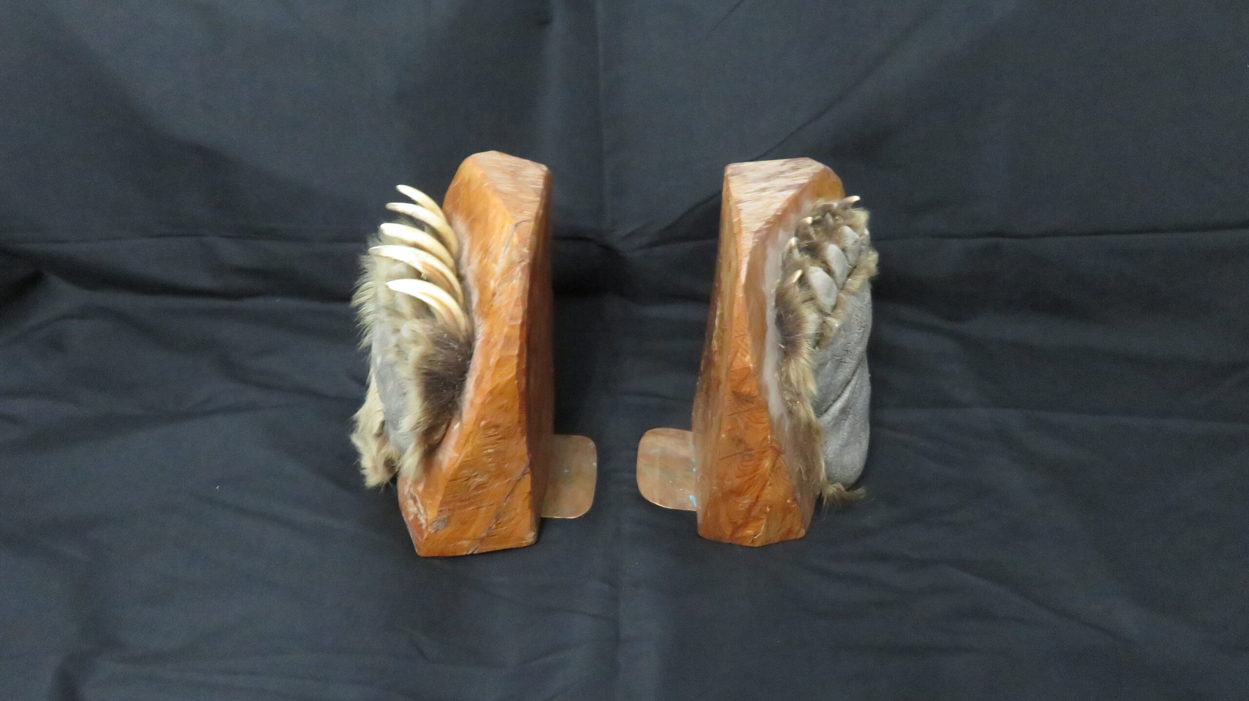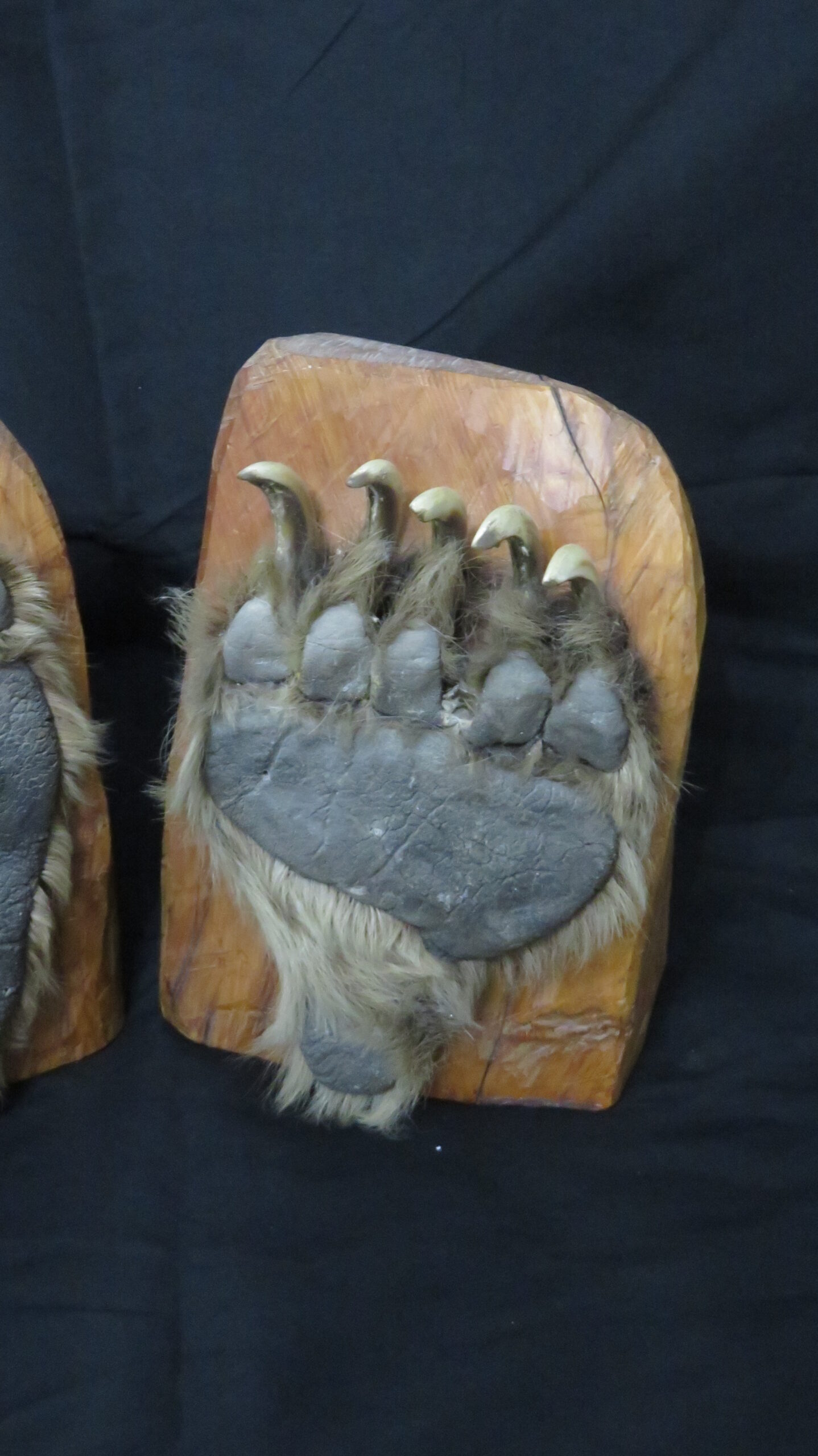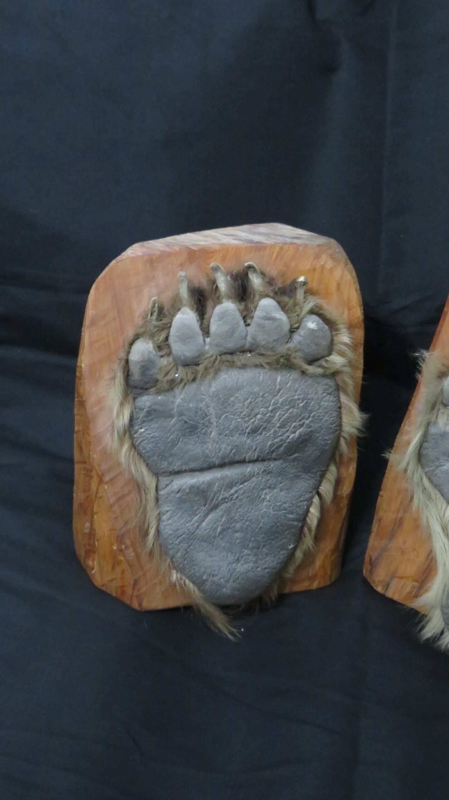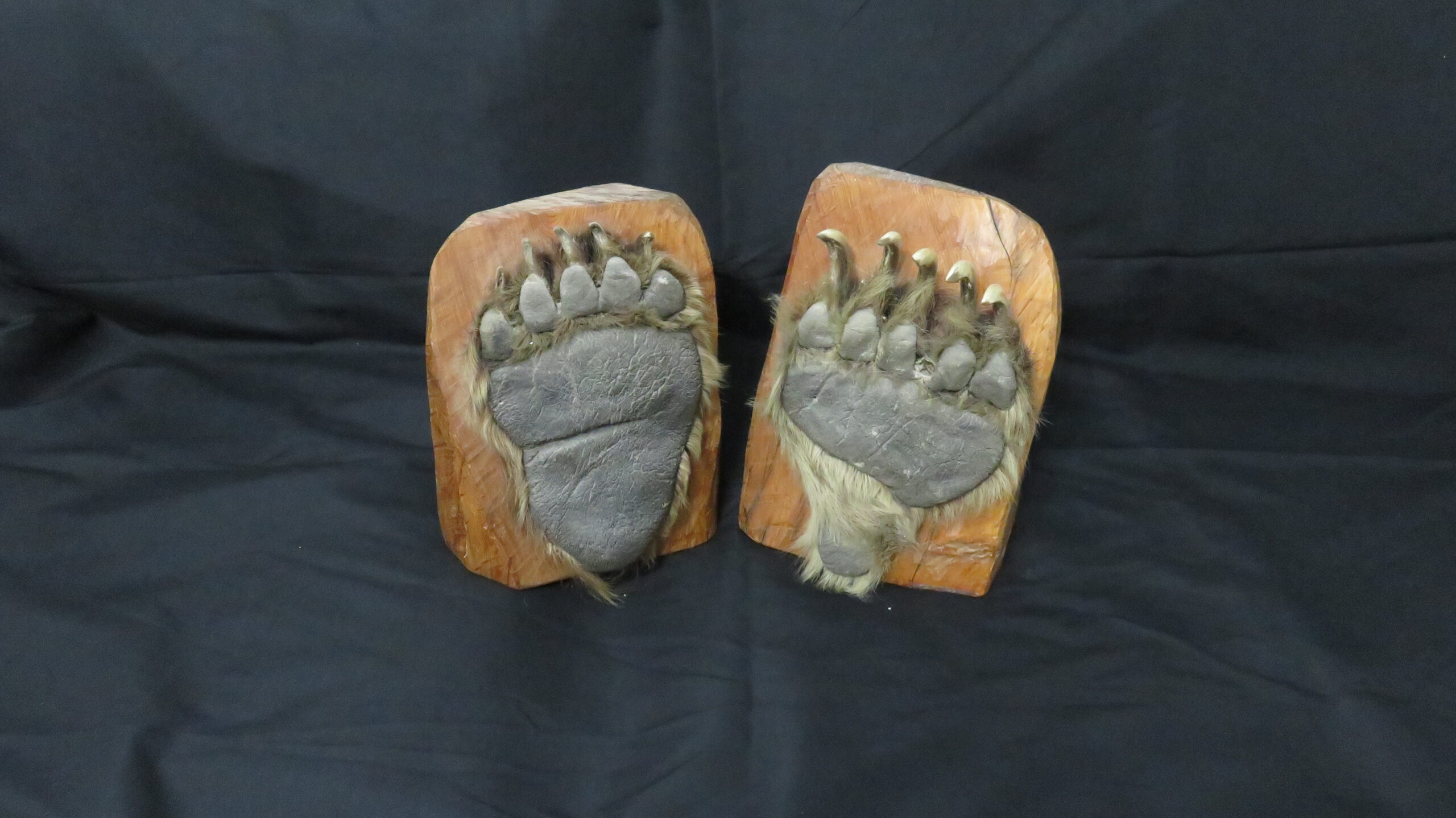 Buy this taxidermy set for use as actual bookends, or simply for display items. Each wood block is approximately 10″ tall and 8″ wide. The paws cover most of the outer surface of each block.