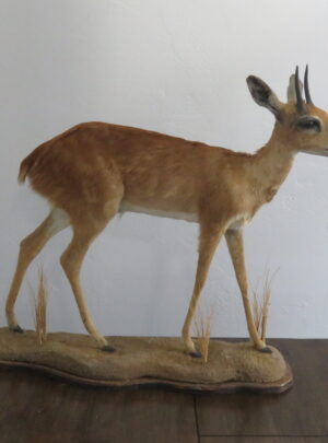 This is a beautiful African Impala life sized mount with terrain base. He has a great natural pose standing with his right side towards the room. He is facing over his right looking into the room. (See attached photos) The base is a wall display and can be secured to the wall with two (2) screws. A great taxidermy mount that is of a showroom quality that would work in the home, lodge or business.