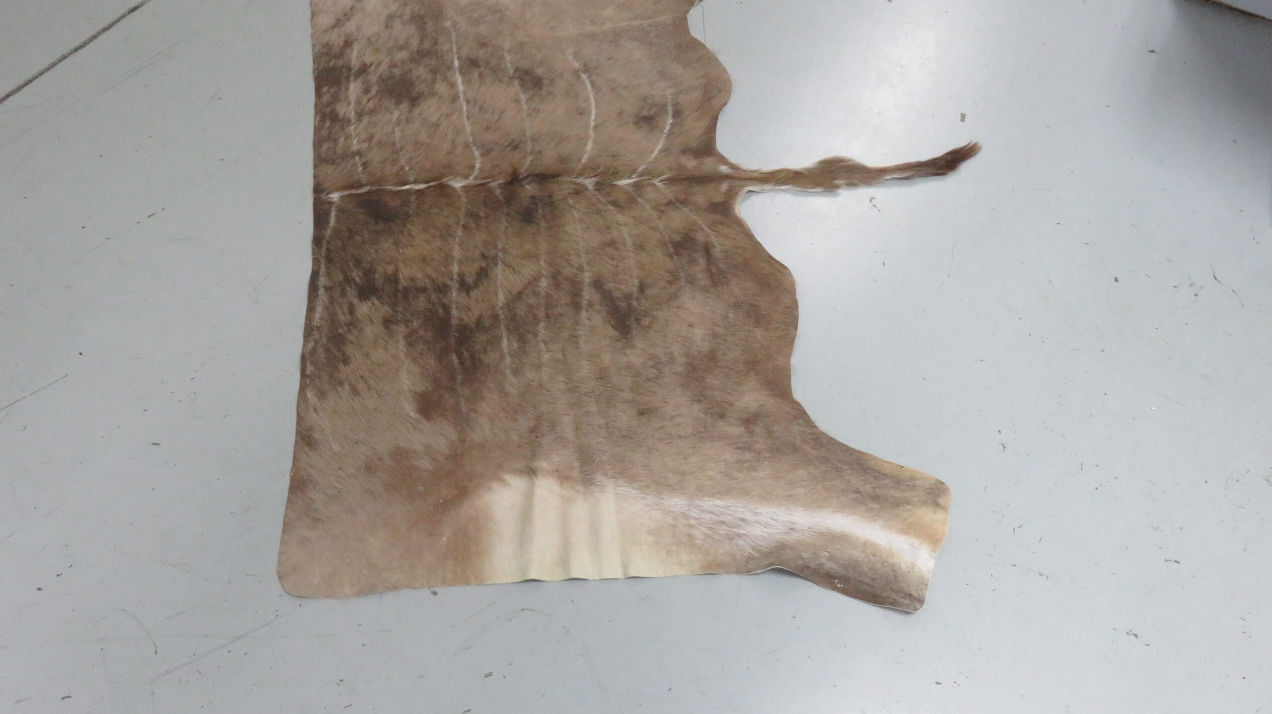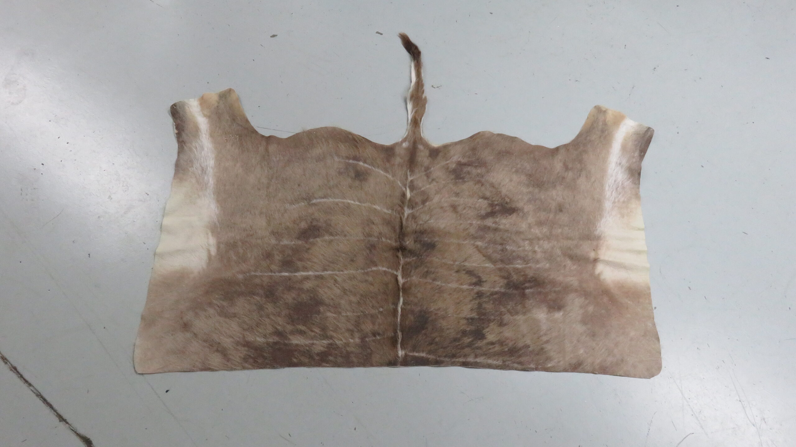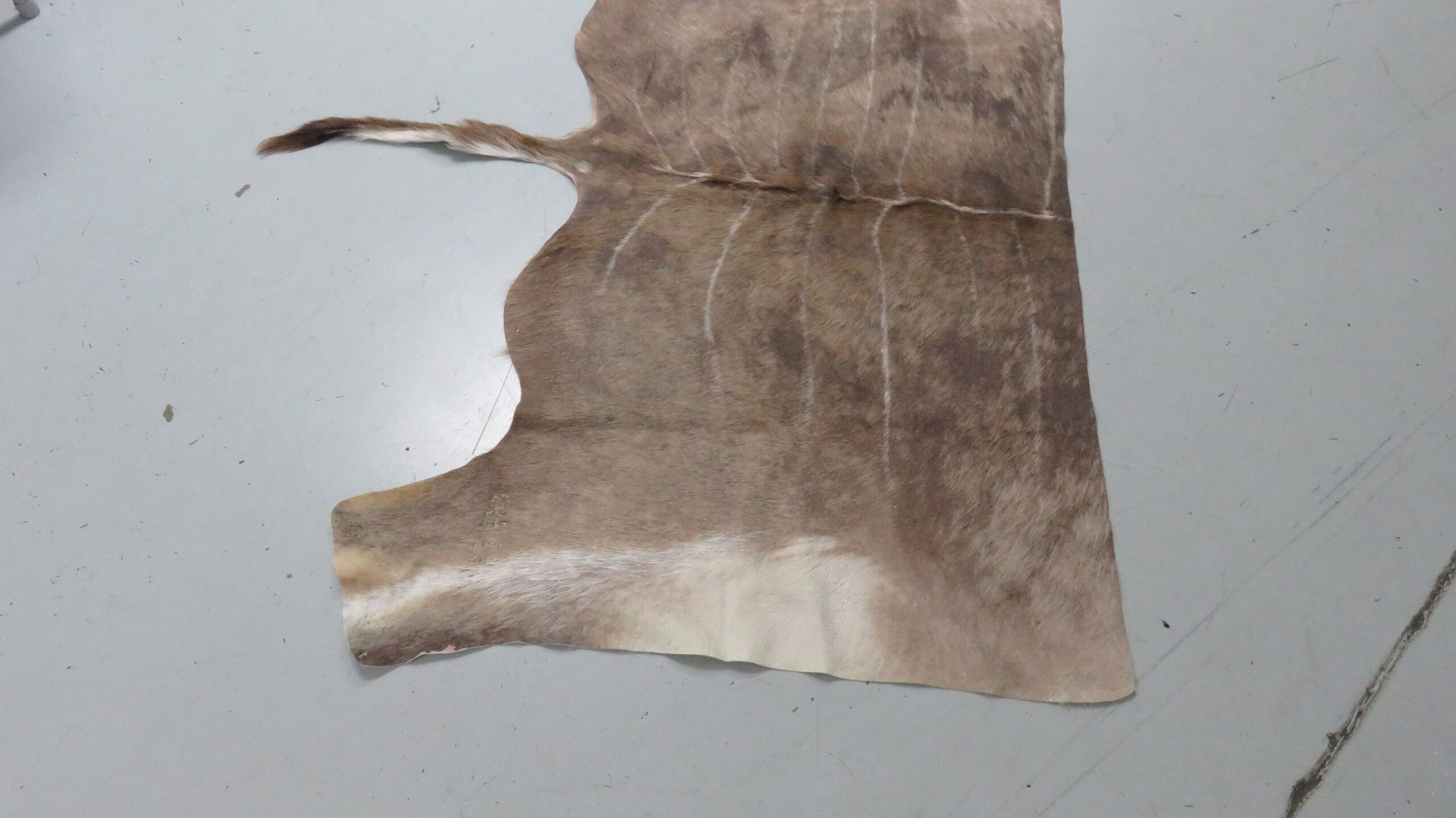This is a great looking Greater Kudu tanned hide/skin. This piece is fresh, pliable and soft. Nice size that measures 69″ wide at legs and is 41″ long (not including tail). A beautiful African skin to add to the wall, floor, or to drape over a piece of furniture.