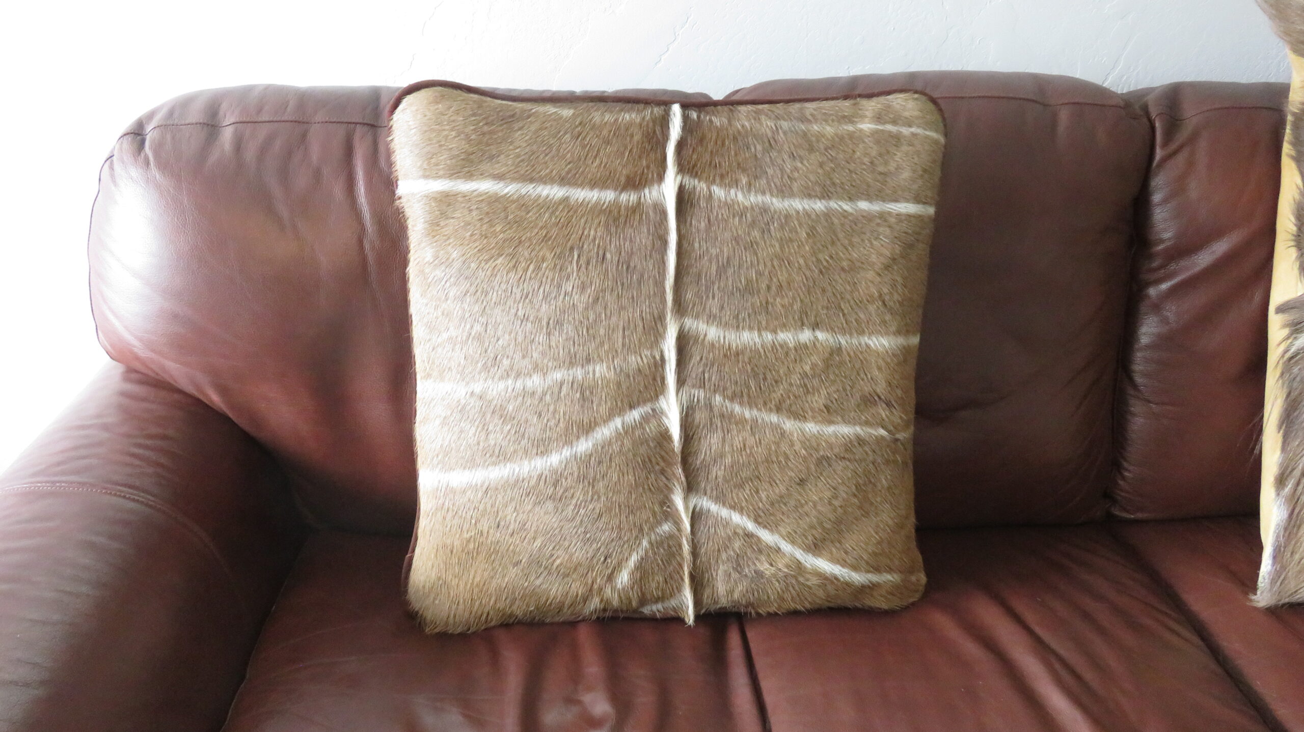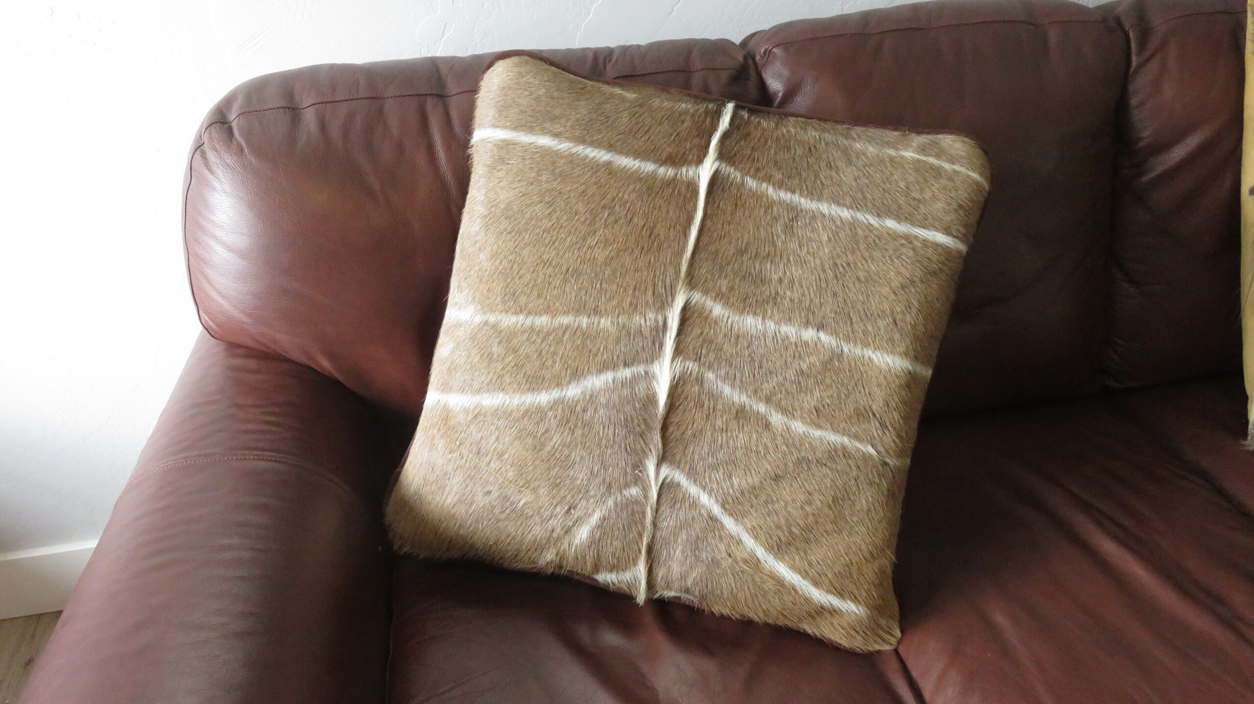Here we have a gorgeous Kudu hide pillow! A large pillow that measures roughly 21″ x 21″ in size. Beautiful back section of an African Kudu skin (or hide). The back surface is a dark brown fabric (see attached photos). Excellent condition on this taxidermy tanned hide pillow.