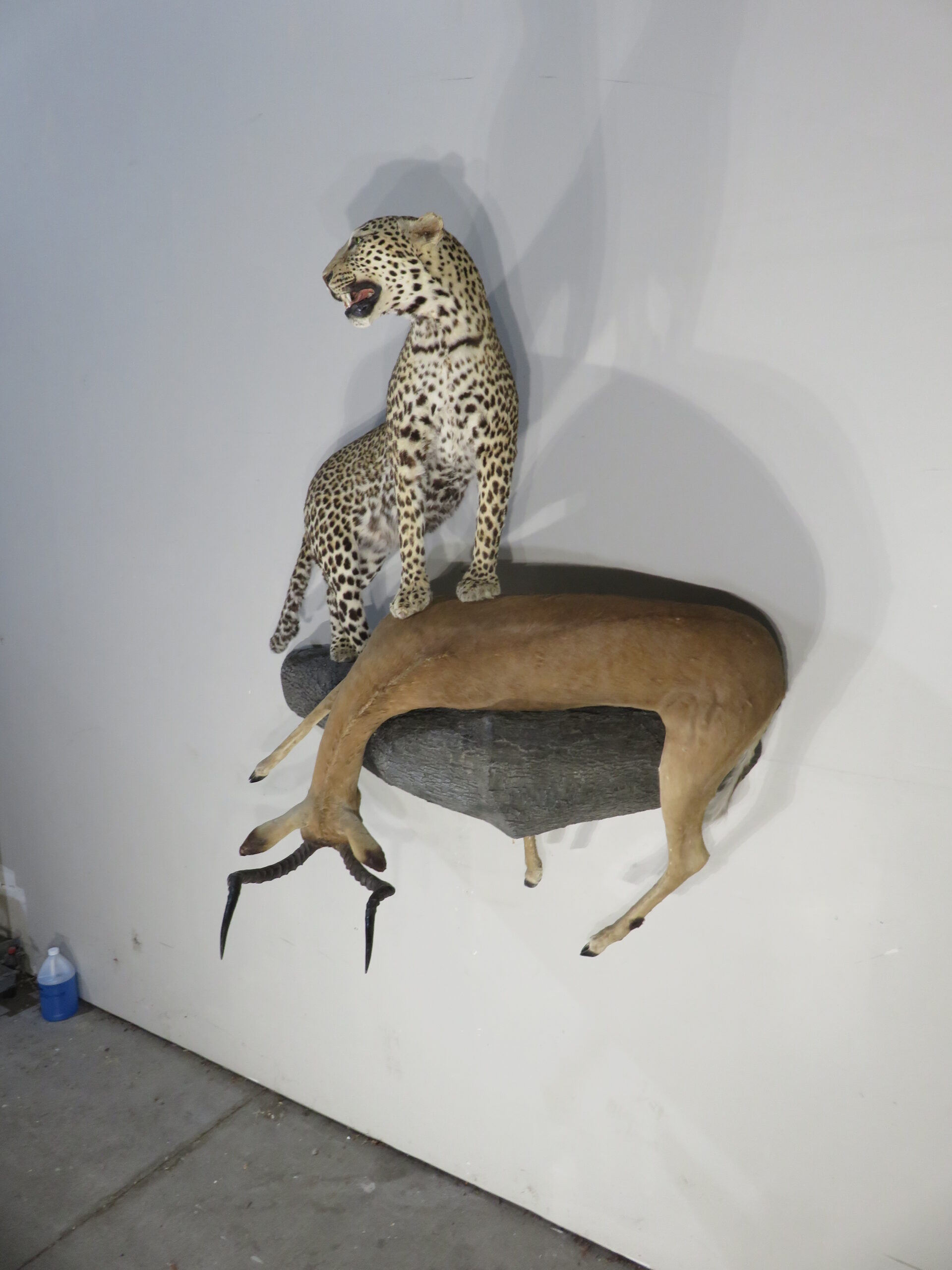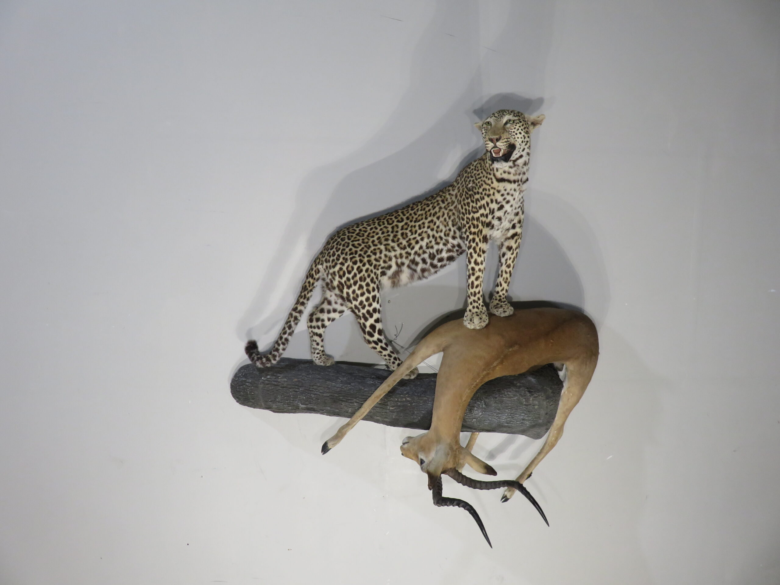 Here is a showroom mount for the serious collector of African/Exotic big game taxidermy! This is a gorgeous item that will command attention in any setting and with any collection. The focus of this mount is the large leopard which stands with front feet on the prize. The prey in this scene is a large African Impala that is in a position draped over the large “log” which is the base to this wall mount. A truly breath-taking wildlife display that measures approximately 69″ tall and 70″ wide. The depth, wall into room, measurement is 44 inches. This is a “Premier” quality taxidermy item. Due to the species involved, it can ONLY be sold in Montana.