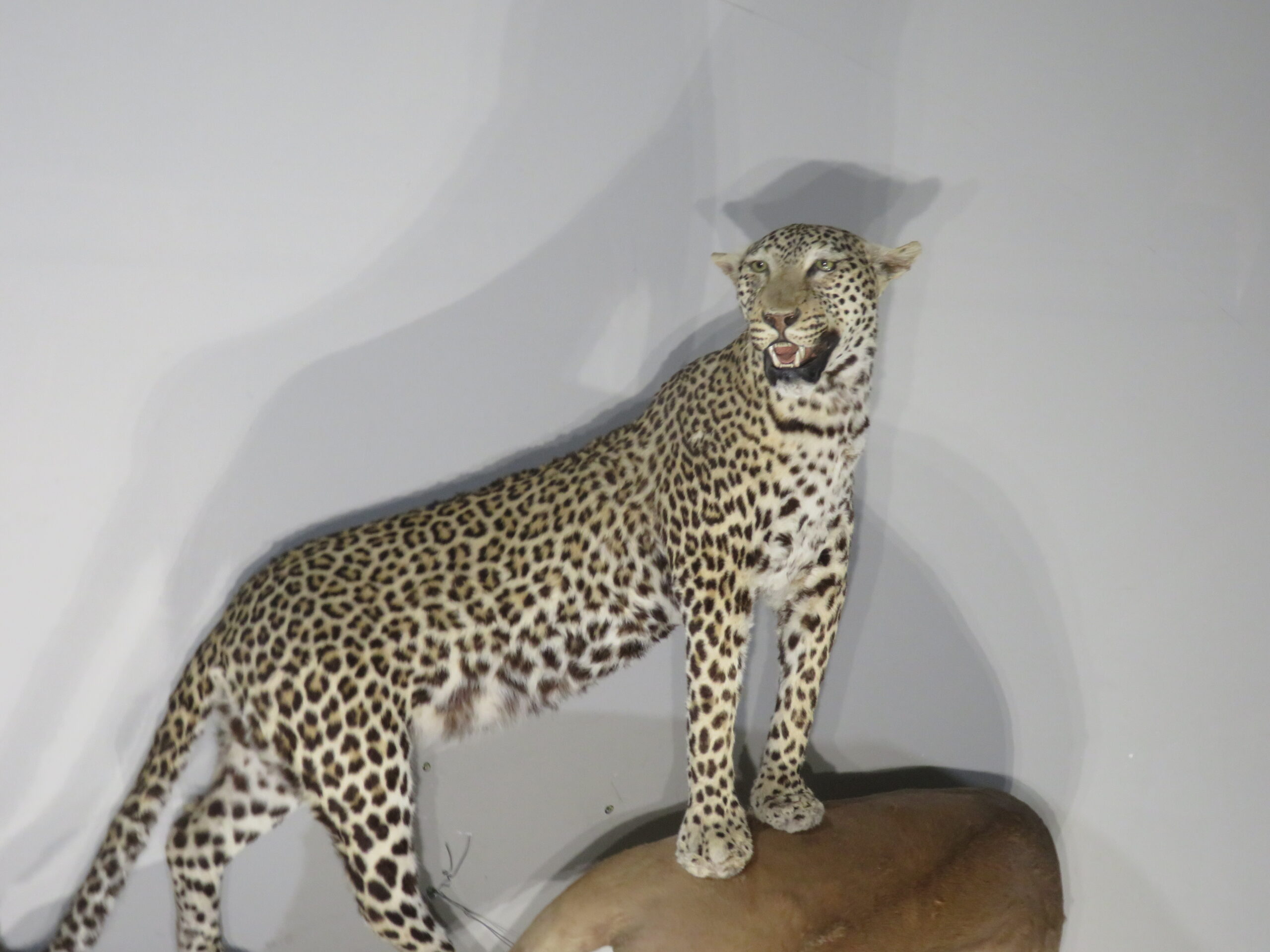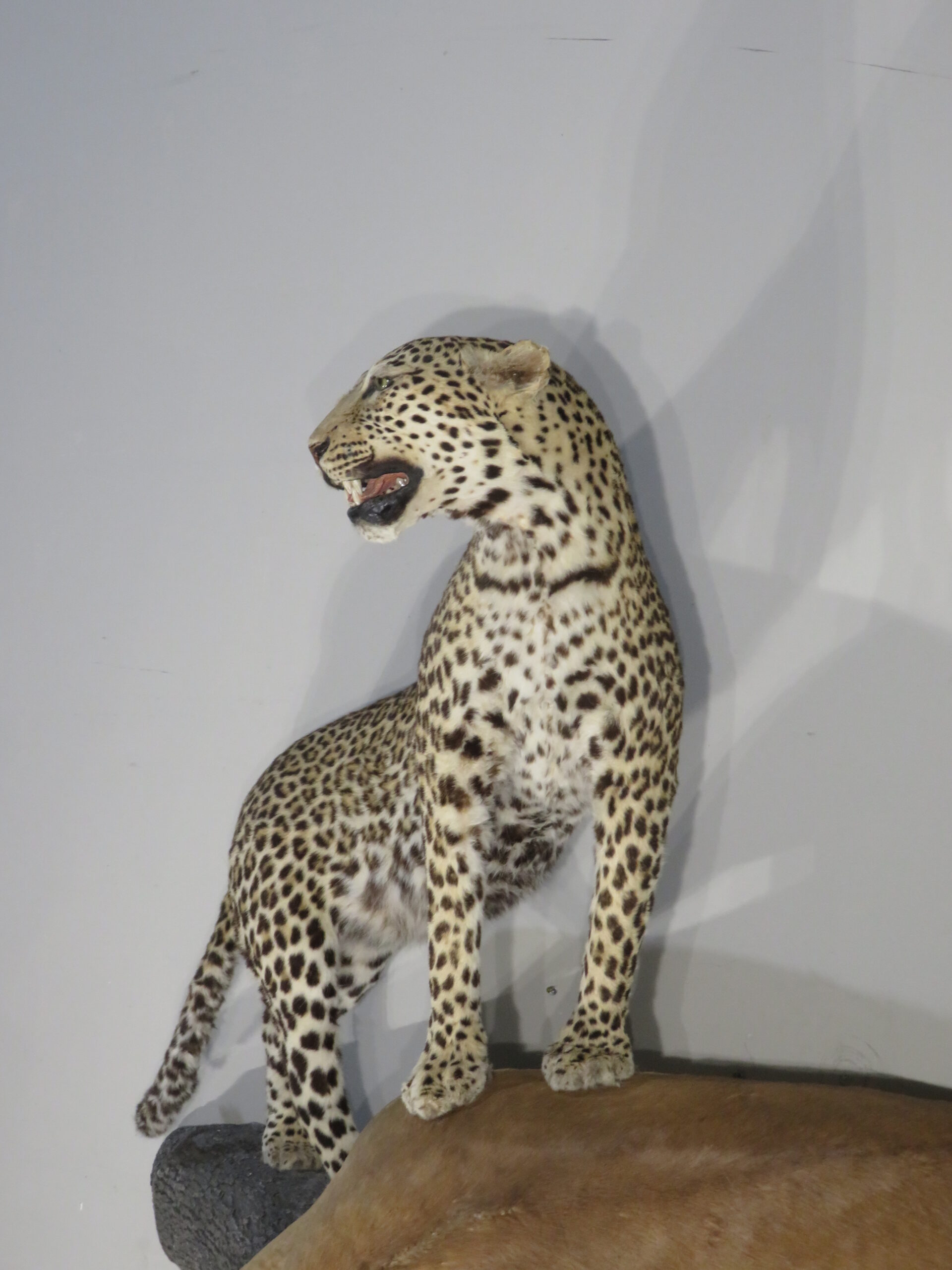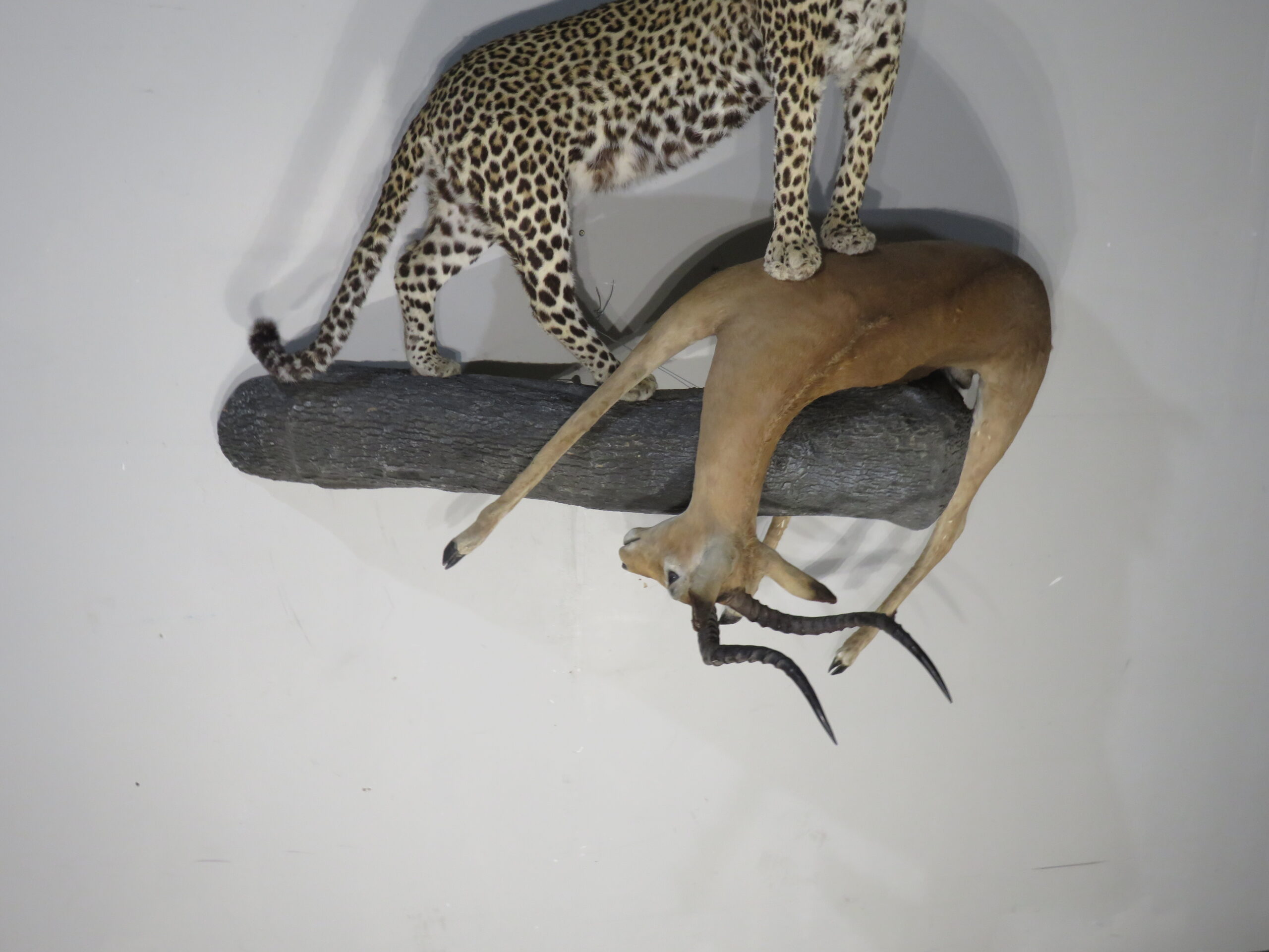 The leopard measures roughly 53 inches nose to tail. It has a small hole in the shoulder that can be seen on the front shoulder. It shows as a small white spot and could be colored in if the owner desires to disguise it. Also the impala has a couple rub spots on the hide that actually make the mount look more authentic, as if it really were drug up by the leopard into a tree. (see attached photos)