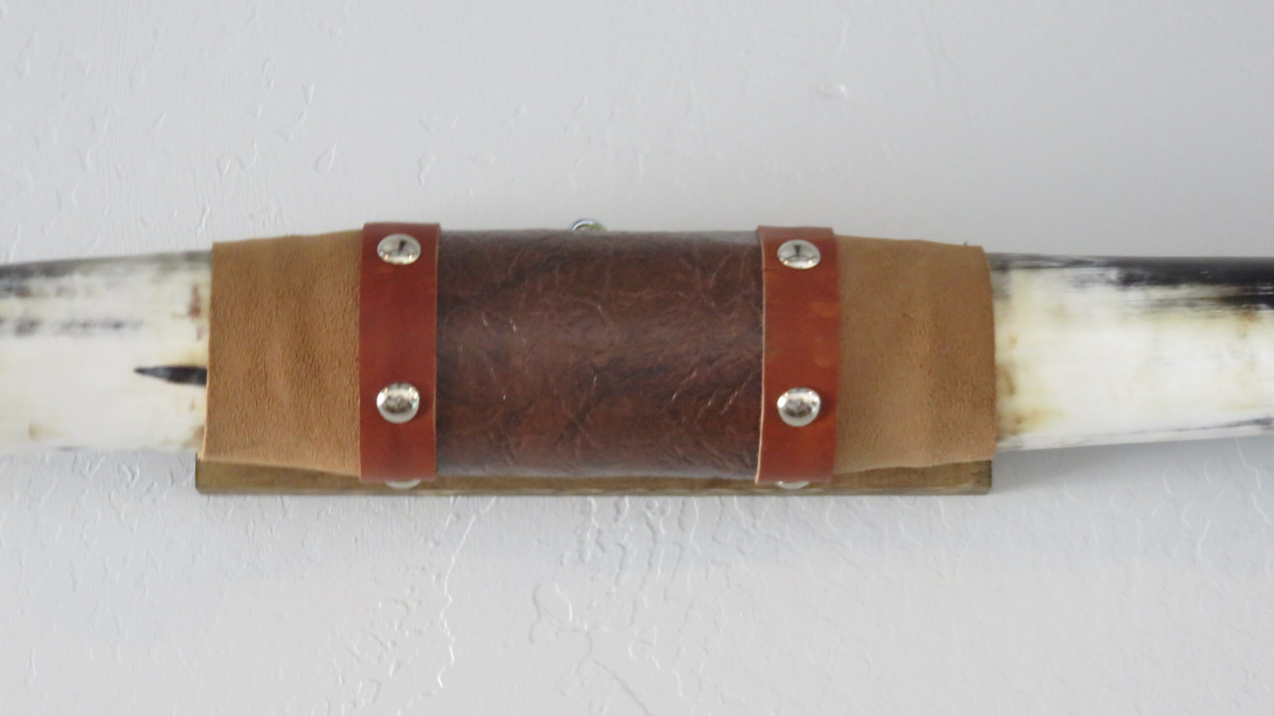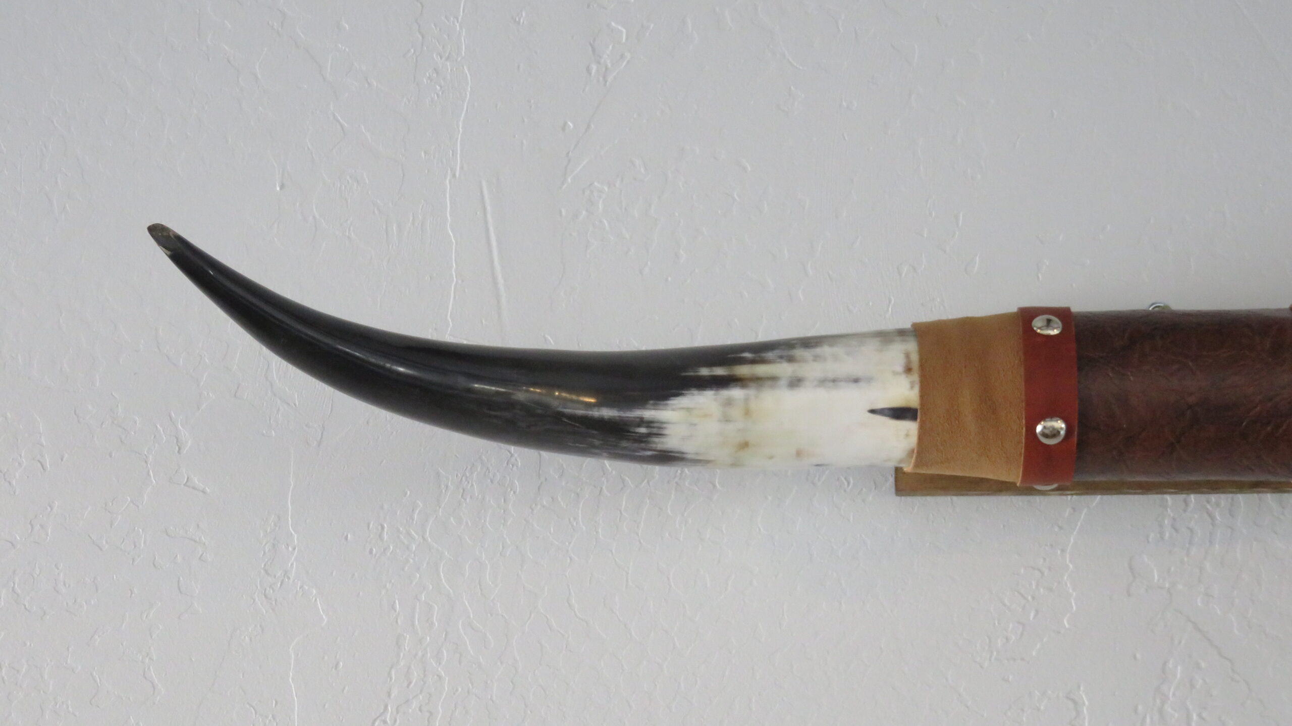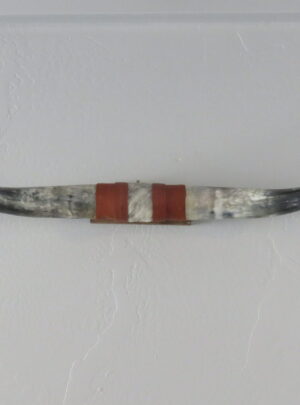 Here is a great looking set of horns that measure 39″ tip to tip. This one has the brown leather wrap with studs (see attached photos). “Medium” sized set of horns for display with the attached bracket.