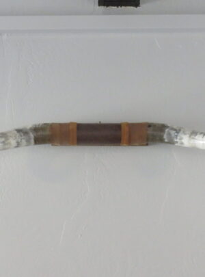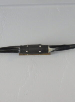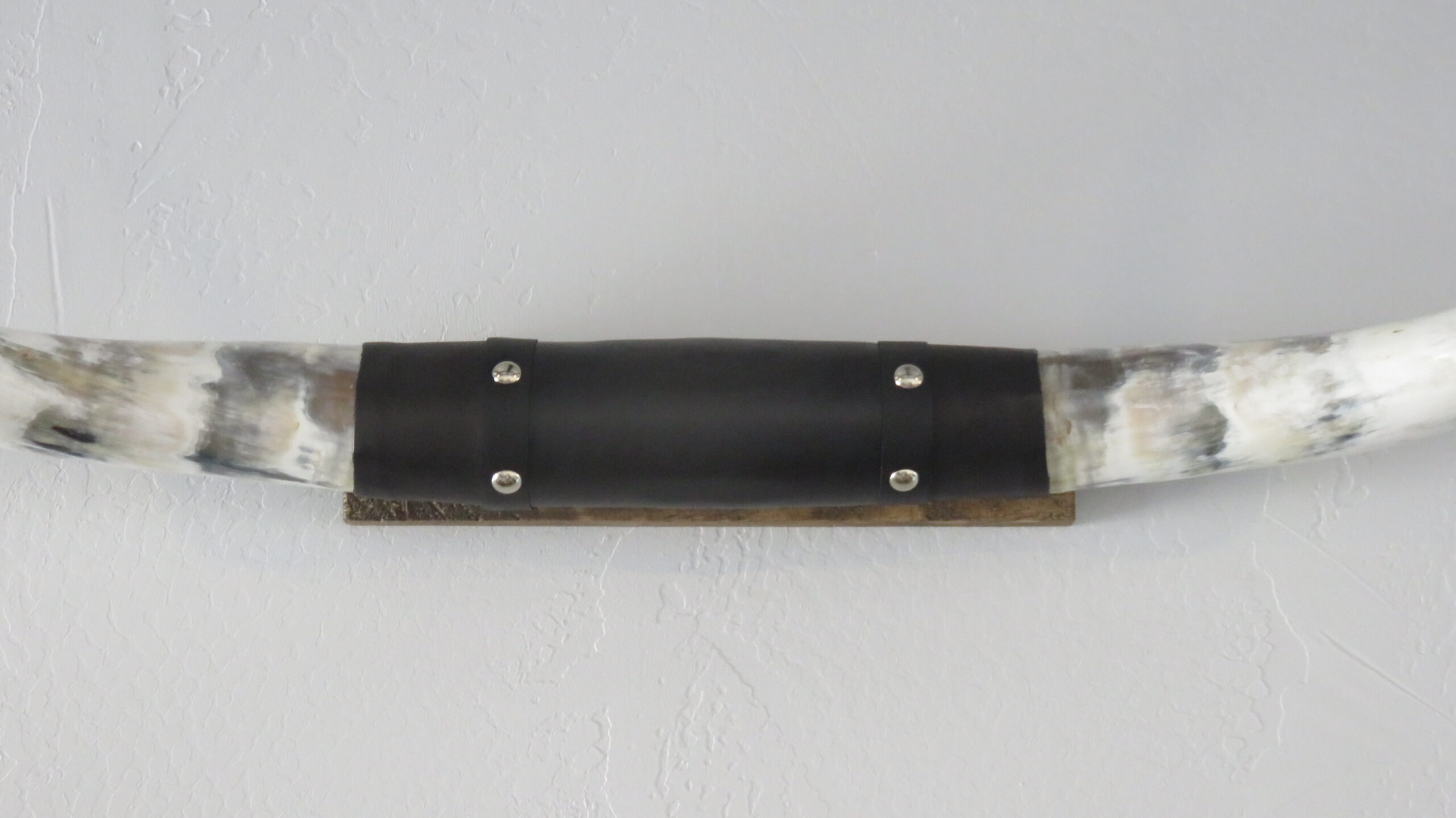 Here we have a great looking set of Texas Longhorns. This pair has a wide curve with a twist back towards each end of the set. A great set that displays a better than average character. Wrap is made from genuine black leather and has studs for accent.