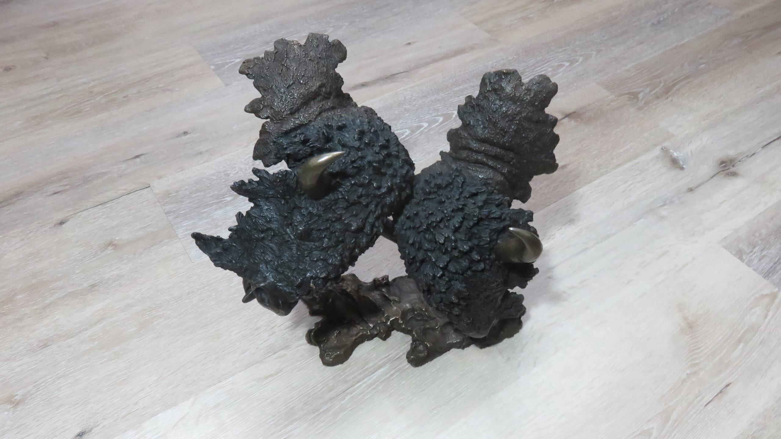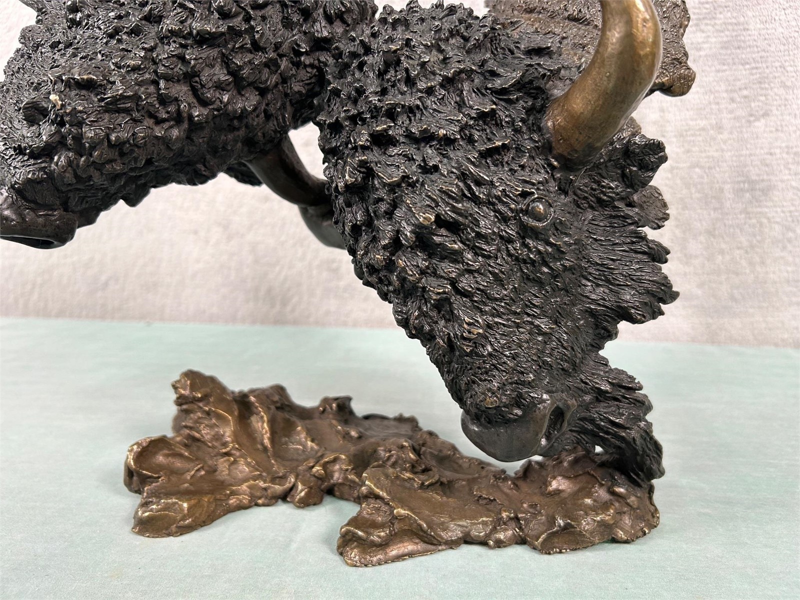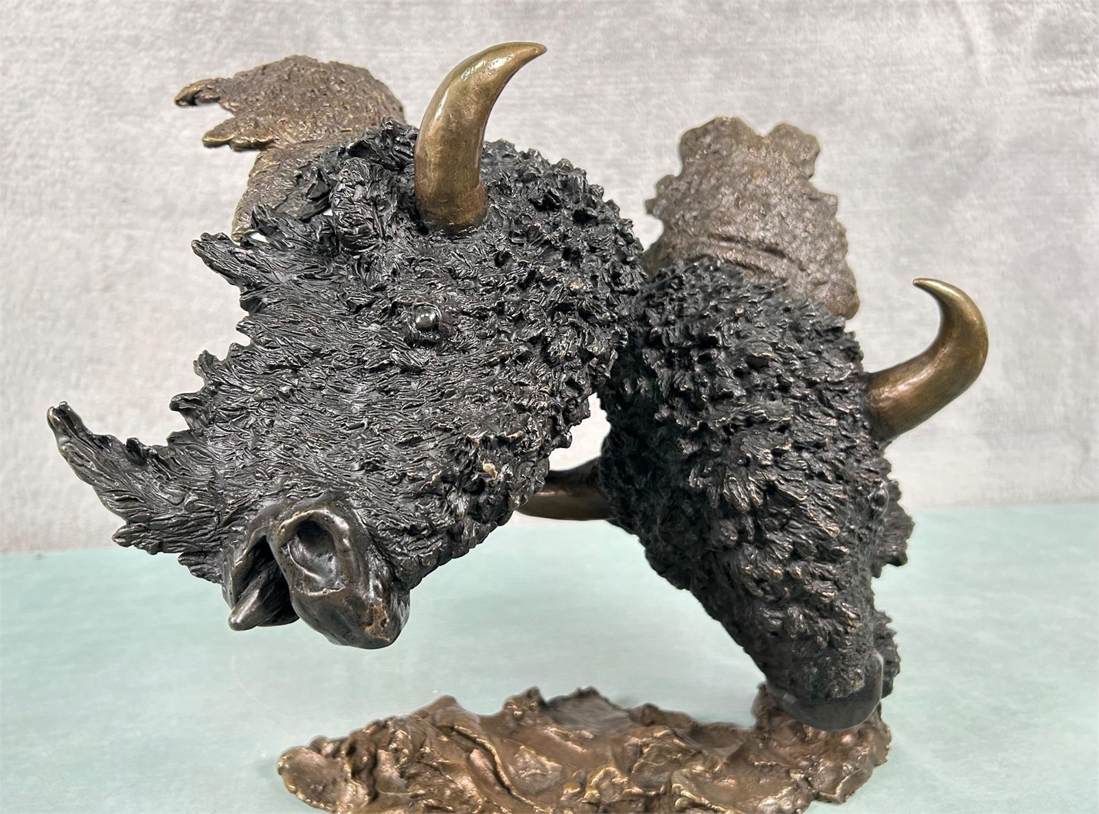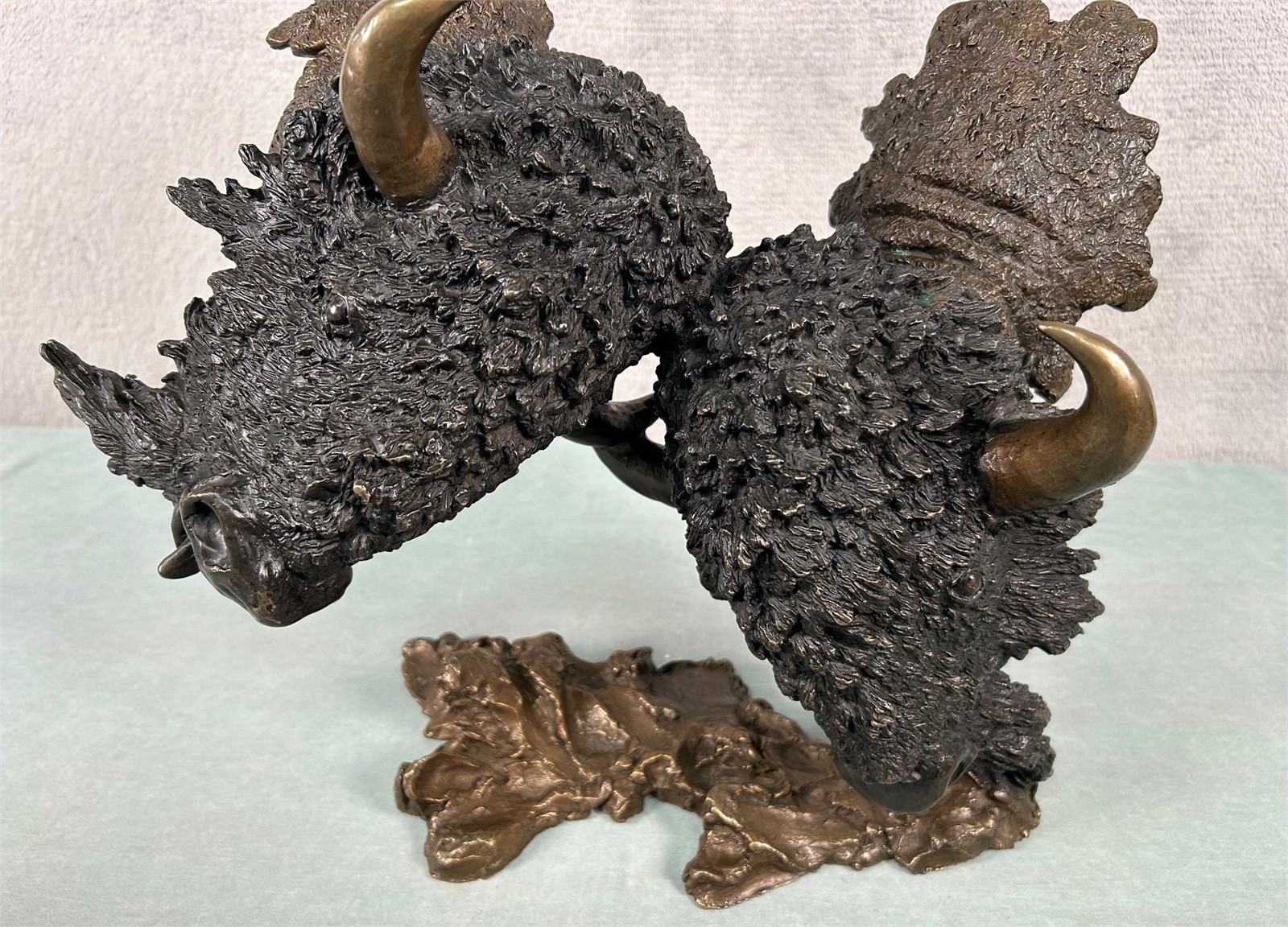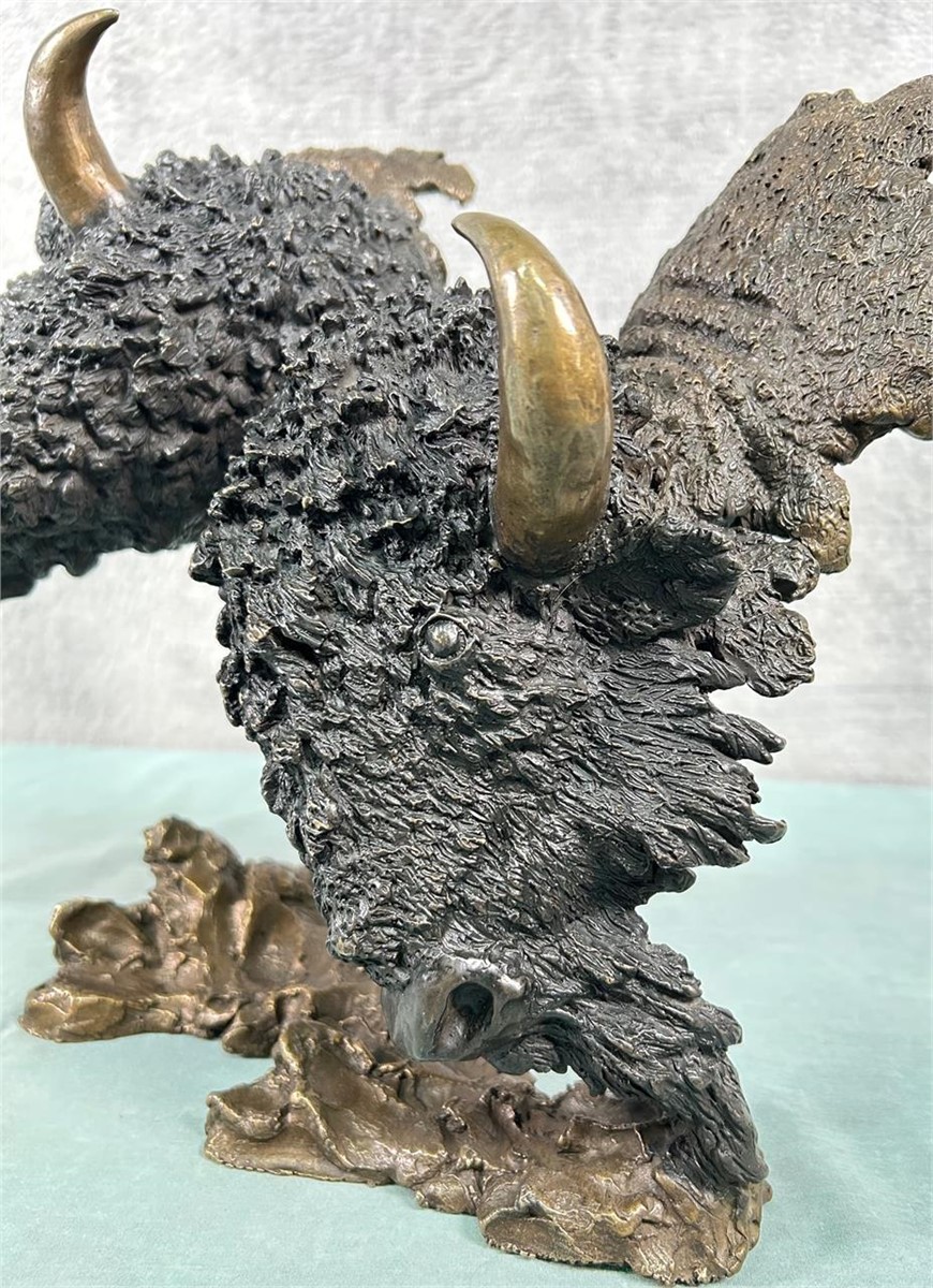 Here we have a great wildlife art item tilted “Buffalo Supremacy” by Mark Hopkins! This is a beautiful, limited-edition bronze featuring 2 bison (North American “Buffalo”) fighting. Overall bronze size measures roughly 12 1/2″ high, 14″ wide and 9″ deep. Item depicts a pair of bull bison that are butting heads. Polished horns accent the dark brown look of the two (see attached photos). Item is artist signed and numbered 132/450.
