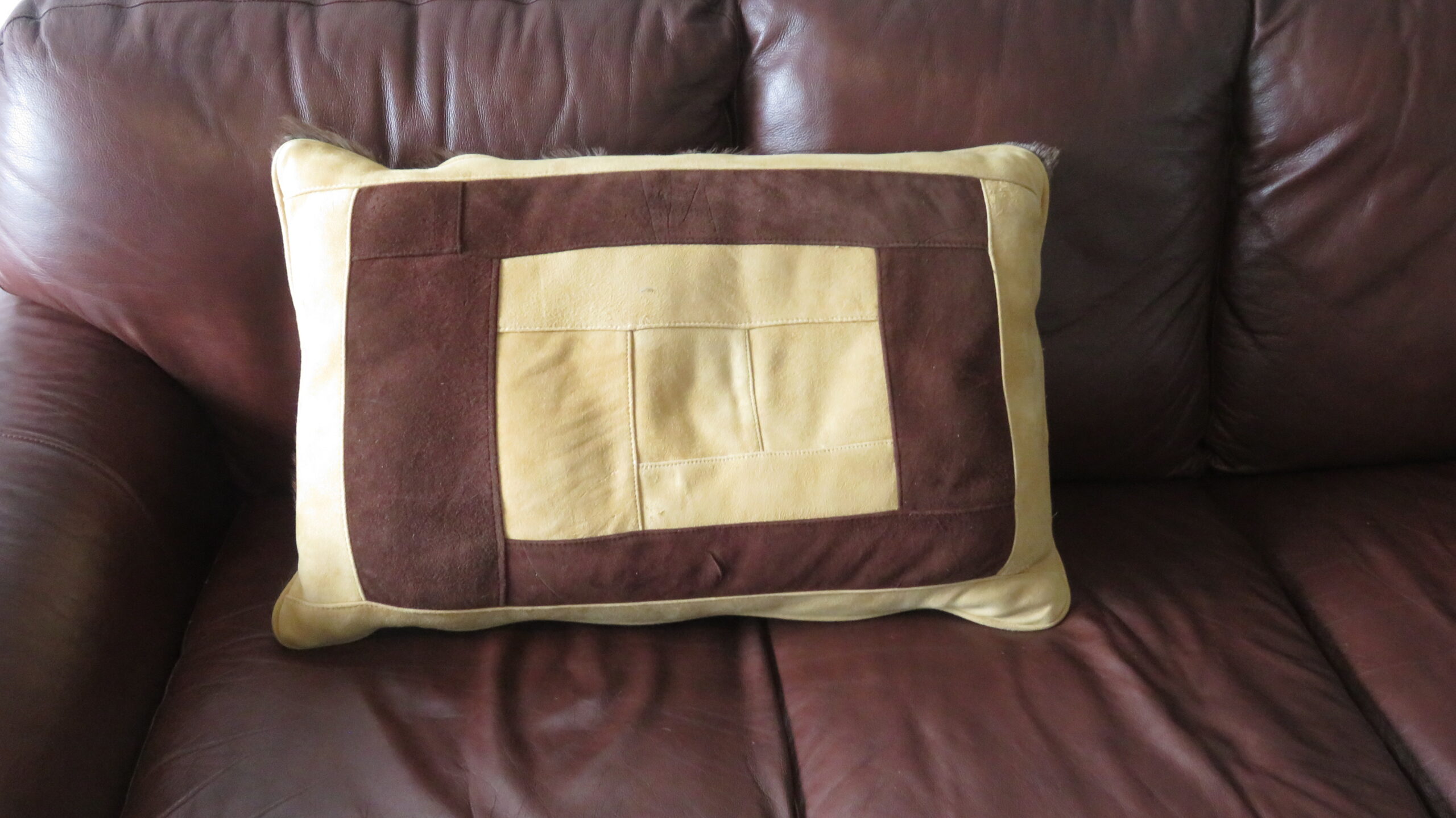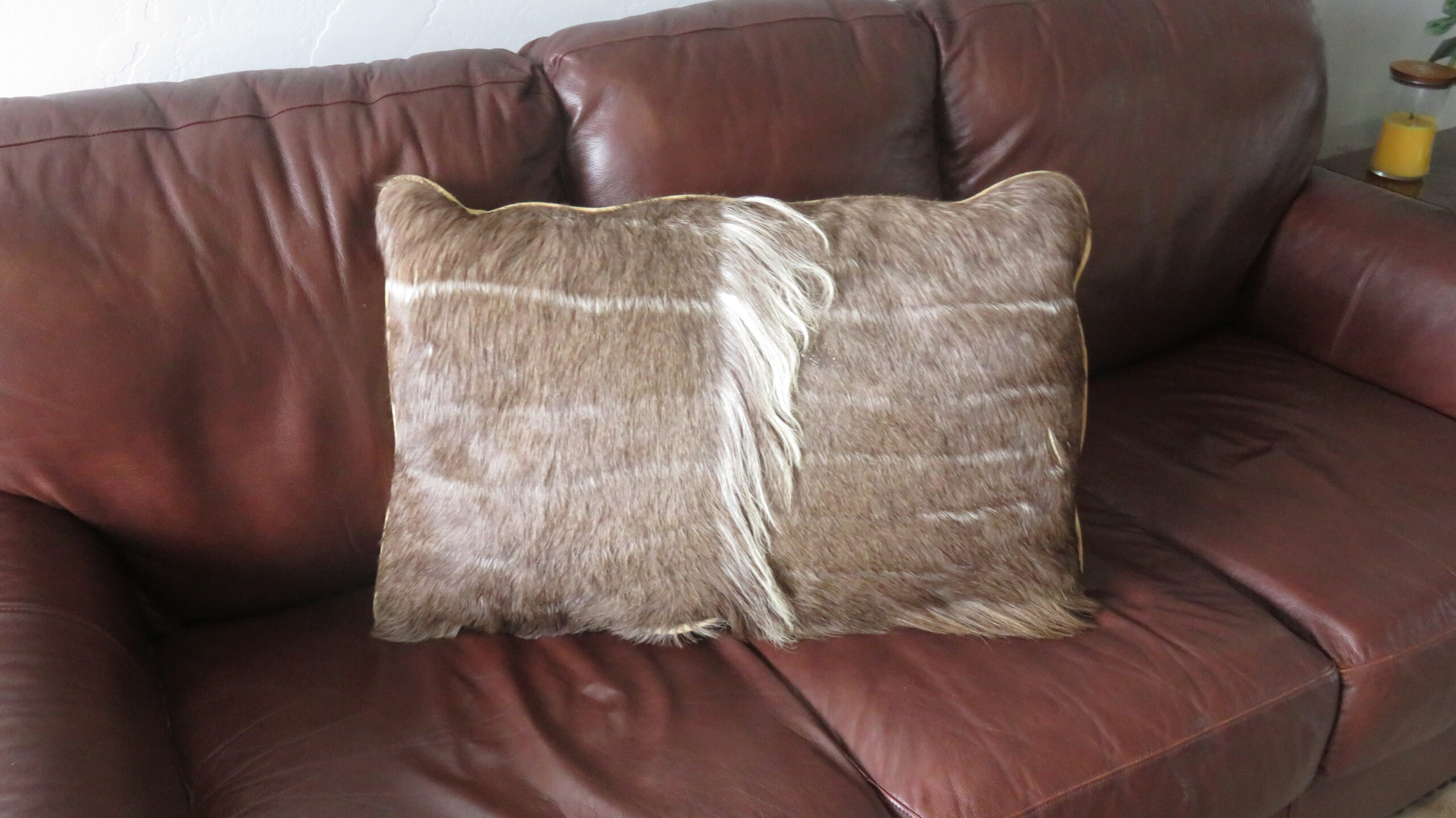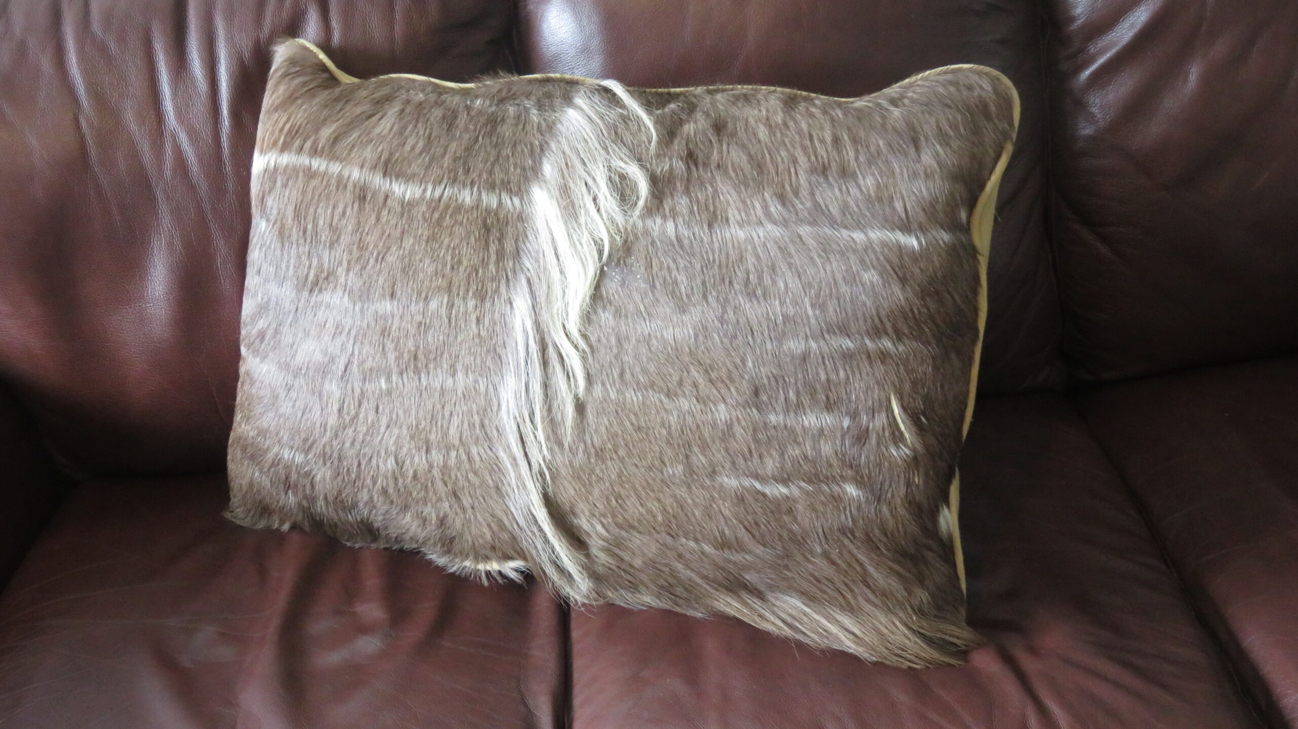 Here we have a beautiful Nyala hide pillow. Great item for the lodge, mancave or showroom to display. Pillow is faced with a large section of Nyala hide (or skin) that measures roughly 26″ x 16″. The back of the pillow has a great design made from suede leather with tan and brown colors (see attached photos). There is a cut on the front hide where the individual doing the skinning cut thru the face of the hide. It is solid and won’t separate any more than what is seen now, but I wanted to make sure that it is seen and known about in advance. Still this is a beautiful pillow and great display item.