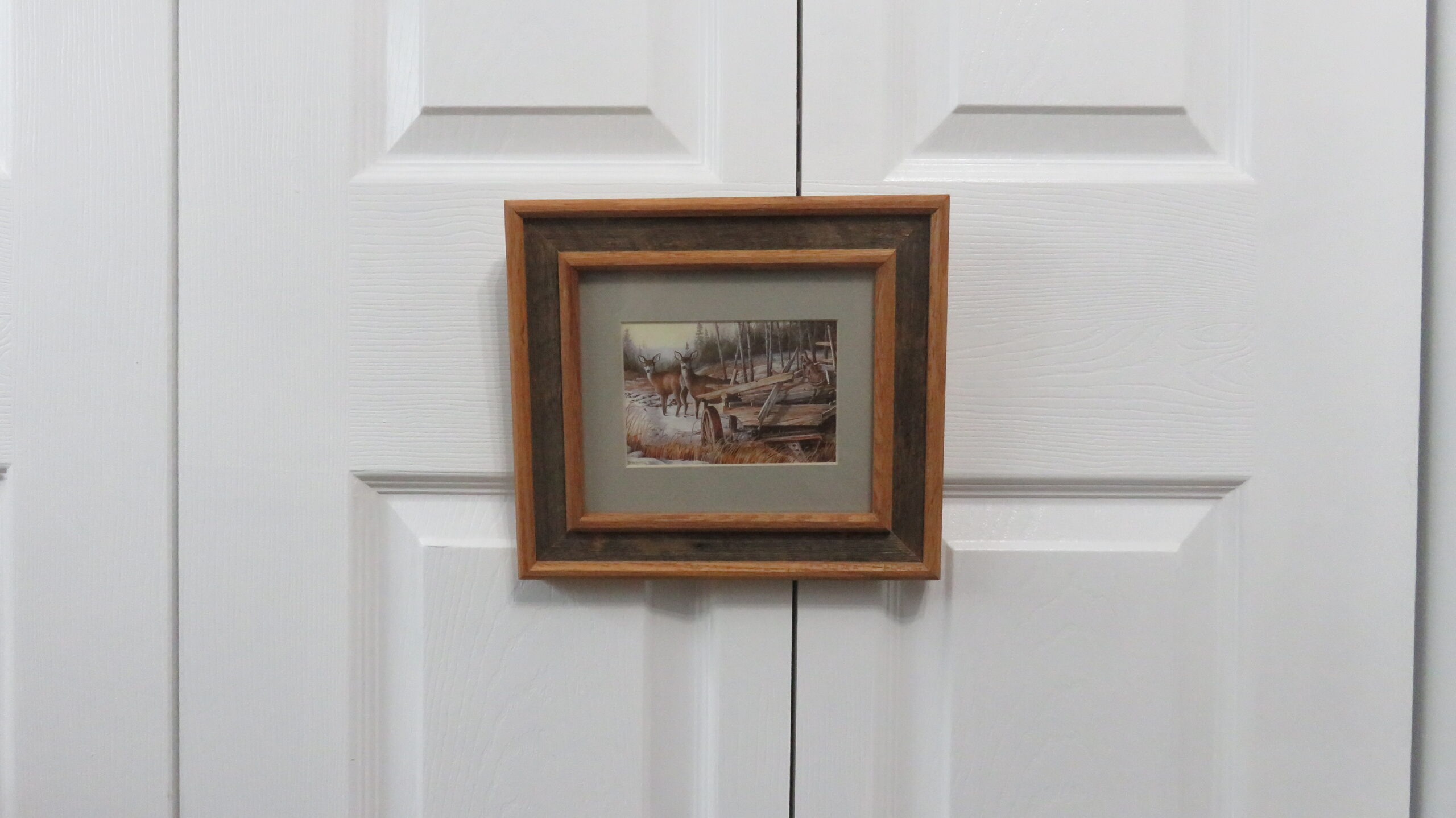 Image size is approximately 4 3/4″ wide and 3 1/4″ tall. Overall frame size is roughly 9 3/4″ x 8 3/4″ tall. Buy this art print for the lodge, cabin or mancave.