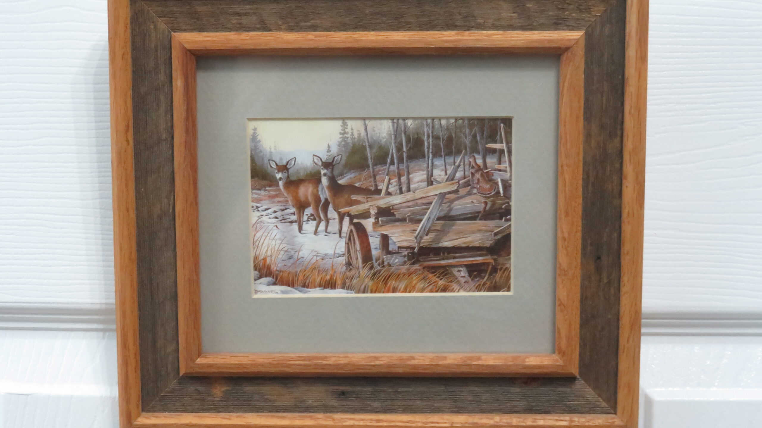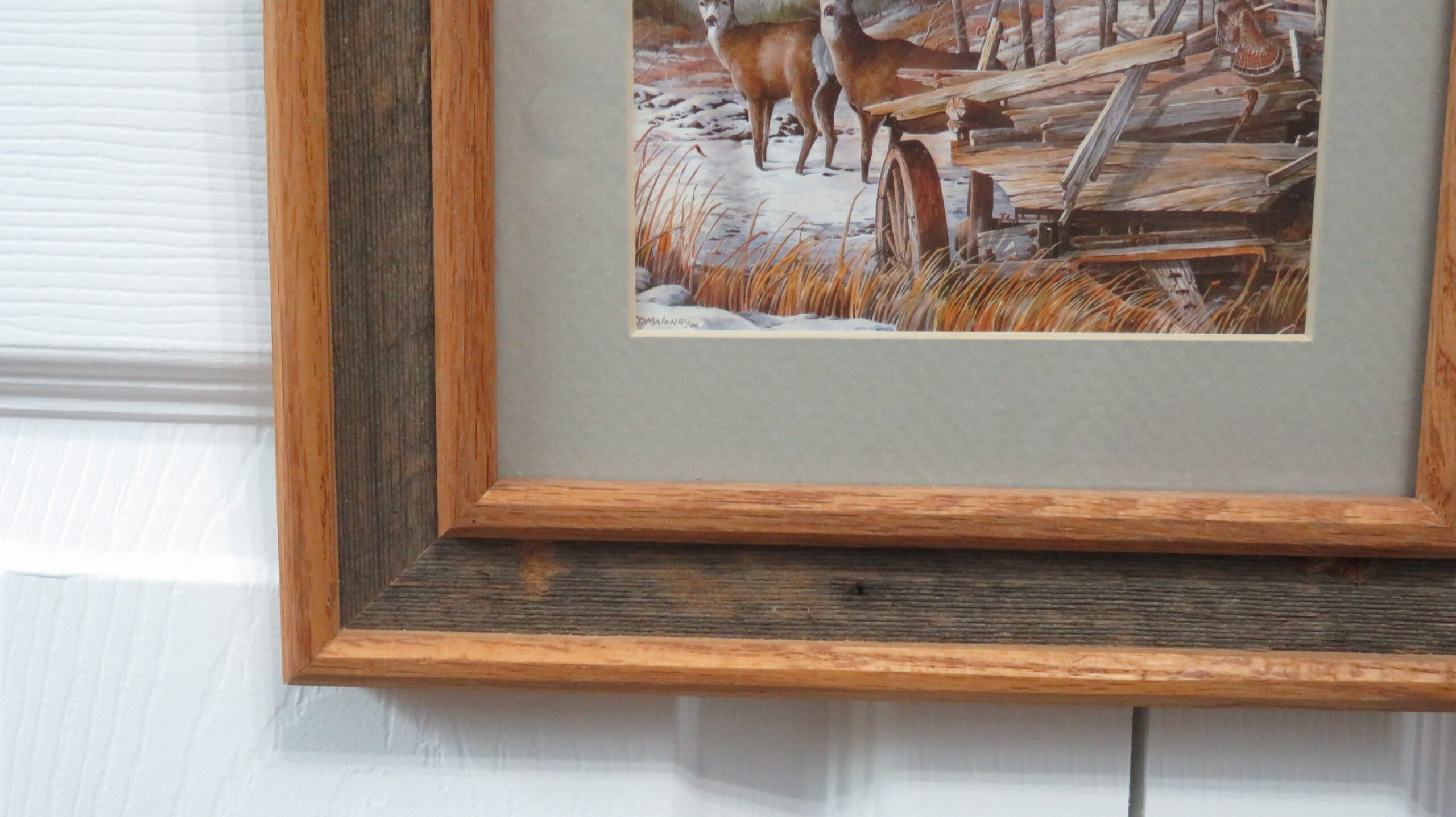 This is a framed art print by Montana artist Dave Maloney. Print is titled “Old Wagon, Ruff, & Mulies” and is dated ’86. Scene depicts a couple mule deer in woods with a ruffed grouse on a wagon in the foreground. Frame features barnwood and oak solid wood construction.