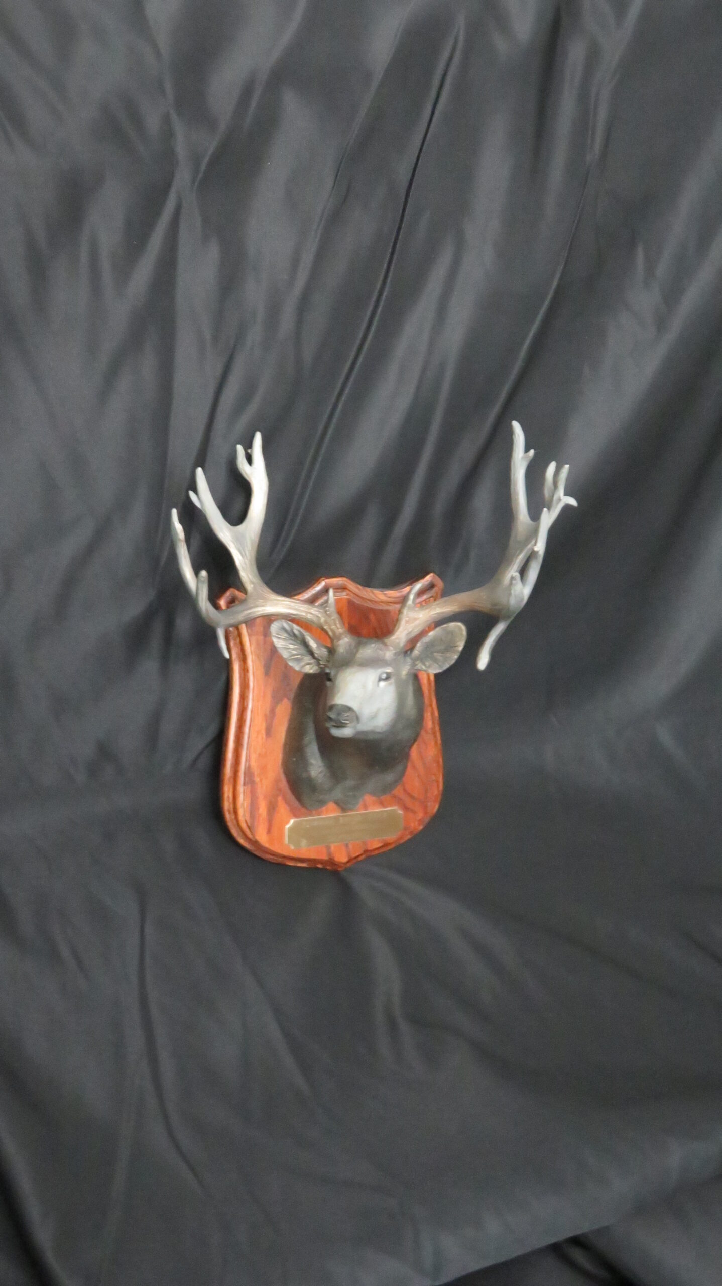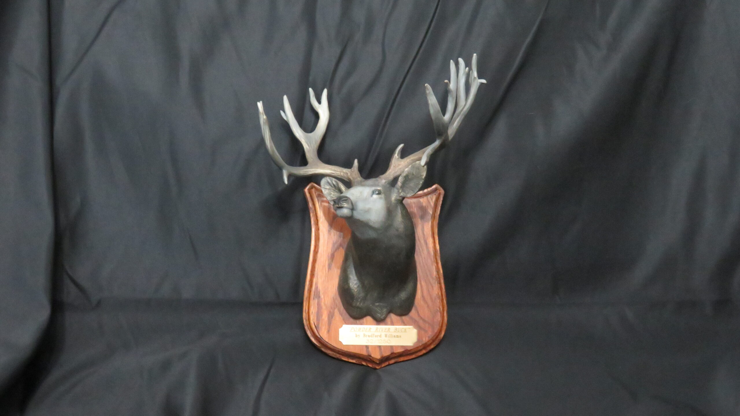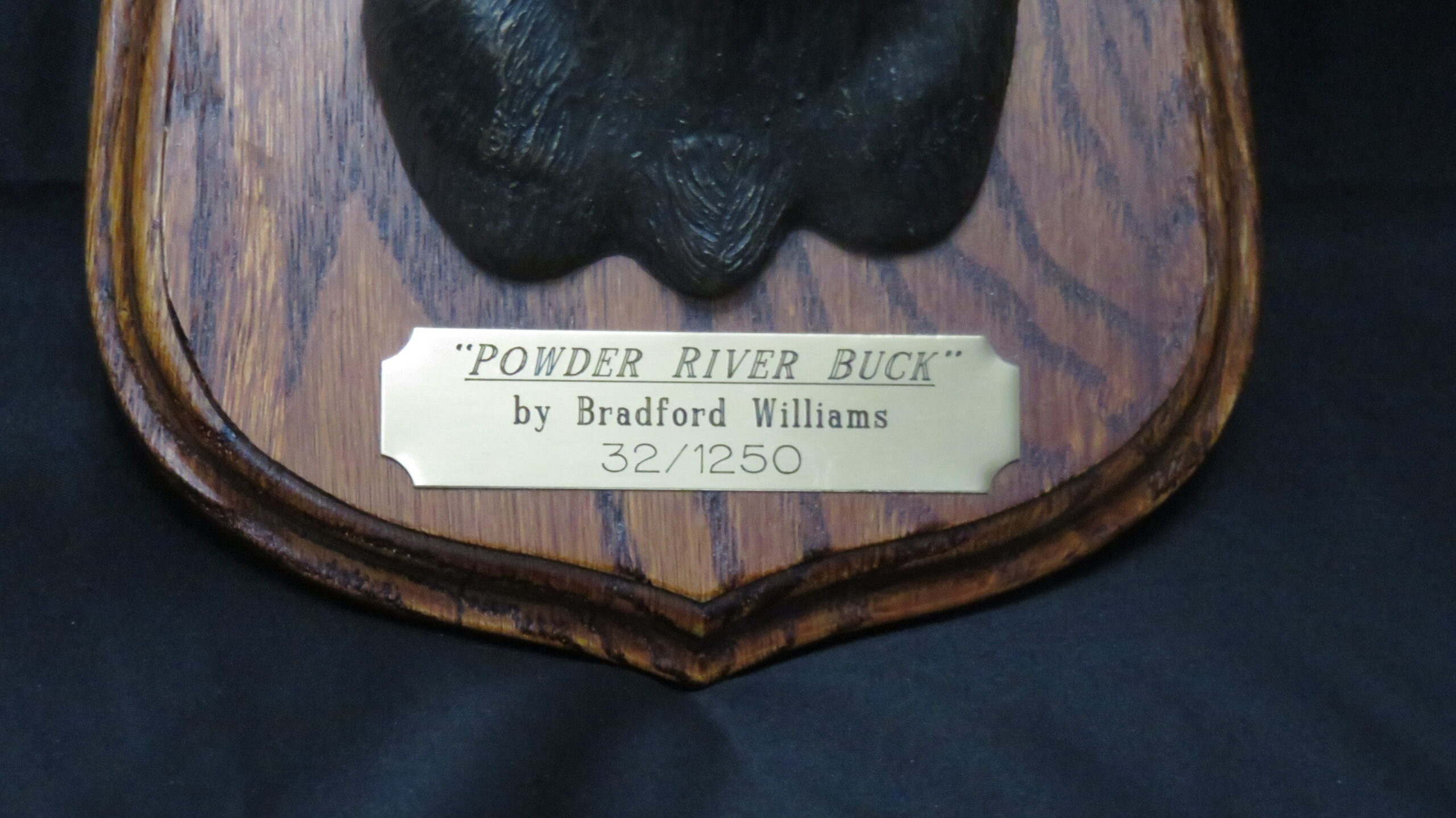 Here we have a piece titled “Powder River Buck” by artist Bradford Williams. Produced by Big Sky Carvers, this sculpture has a limited edition of 1250, with this being #32 (see attached photos). This wall hanging art piece has a solid wood back and hangs on a single fastener (nail or screw). A great sized mule deer bust with a turned head looking into the room.