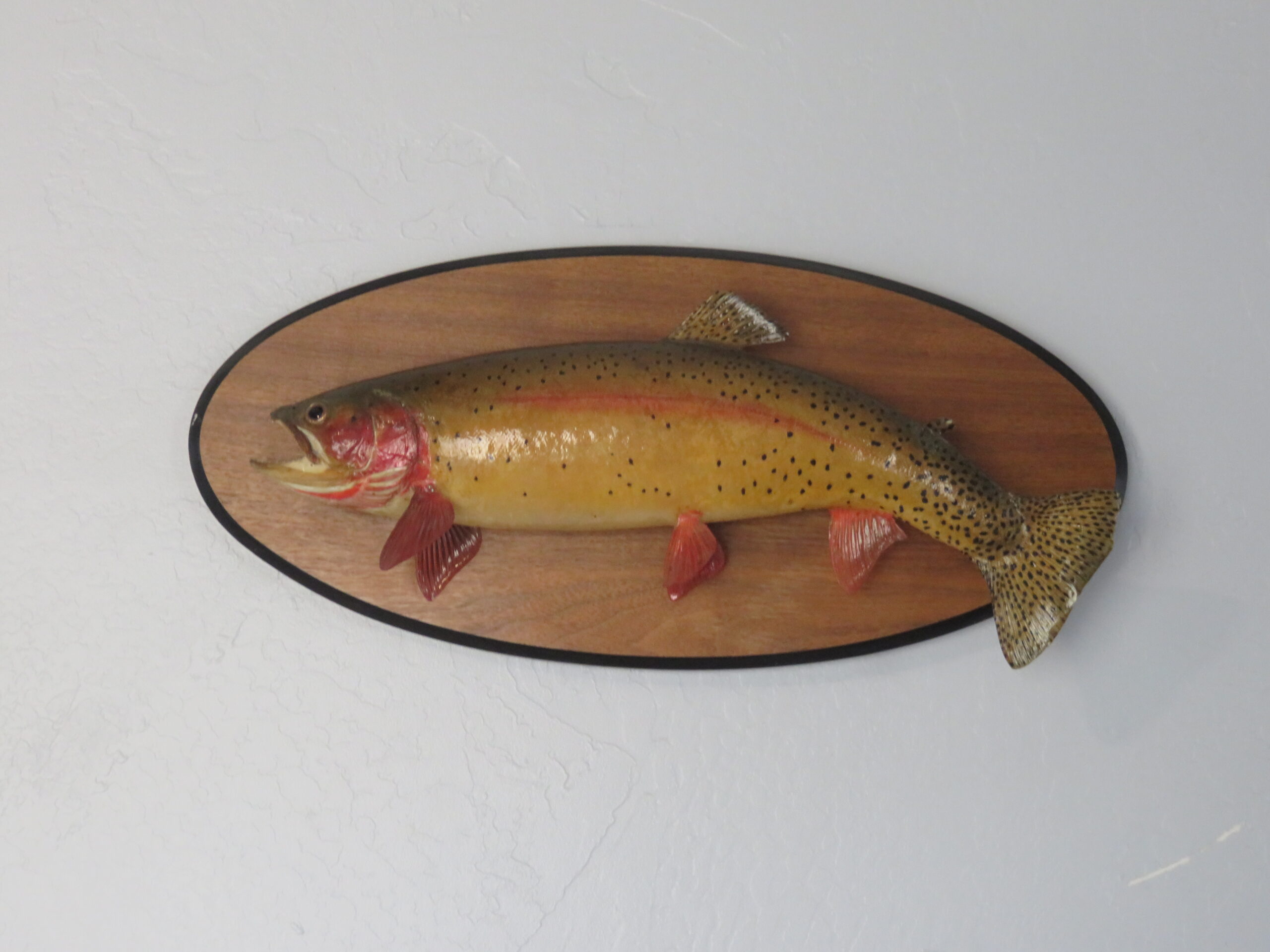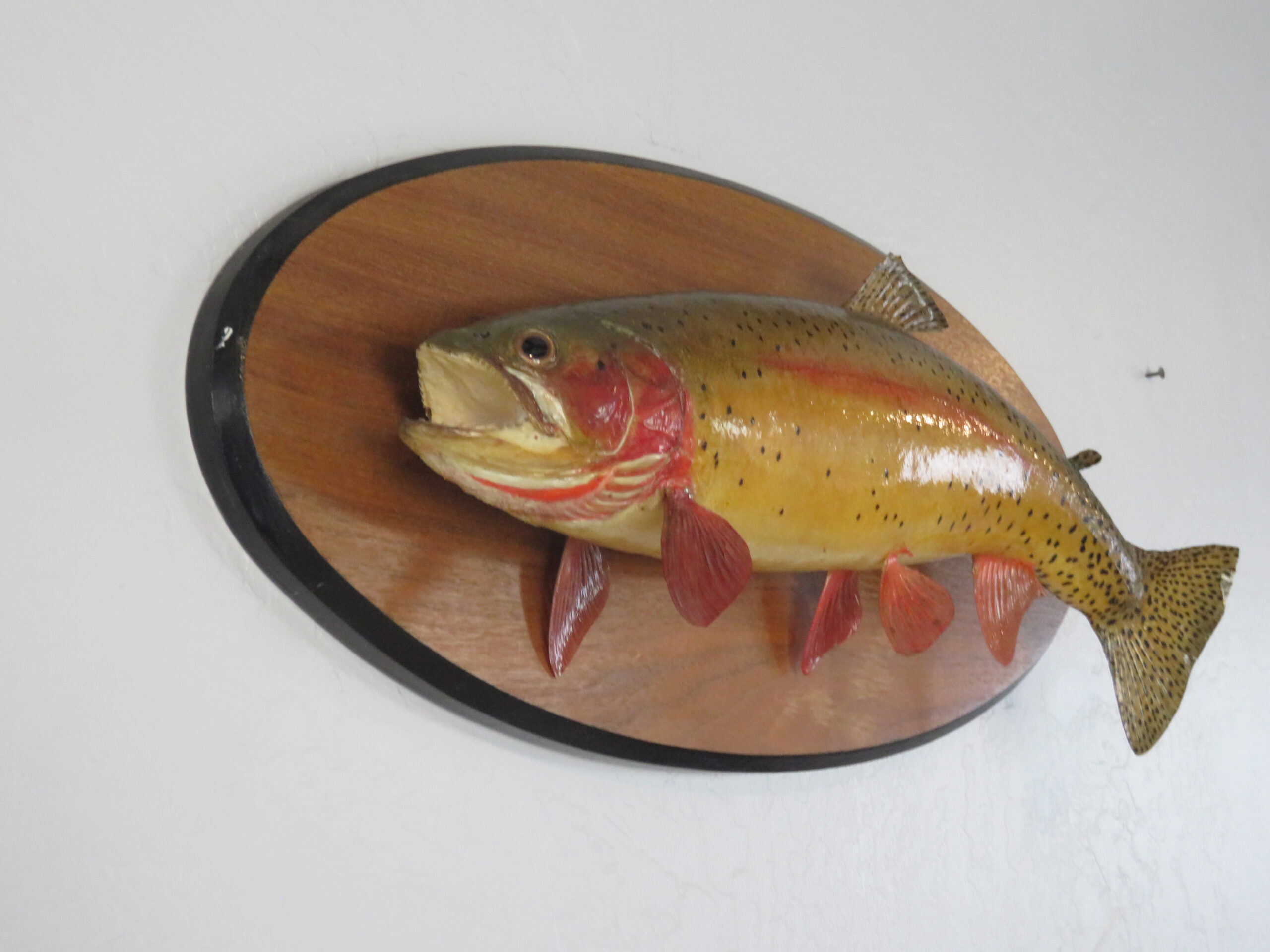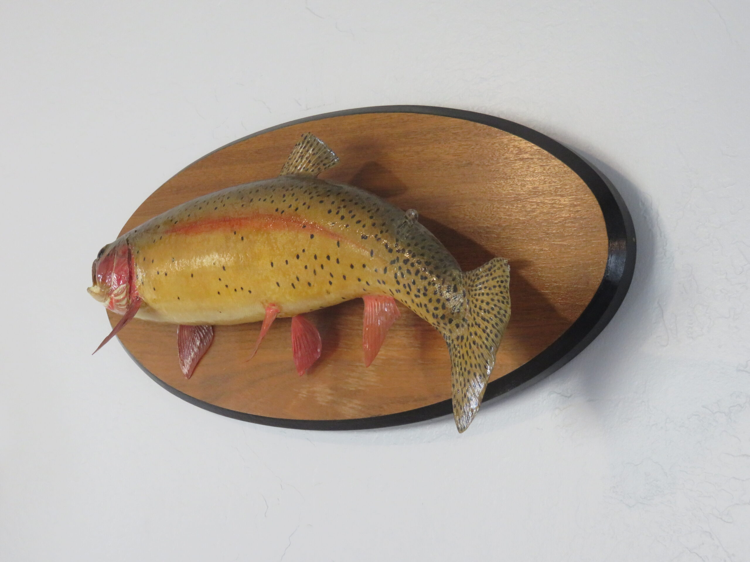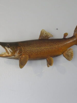 Here is a 18″ trout on a solid wood plaque. This is a real skin mount. Arched body with the tail down. Fish is aiming across the wall from the viewers’ right.
