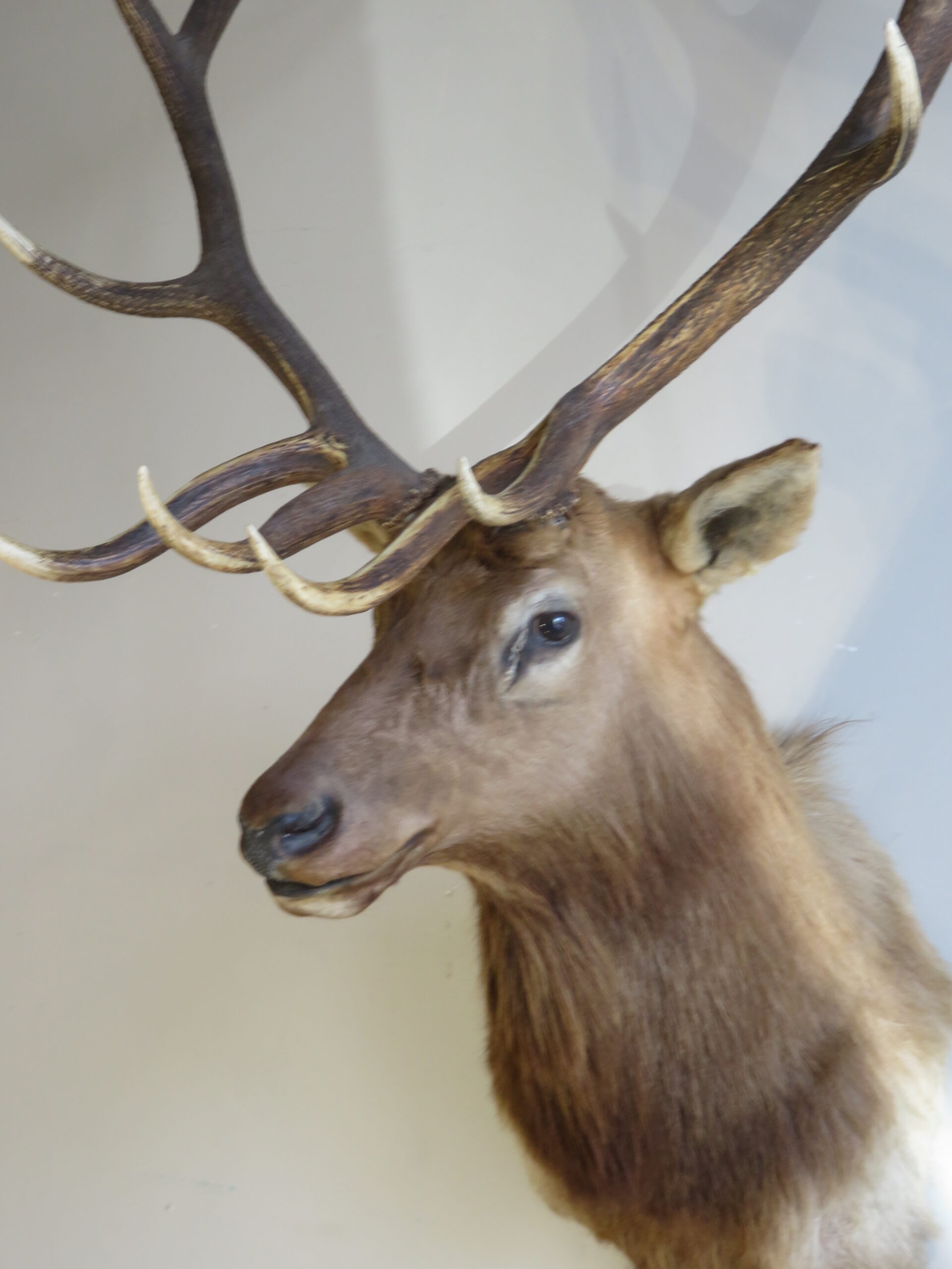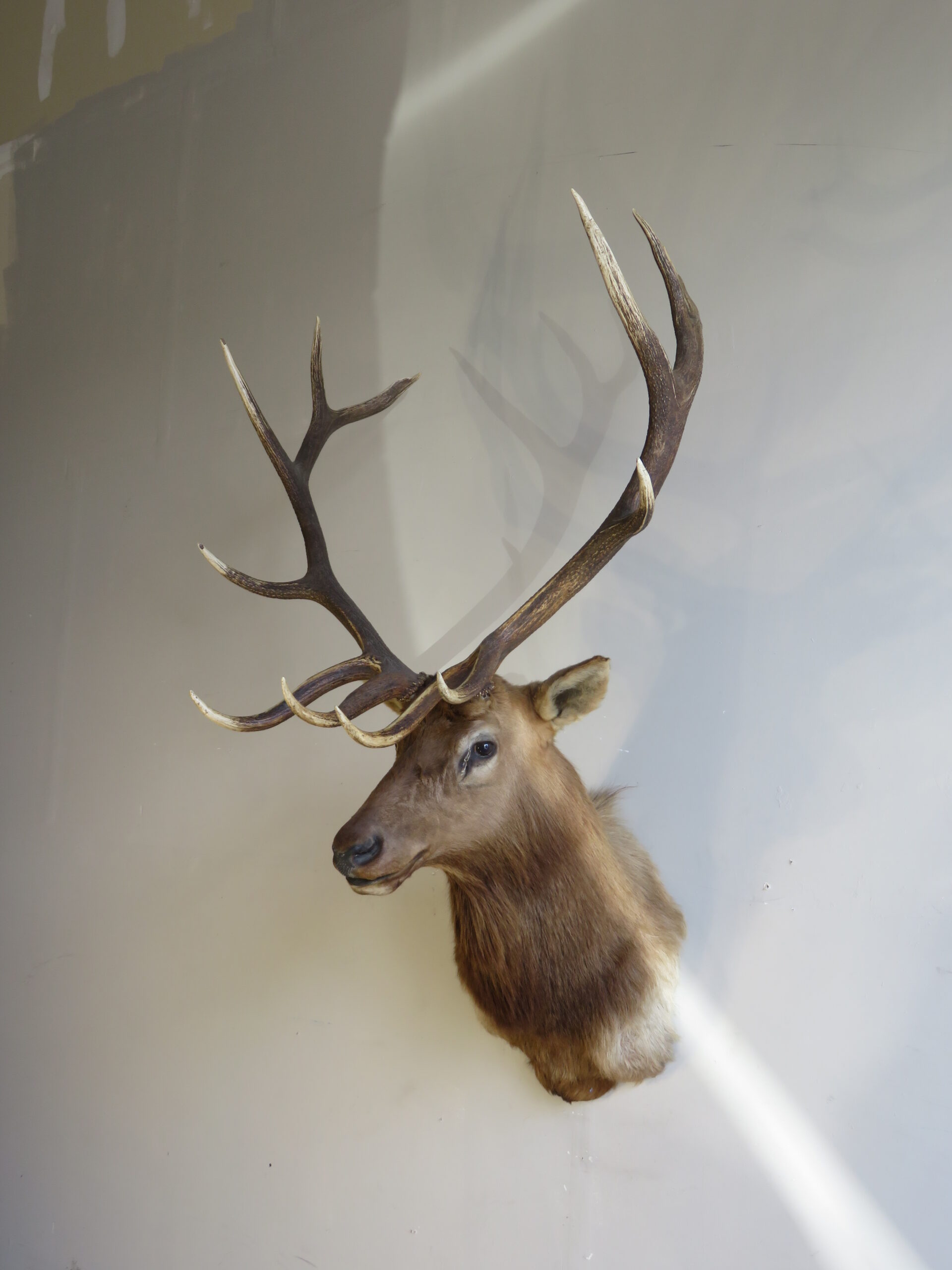 Here we have an older mount of a Rocky Mountain Elk. It has a great rack that is a 6 x 7. Mount is posed with head up and looking forward. Cape is in great condition with good coloring. The one drawback on this older bull is that there is some cracking at the eyes, which is visible when viewed up close (see attached photos). Other than that, he is in great shape and will display well for years to come…
