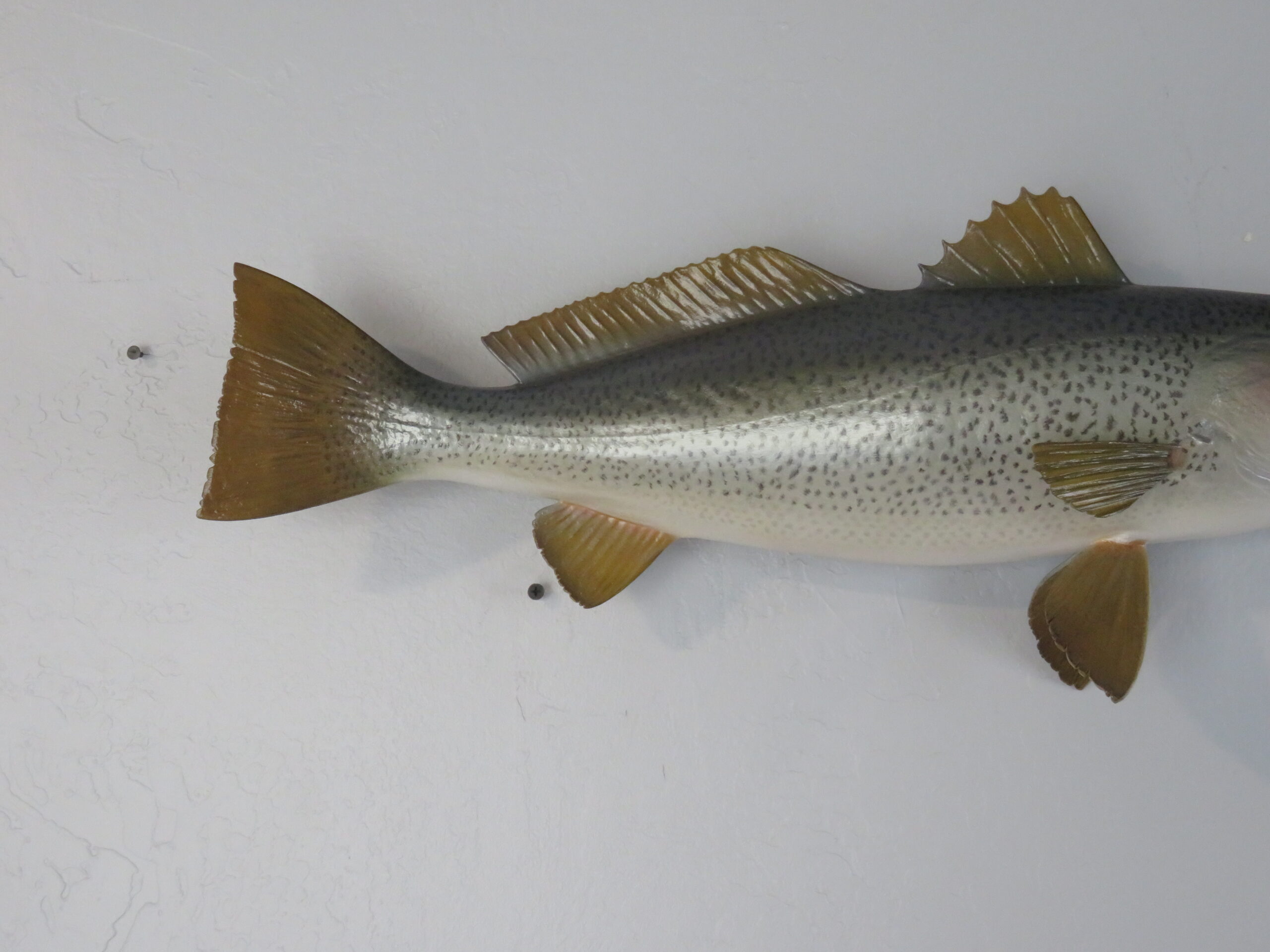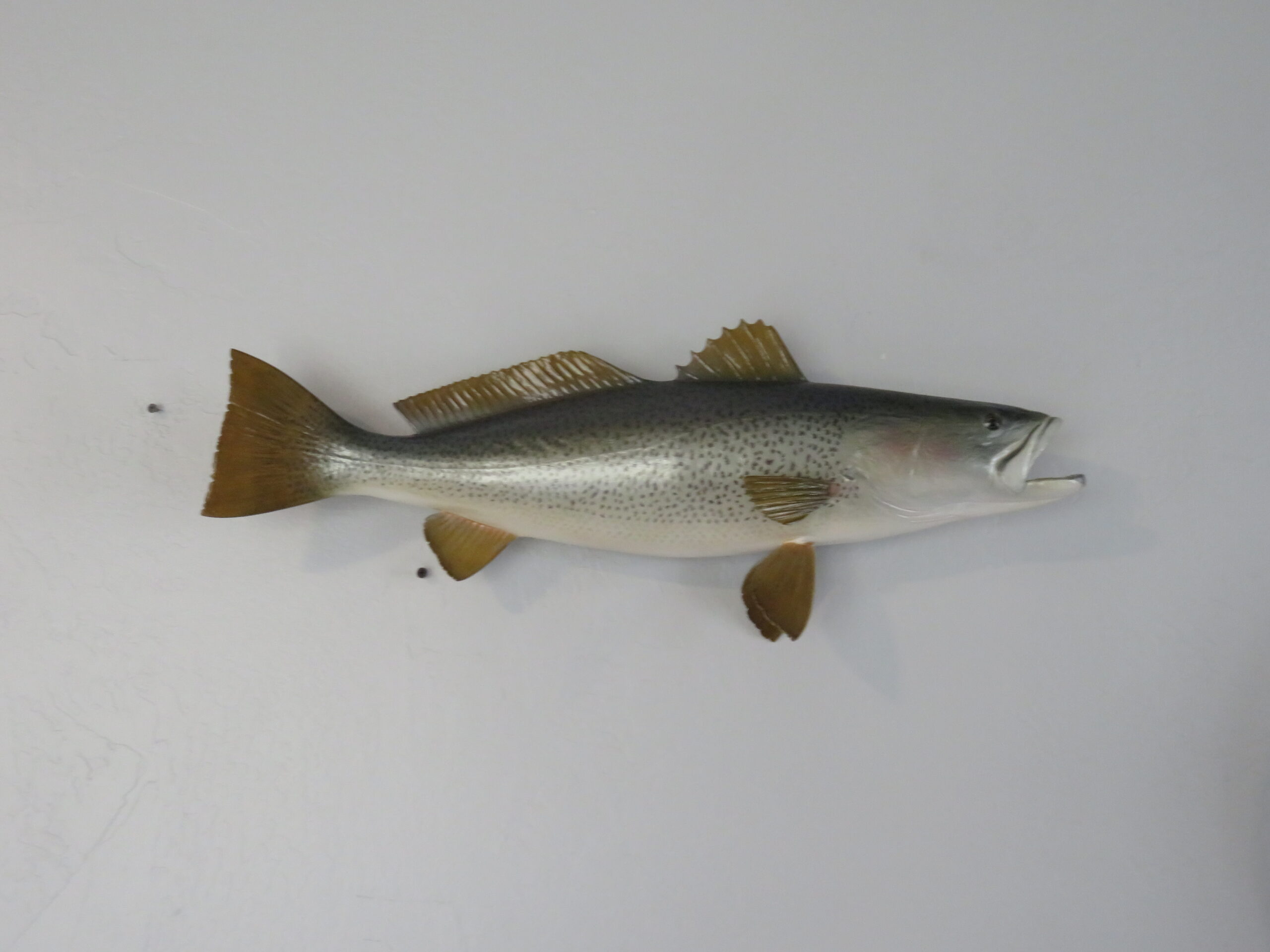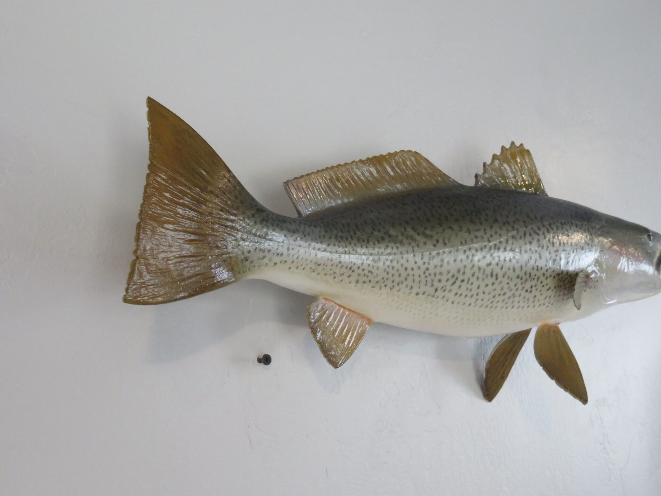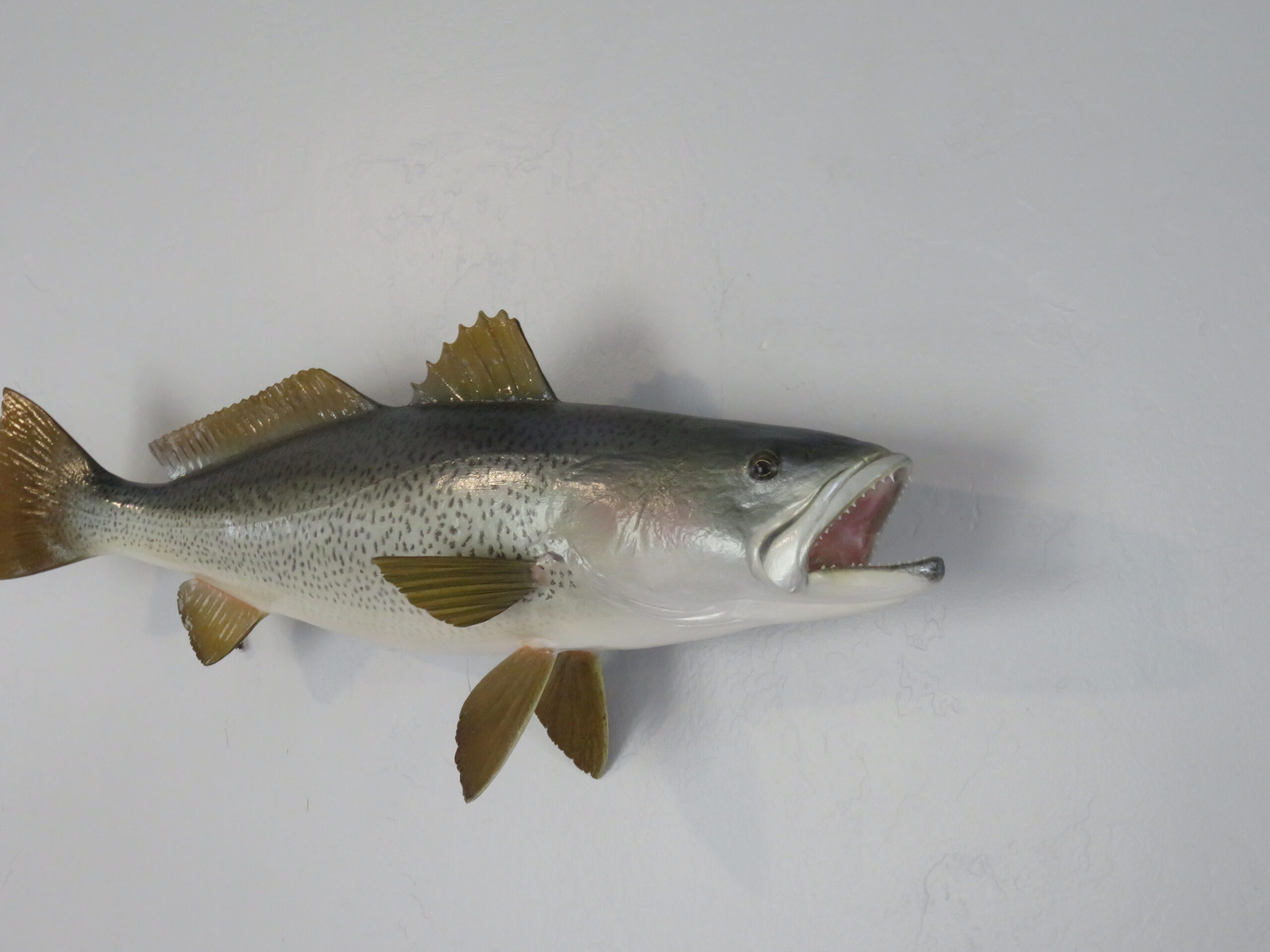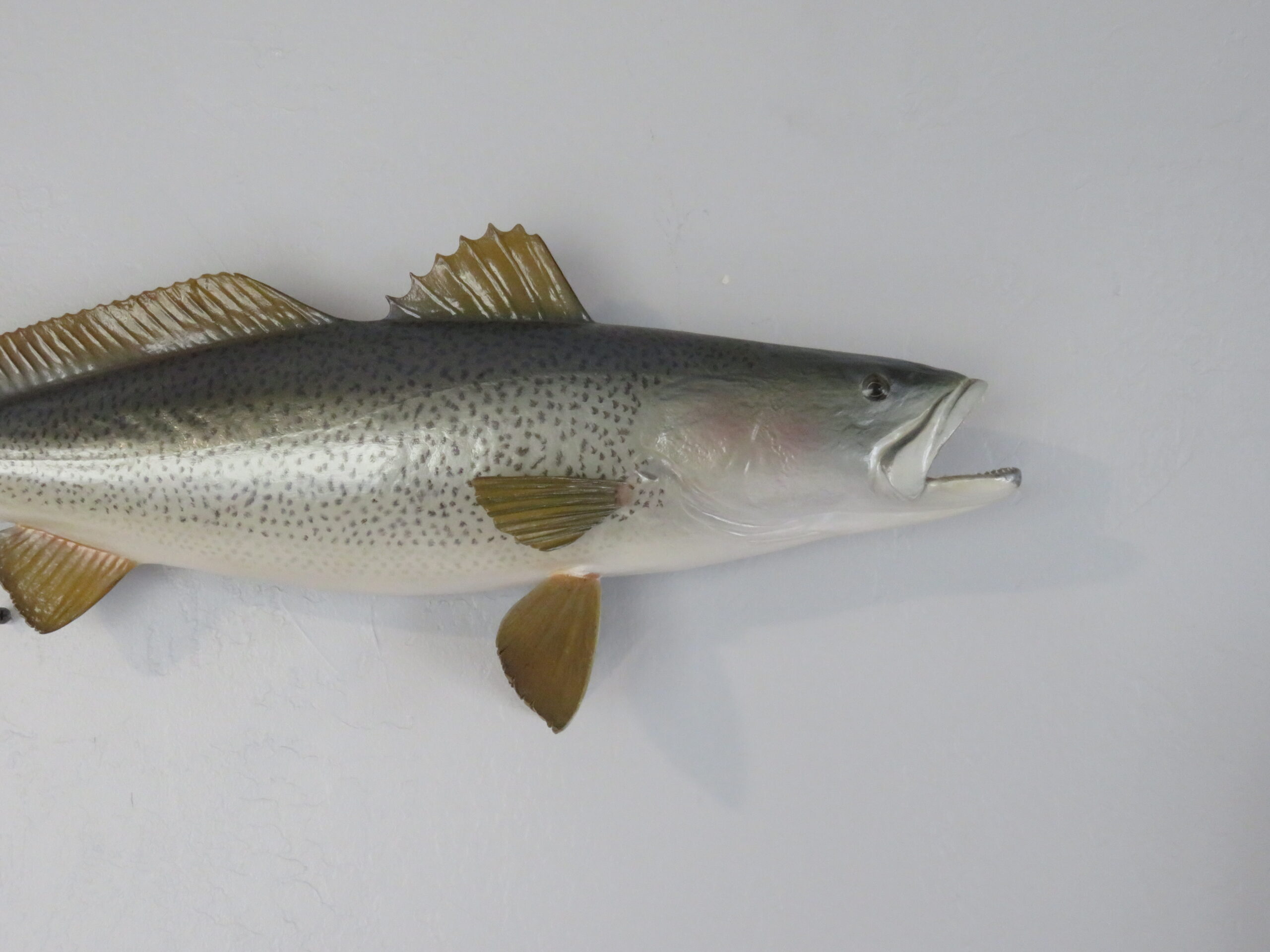 Here we have a great looking Sea Trout that was taken off the coast of Delaware. This is a real skin mount that measures 24″ (inches) long. Live weight was 7 3/4 pounds. Body has a slight curve to it and faces to the viewers right looking along the wall.