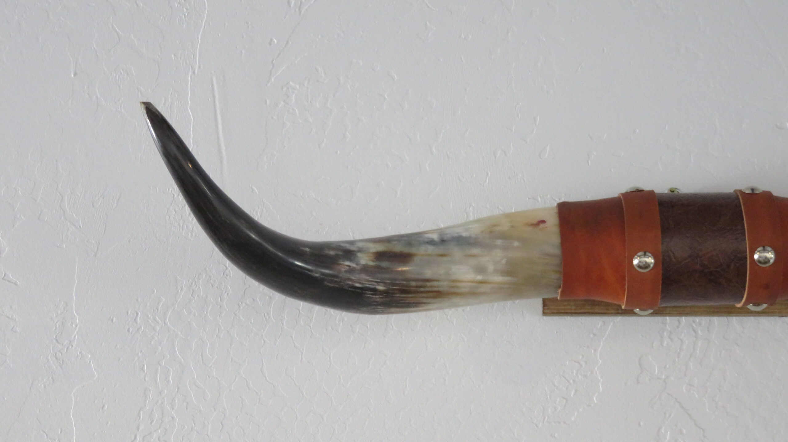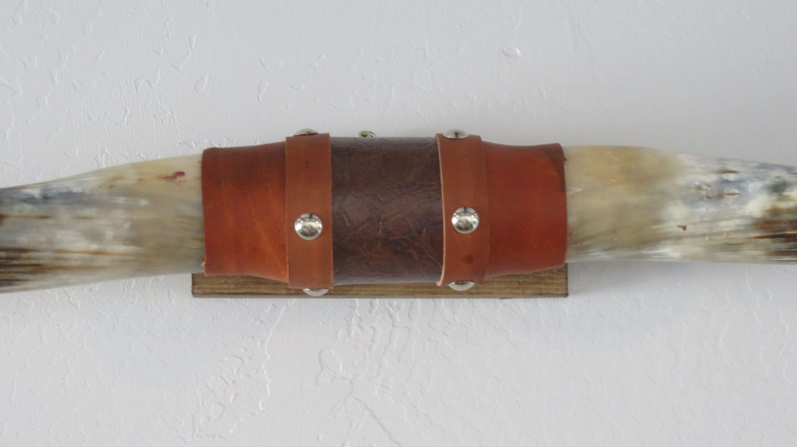 This set of horns is 29 1/2″ wide (measured at the tips) and classifies as “Small”. Finish is brown leather with studs (see photos).