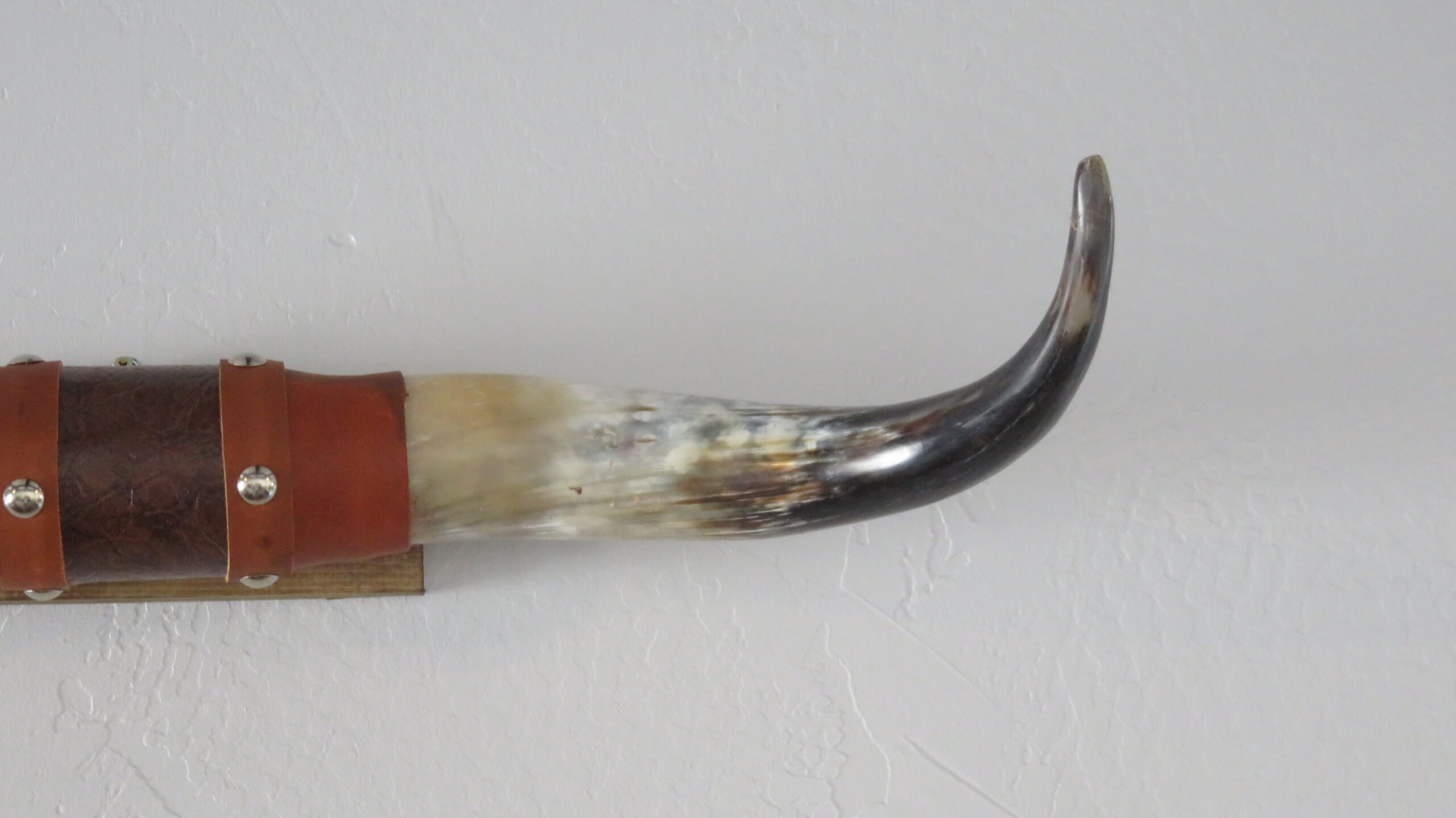 We have just picked up a great group of Texas Longhorns from Ft. Worth, TX and are proud to offer these to our clients. Each set is finished with genuine leather wraps and polished horns on a plaque with a hook for hanging. Great items for display in the lodge, cabin, mancave or office. They come in a variety of sizes and finishes. Some have studs/tacks that accent the leather and others do not. Leather can be black, brown or cowhide with the hair on. So take a moment to look at each variety. The one you see pictures of and purchase, is the one you will receive. These are NOT stock photos.