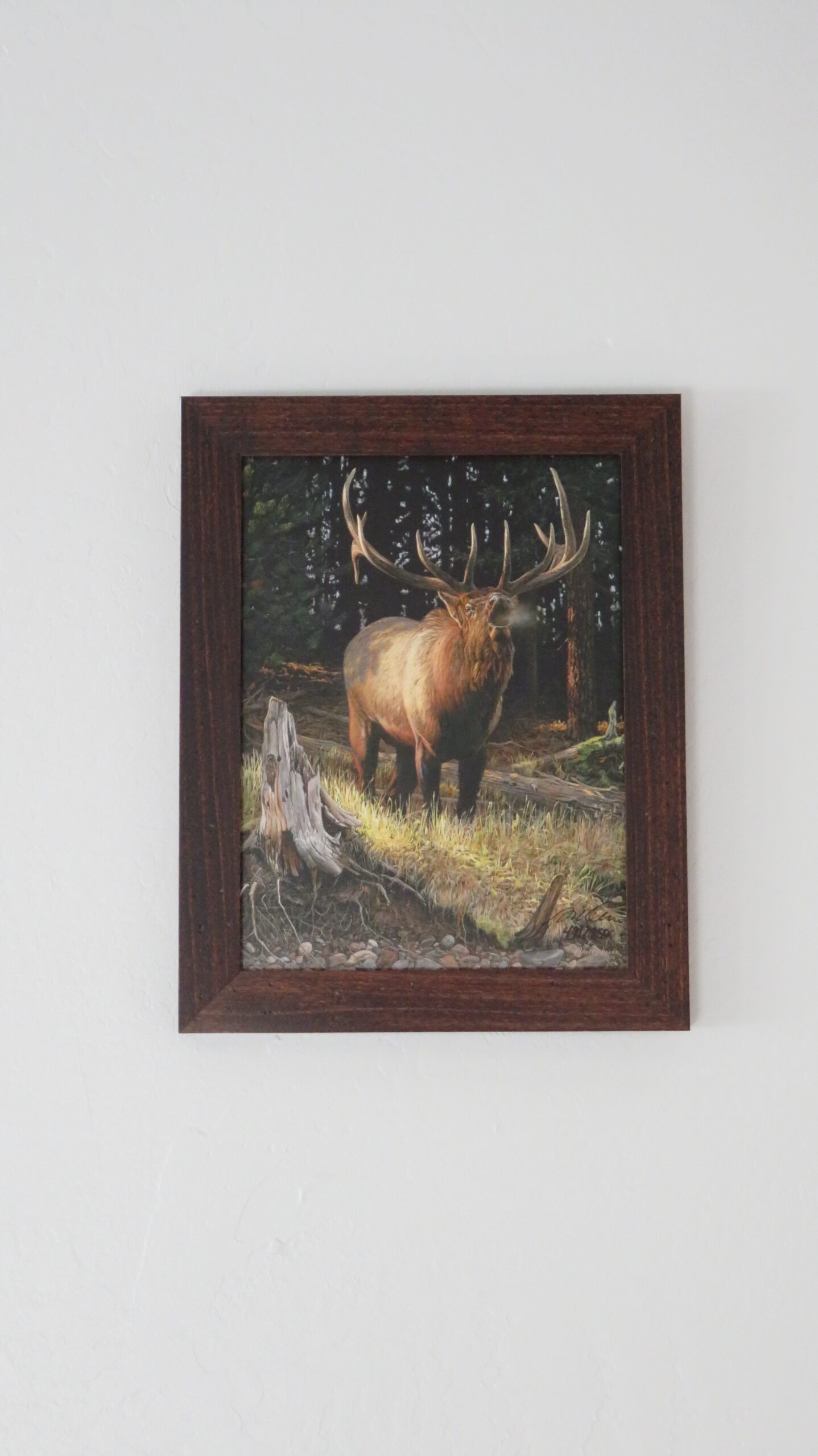 Here is a great looking, limited-edition canvas print done for the Rocky Mountain Elk Foundation (RMEF). Titled “The Challenger”, artwork depicts a large bull elk bugling in the woods. Print is signed and numbered by wildlife artist Bruce Miller. #471/850. Item comes with a dark wood grained frame.