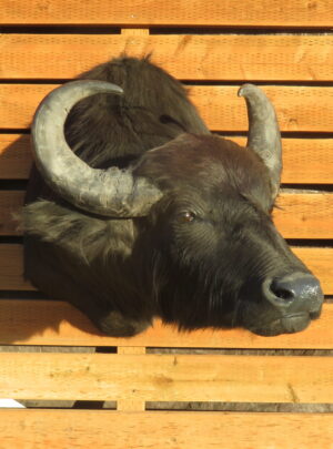 This is a great looking African Buffalo taxidermy mount. Pose features a “sneak” look with head turned slightly to the left looking into the room. A clean coat with a light (almost tan) ranging to a dark brown hair that gives a distinct look to this forest buffalo mount.