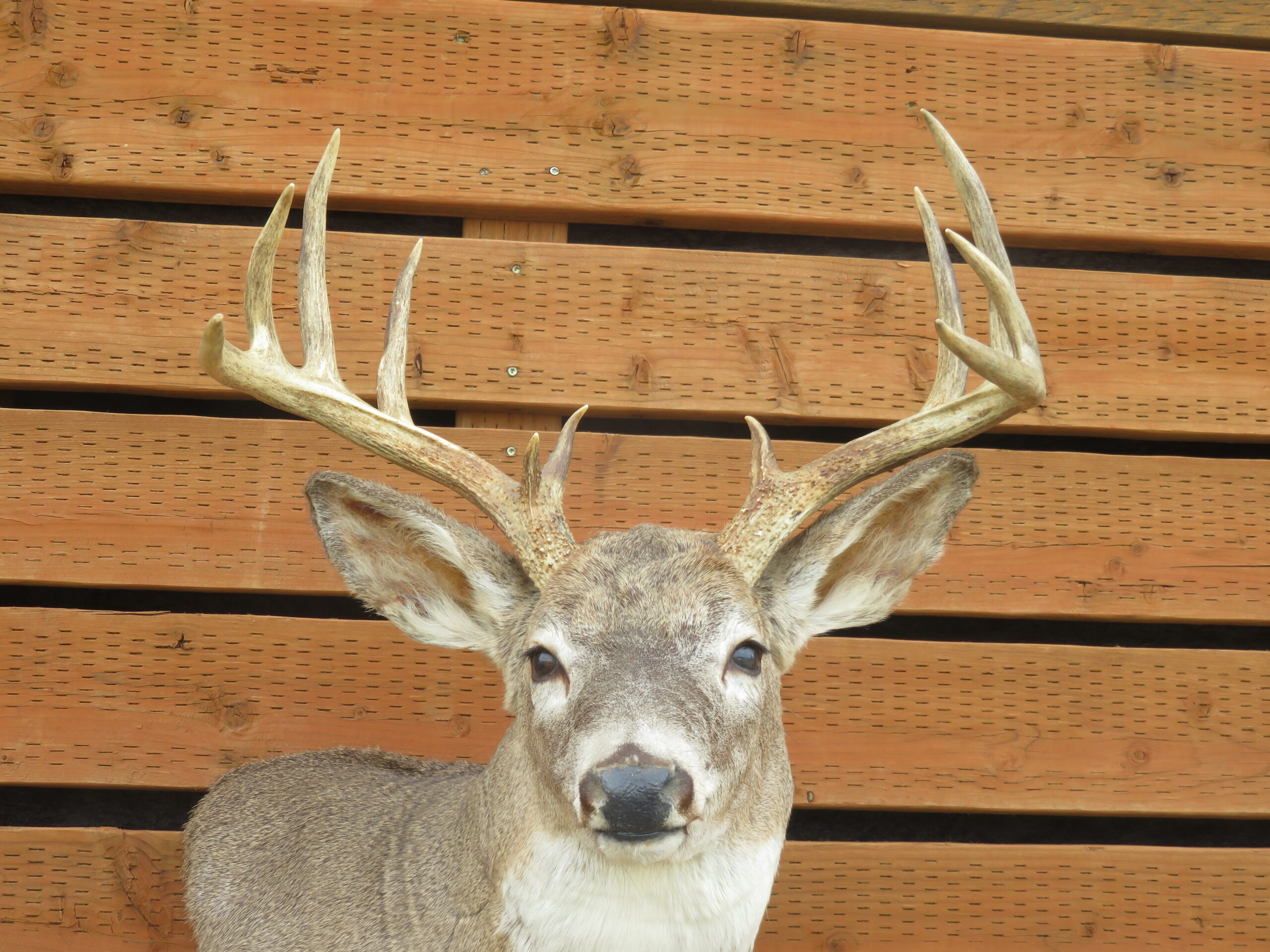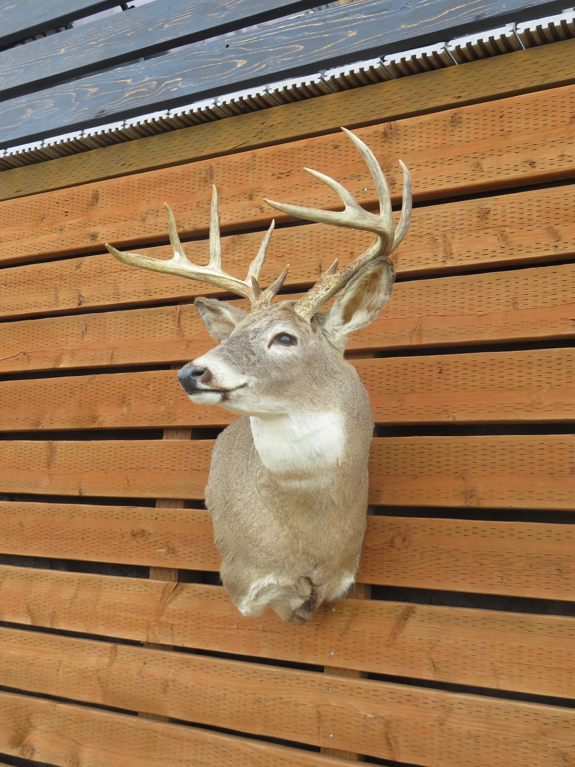 Here is a beautiful Whitetail buck with a pedestal finish and nicely turned head pose. Great rack with an extra eye-guard on the right side that completes an otherwise symmetrical set of antlers. Nice spread with 18″ between the main beams and an outside measure of 19 6/8″. Overall rating of “Premier” for quality and appearance on this taxidermy item.