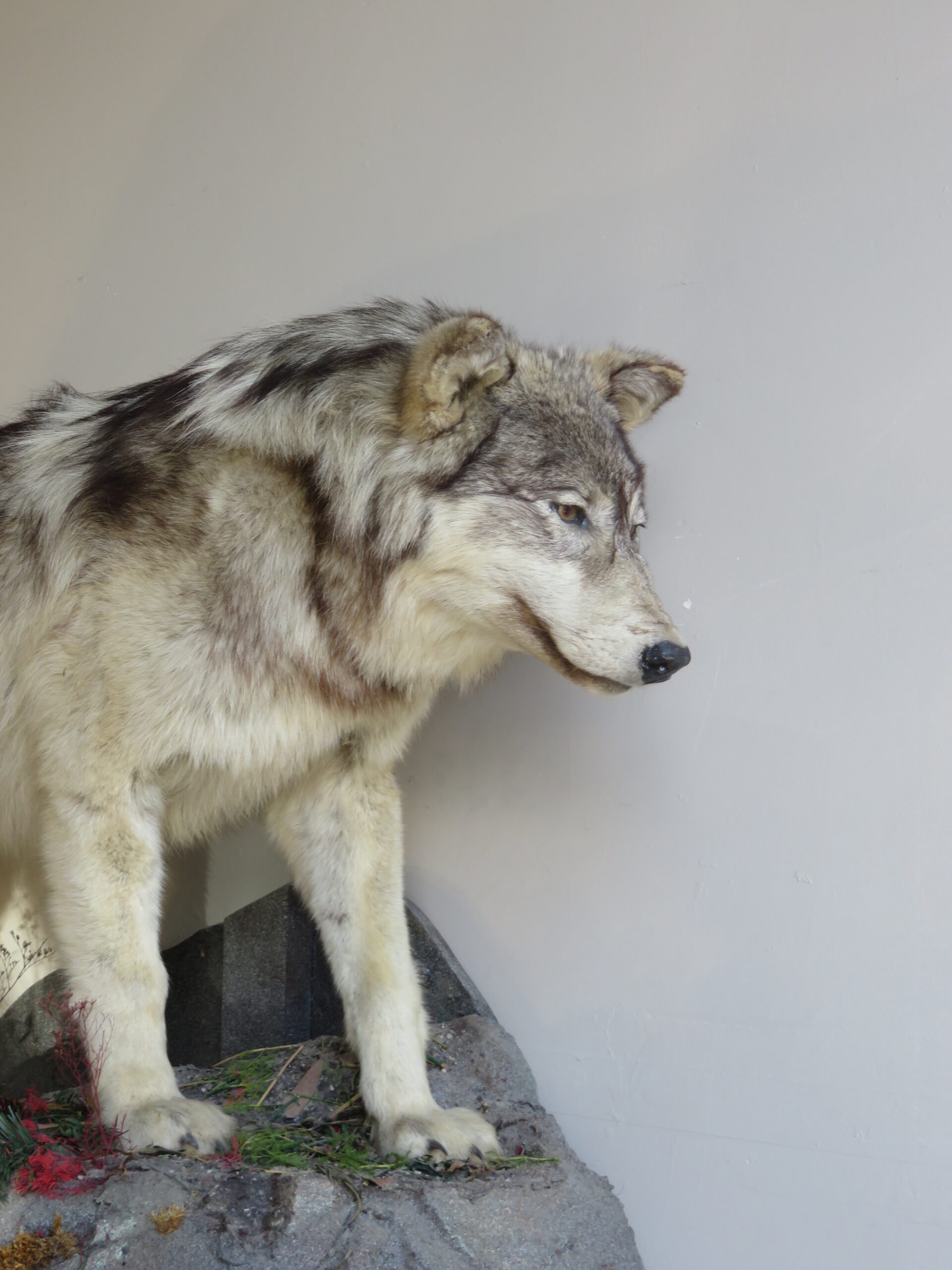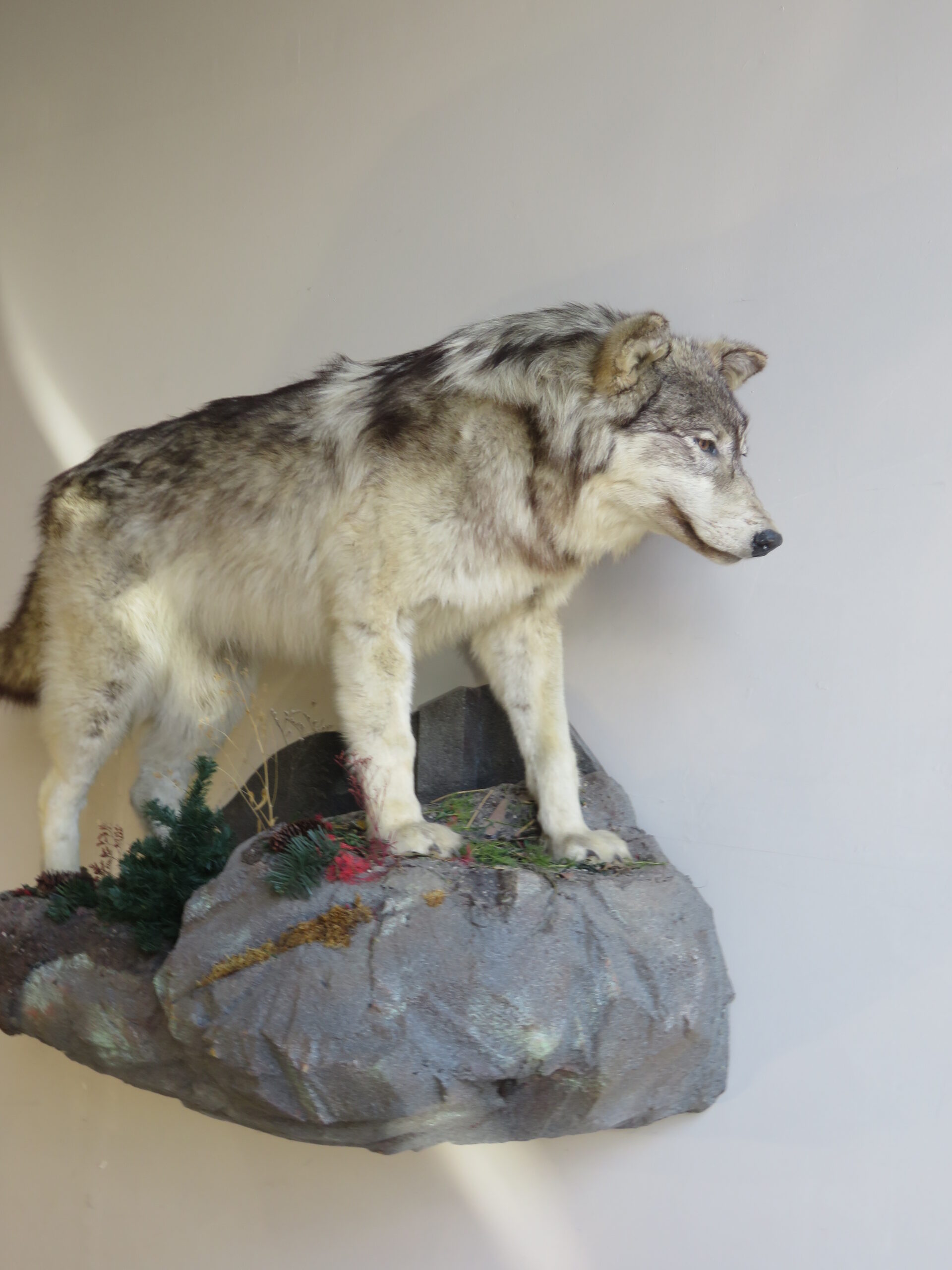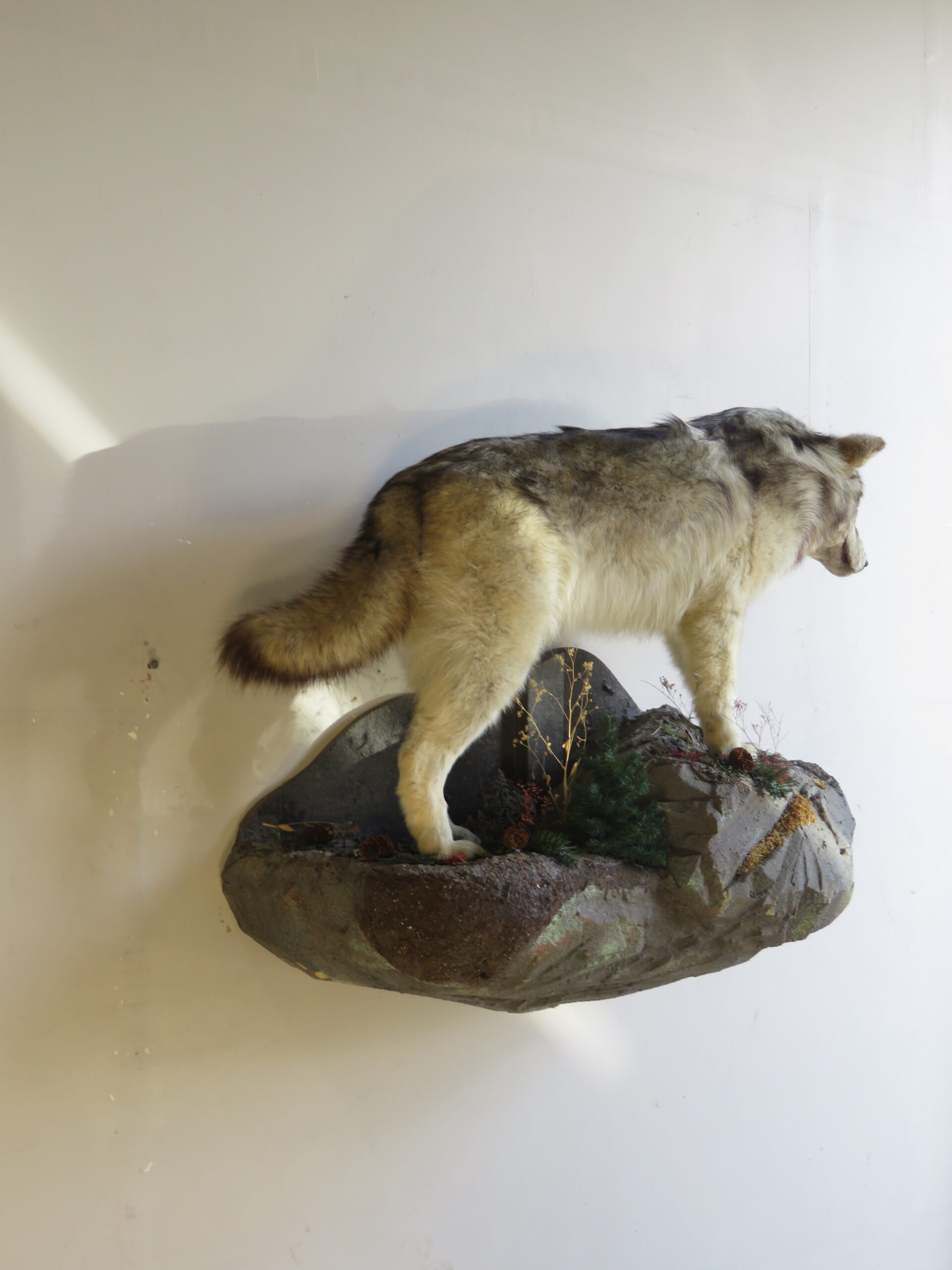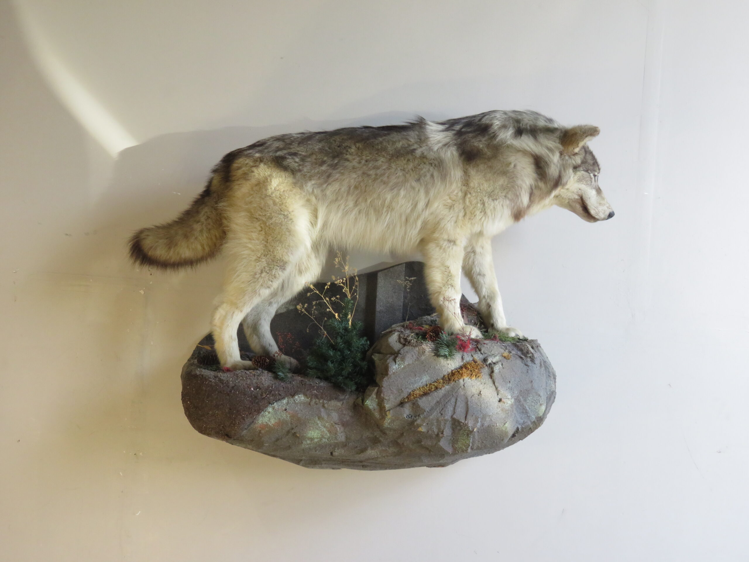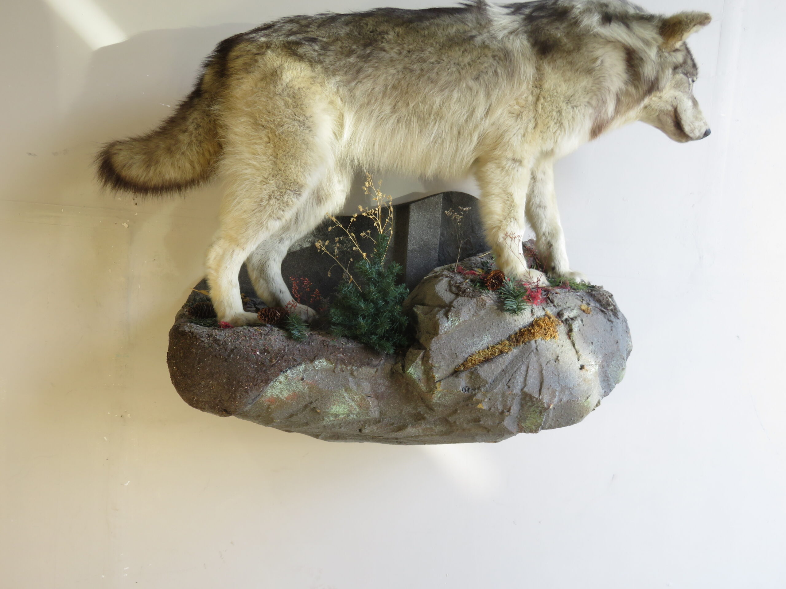 This is a great taxidermy mount for a collector of North American predators. An adult sized wolf mounted on a terrain base that is a wall hanger. Wolf coat exhibits a gray and white mix that is a common coloration for the species. Terrain base displays a great mix of rock and vegetation. Life like pose with wolf looking forward and slightly down. Movement is from left to right across the room. Overall product rating is “Premier” for this mount and base.